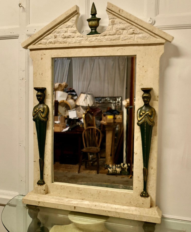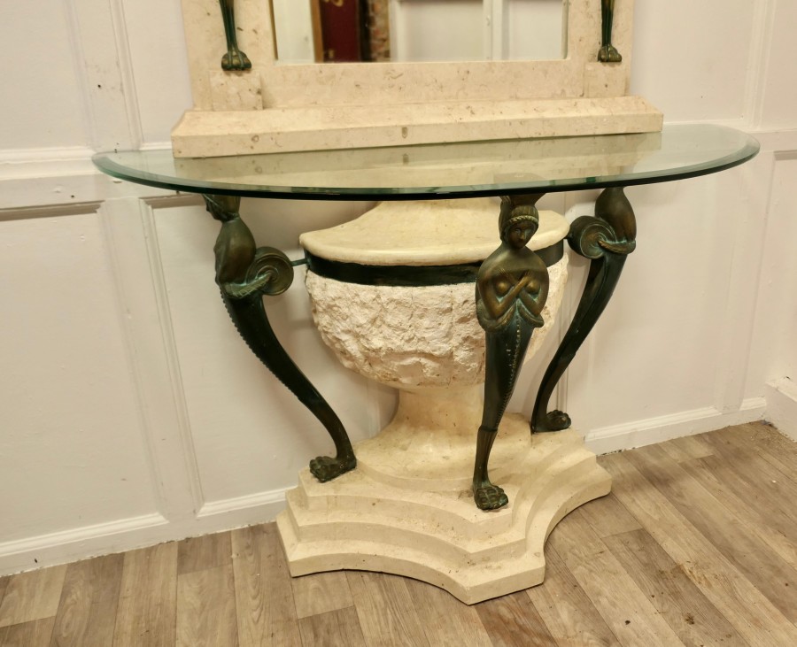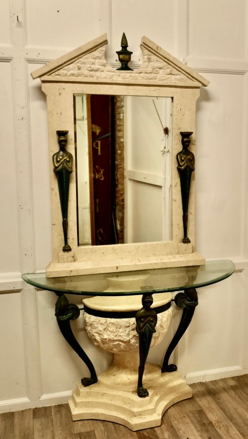 Italian Classical Style Console Table and Mirror Set This is a very unusual piece it is finished in simulated marble and bronze and is designed to look like a Roman doorway The table top is a Demi lune shape in glass with bevelled edge A really attractive set in good vintage condition with no faults The table is 30” tall, 47” wide and 20” deep, the mirror is 49” tall TZX404 Manufacture Date : 1970 Materials : Resin