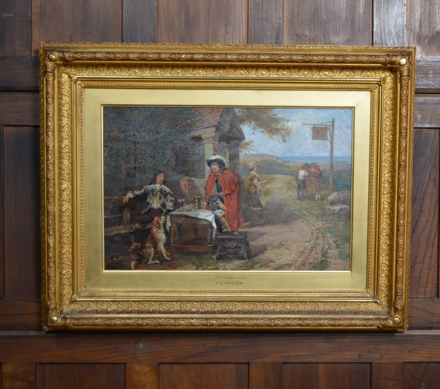 Superb oil painting by J. E. Waller signed and dated 1885. Named ‘The Cavaliers Rest’ this oil on canvas depicts 2 cavaliers having a drink outside an inn with a bar maid and stable boy attending a horse in the background. The gilded frame has a few imperfections (shown in photos) however the painting is in excellent condition. A fantastic painting that will look striking on any wall.