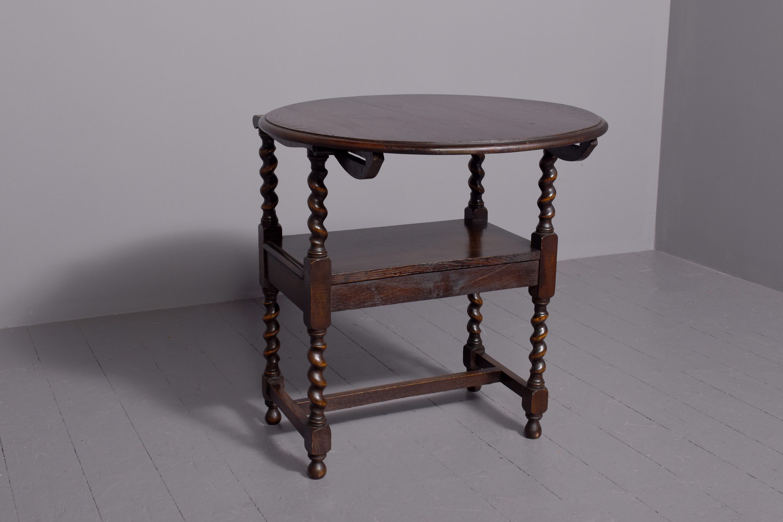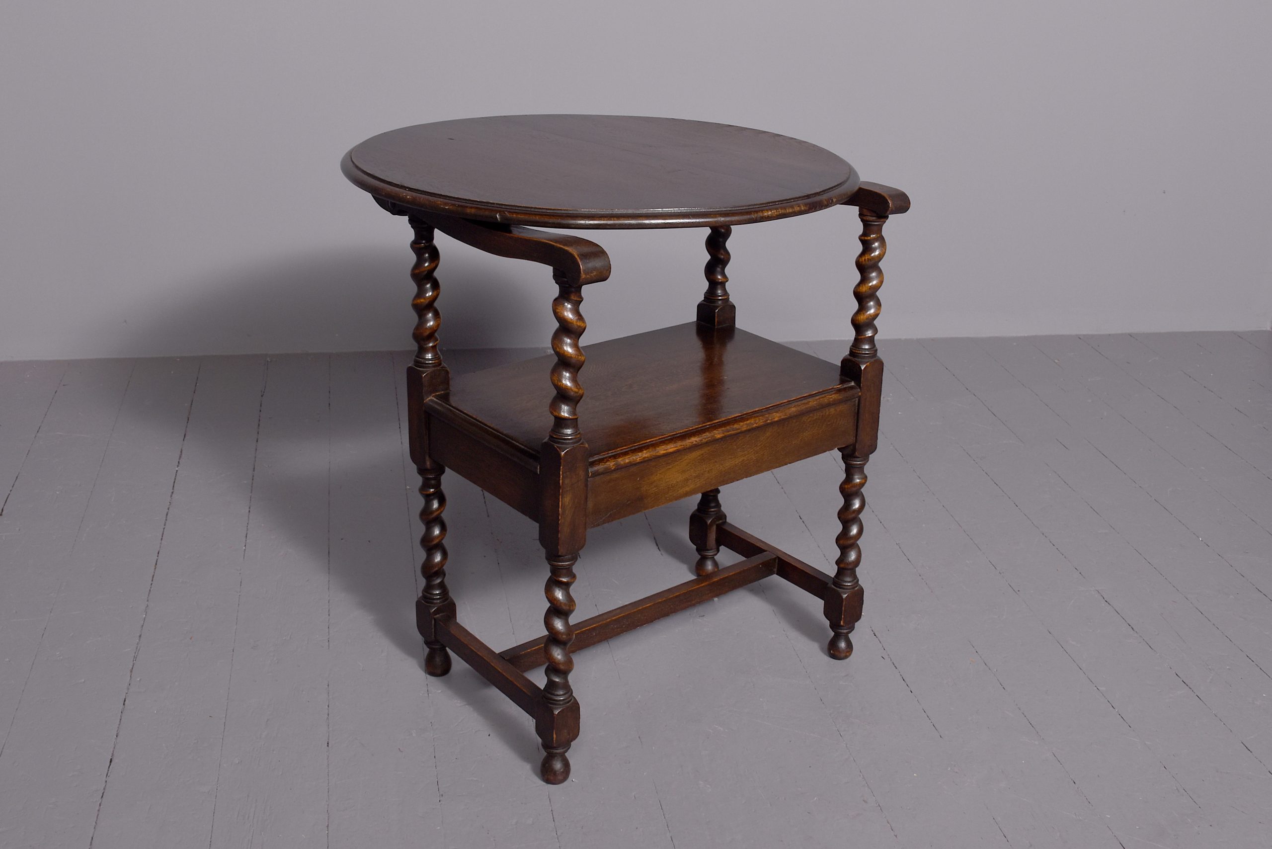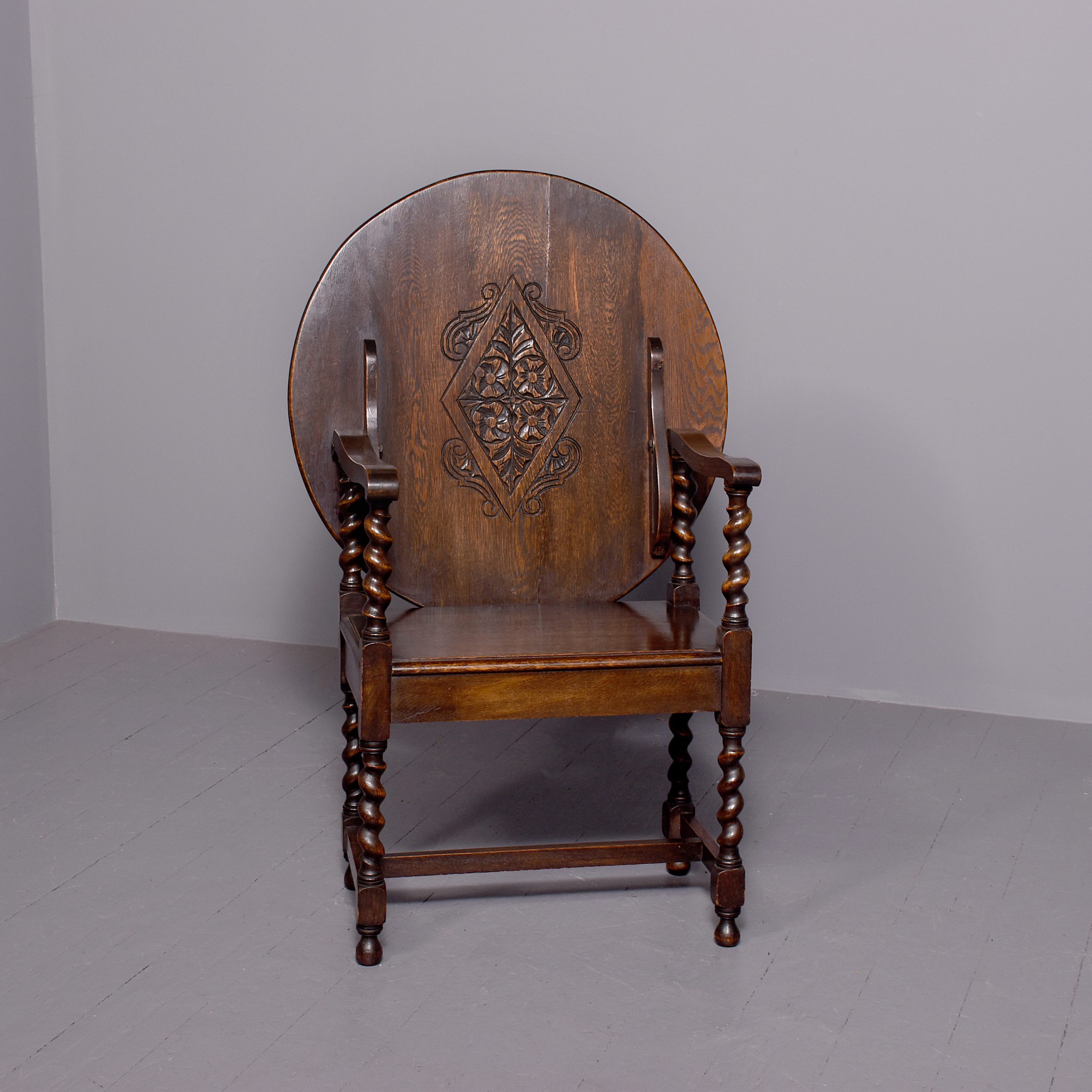 Circa 1900. Jacobean style folding-top oak single seat monk’s bench. The circular top with Jacobean carvings on the inside, swivels on the arms of the chair to form a hall table. The arms supported on barley twist columns to a solid seat with moulded fore-edges and a simple seat rail on barley twist legs connected by an H-stretcher