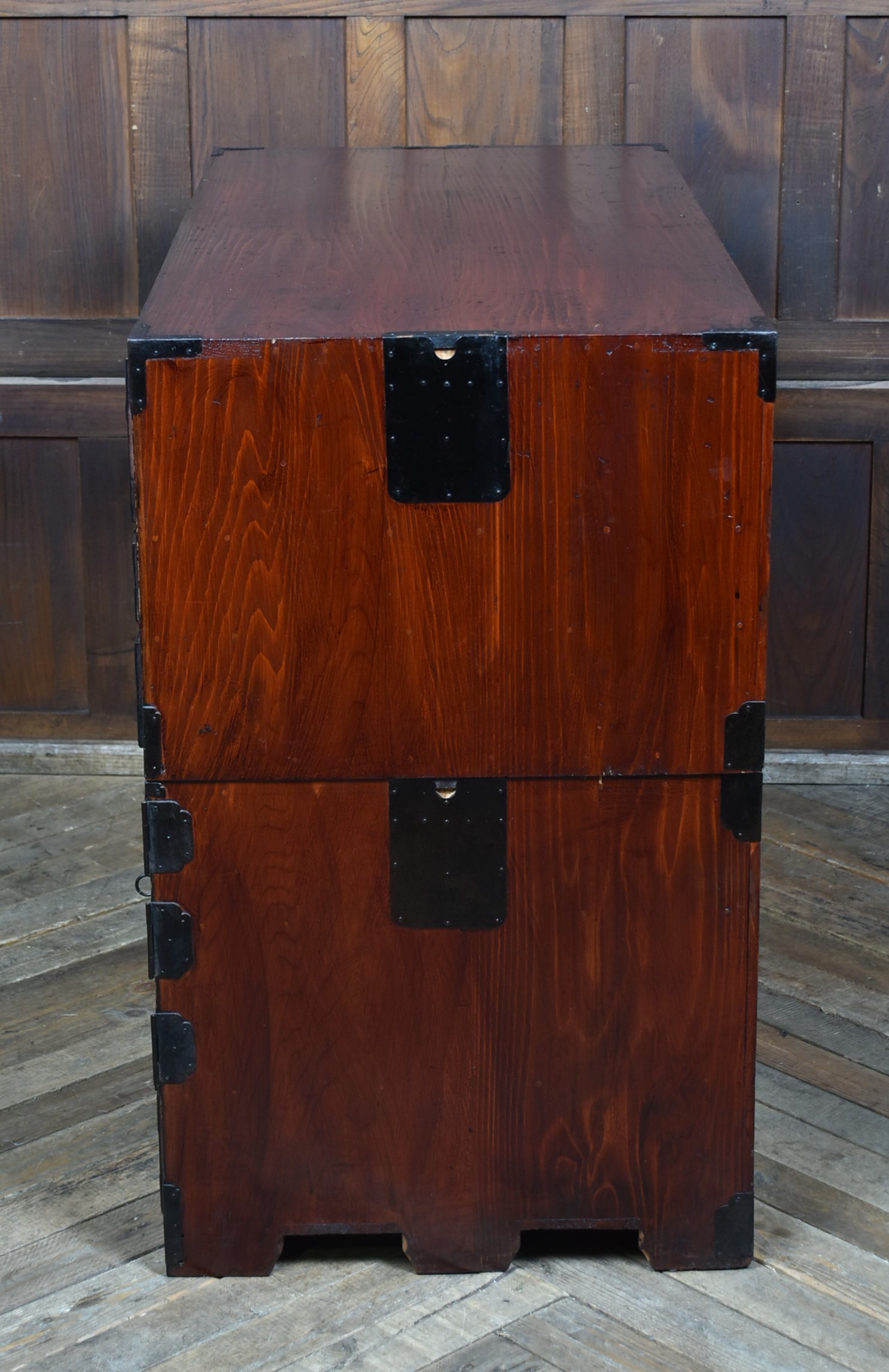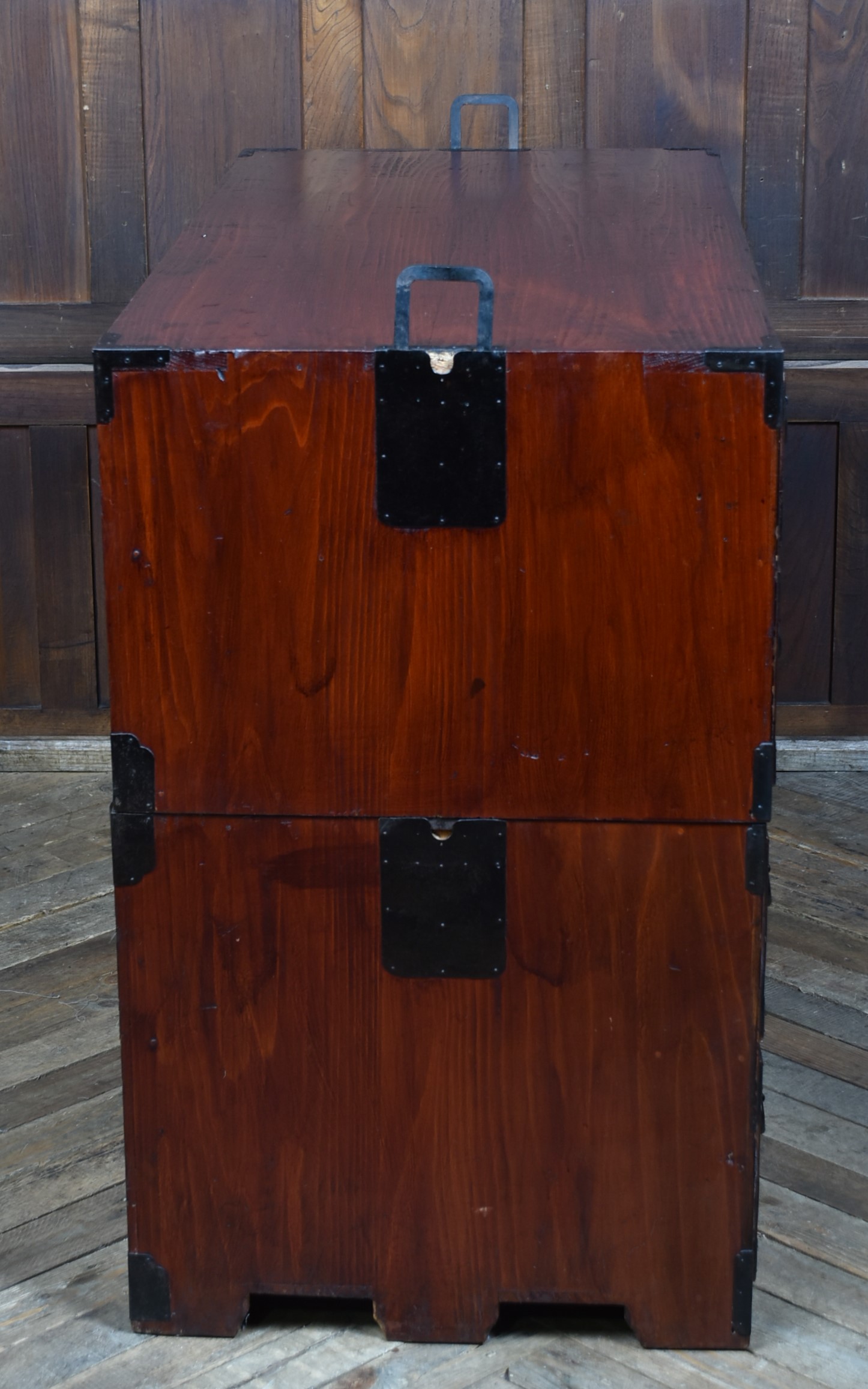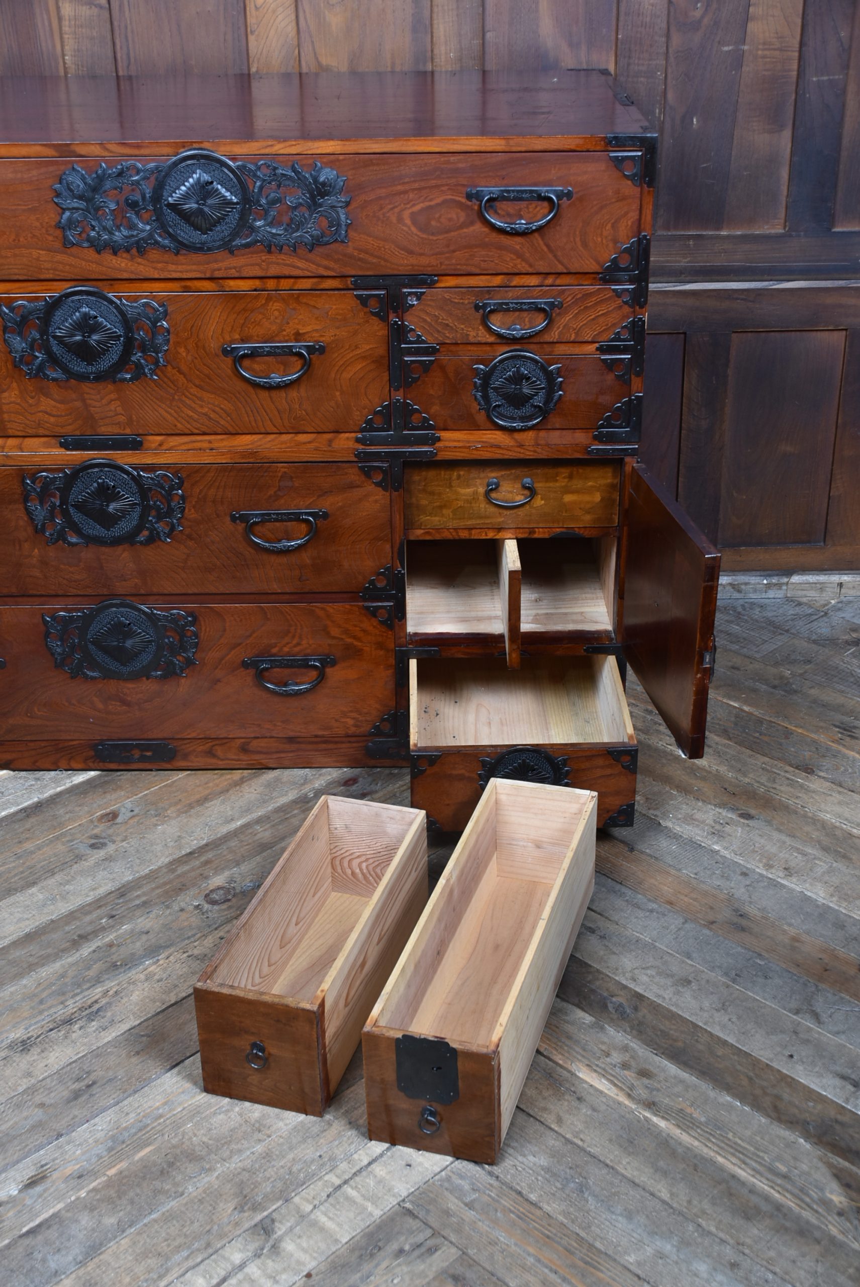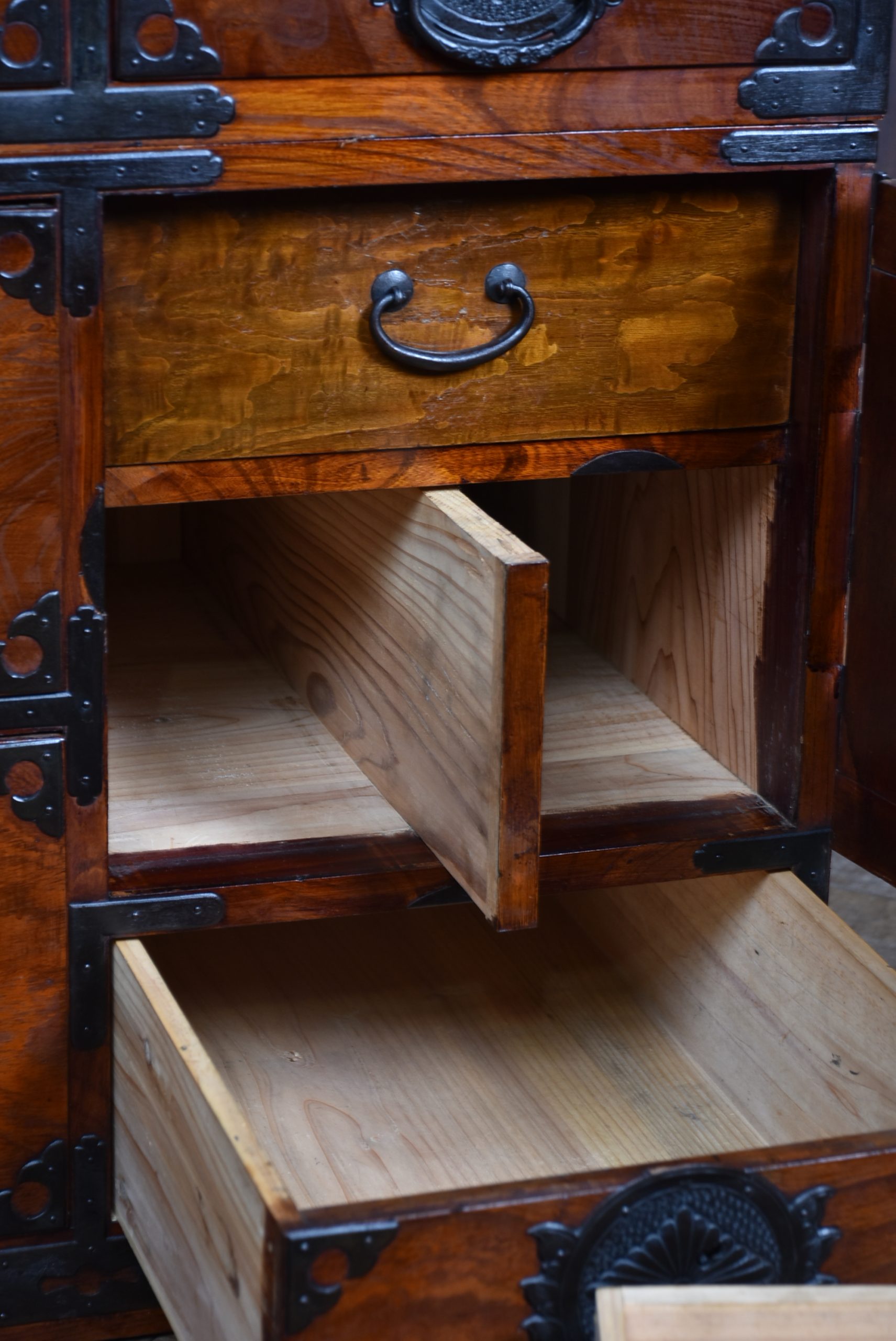 A fantastic Japanese Tansu chest in original condition, crafted from richly grained cedar and adorned with traditional iron hardware. This two-part chest features multiple drawers and compartments, each fitted with ornate black metal handles and decorative mounts showcasing circular and floral motifs. The ironwork is all original, with side-mounted carry handles—one set designed to flip up and secure the upper section to the base. Over years of use, the chest has acquired subtle imperfections that only enhance its character and authenticity. A fine example of Meiji-period craftsmanship, it offers both aesthetic appeal and practical storage, making it a striking addition to any interior.