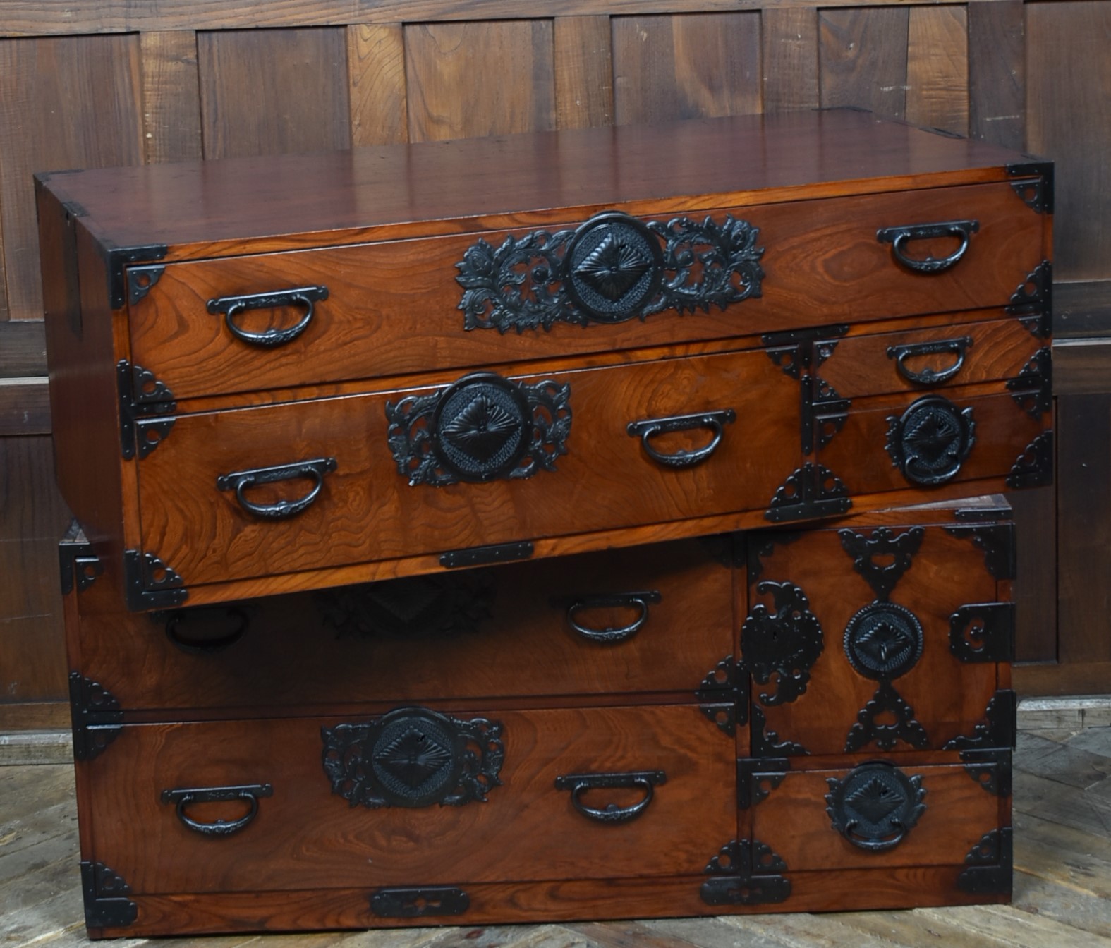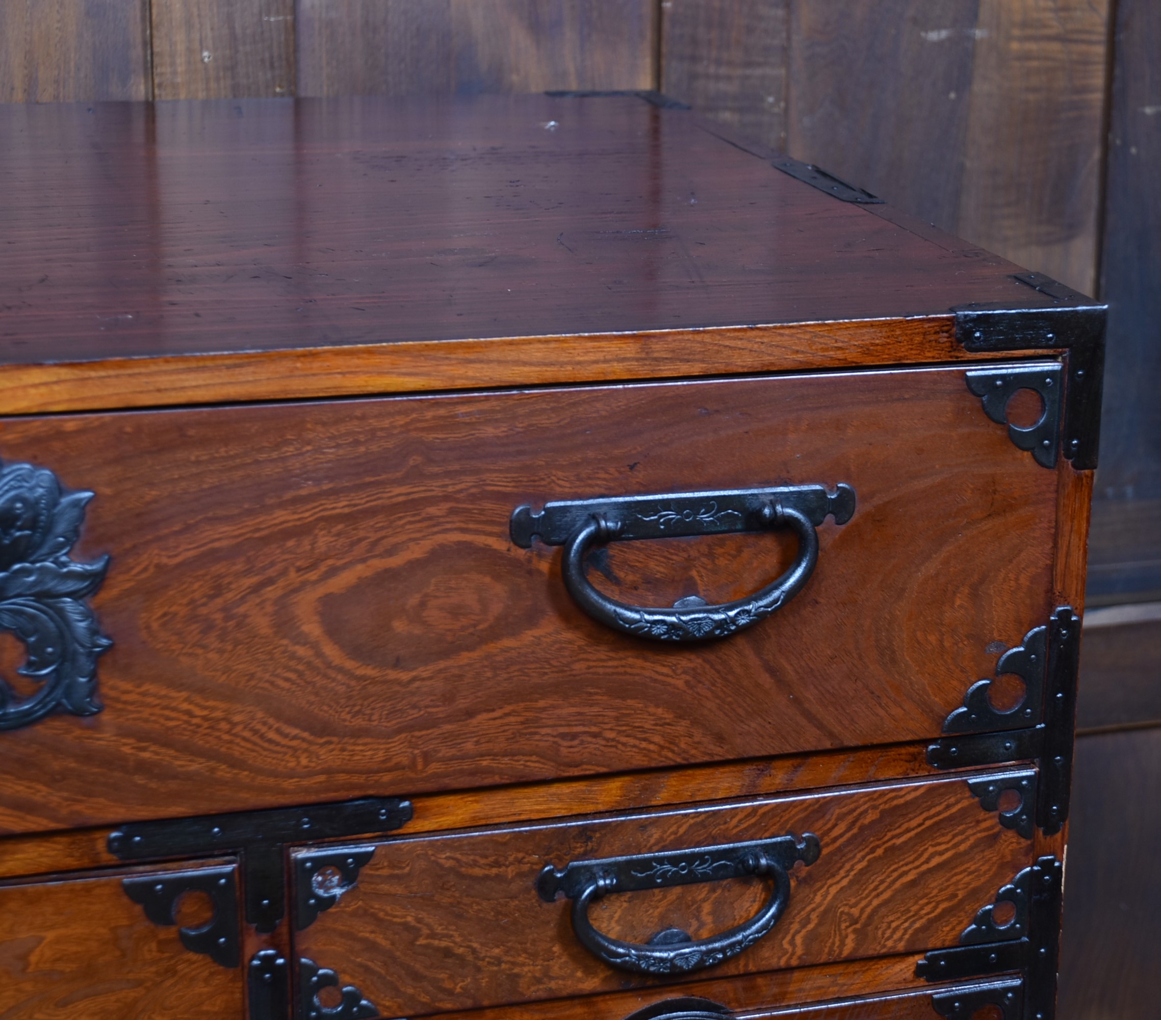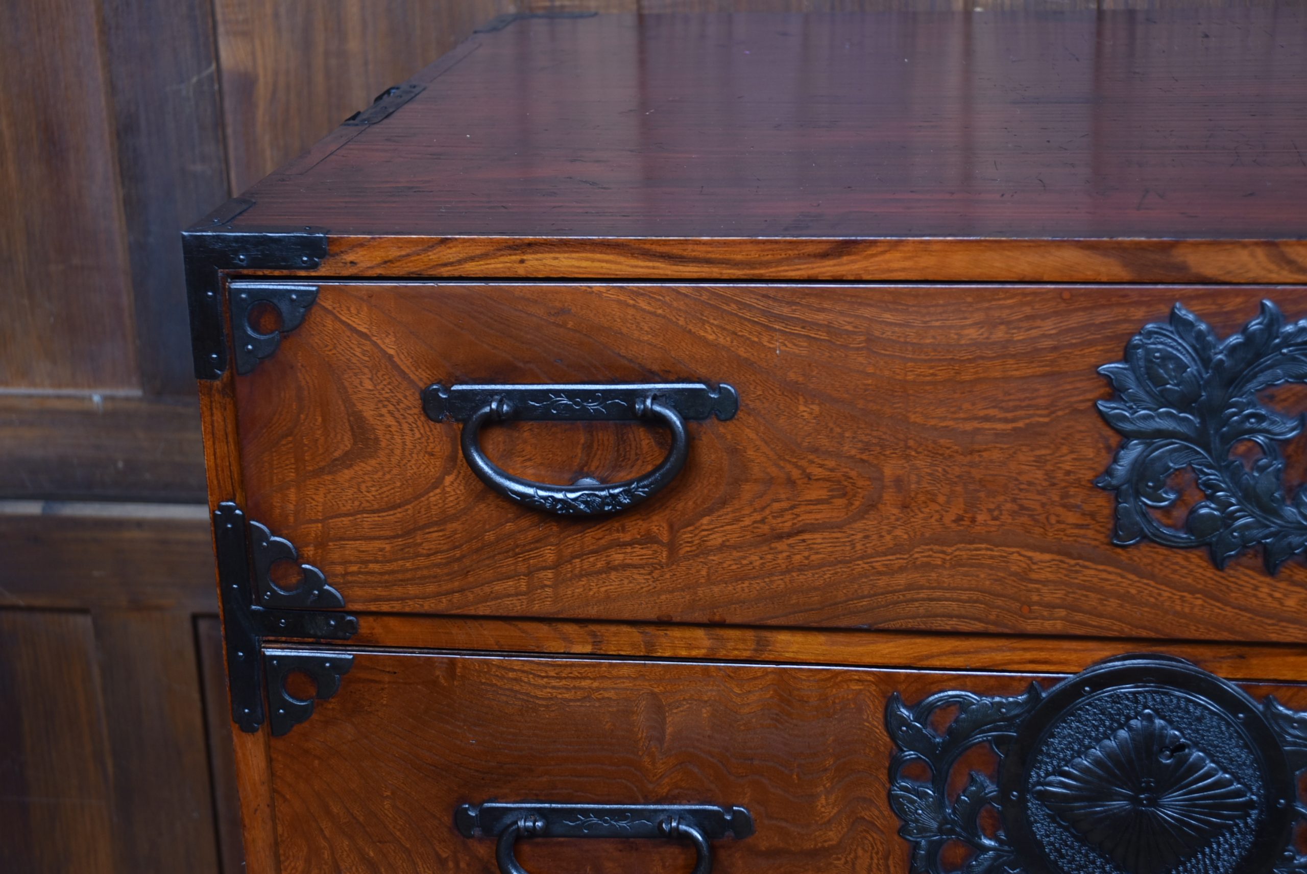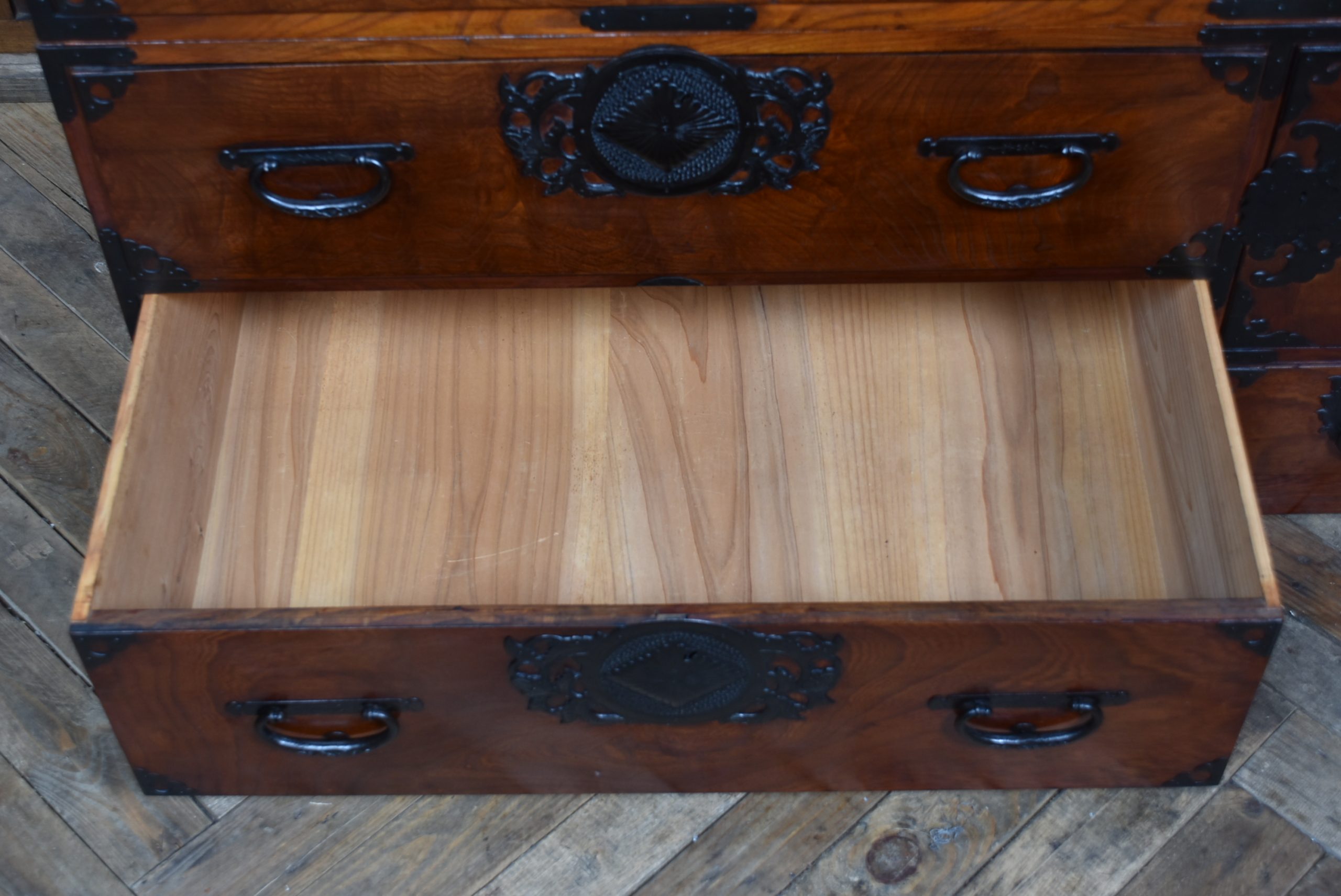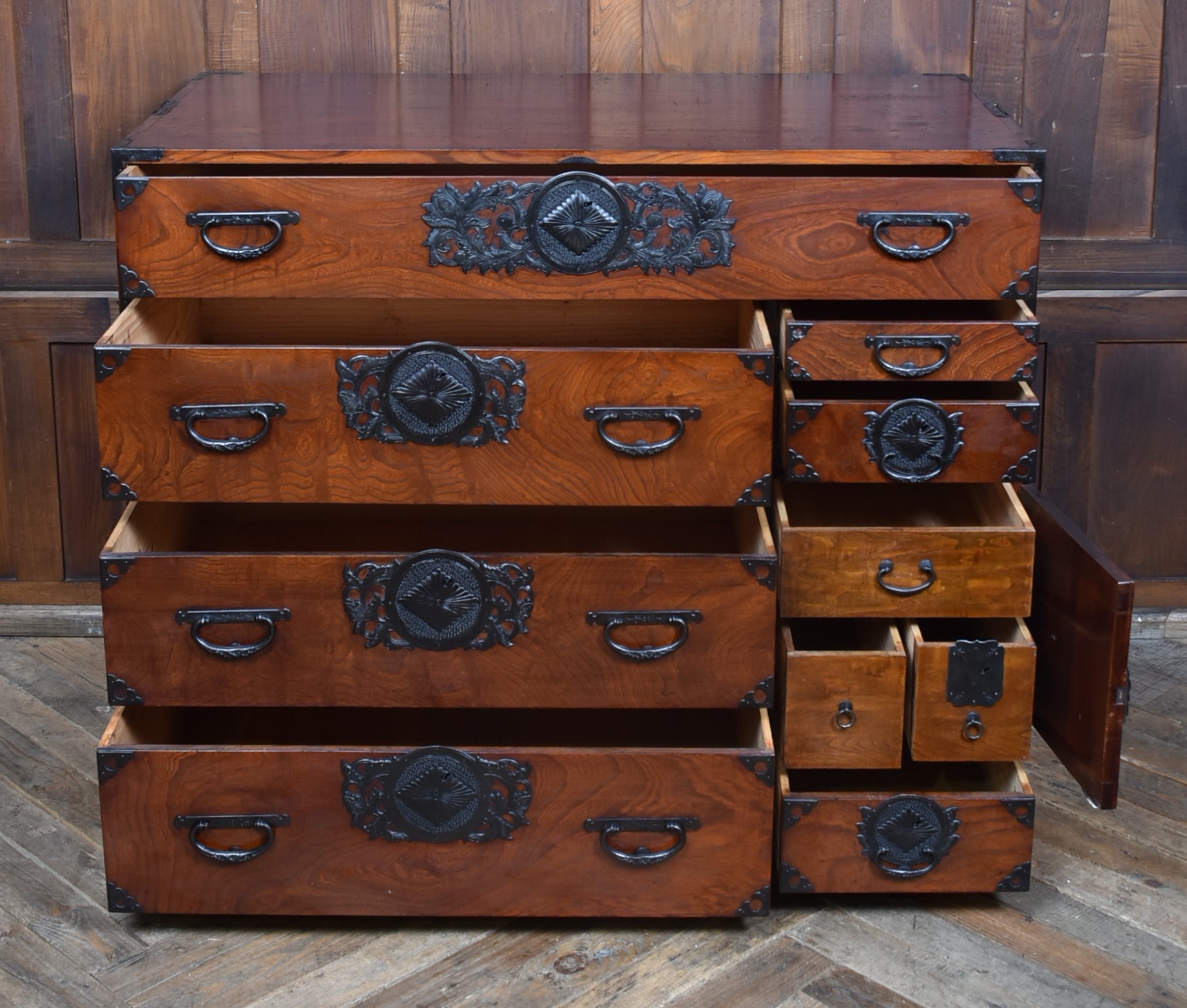 A fantastic Japanese Tansu chest in original condition, crafted from richly grained cedar and adorned with traditional iron hardware. This two-part chest features multiple drawers and compartments, each fitted with ornate black metal handles and decorative mounts showcasing circular and floral motifs. The ironwork is all original, with side-mounted carry handles—one set designed to flip up and secure the upper section to the base. Over years of use, the chest has acquired subtle imperfections that only enhance its character and authenticity. A fine example of Meiji-period craftsmanship, it offers both aesthetic appeal and practical storage, making it a striking addition to any interior.