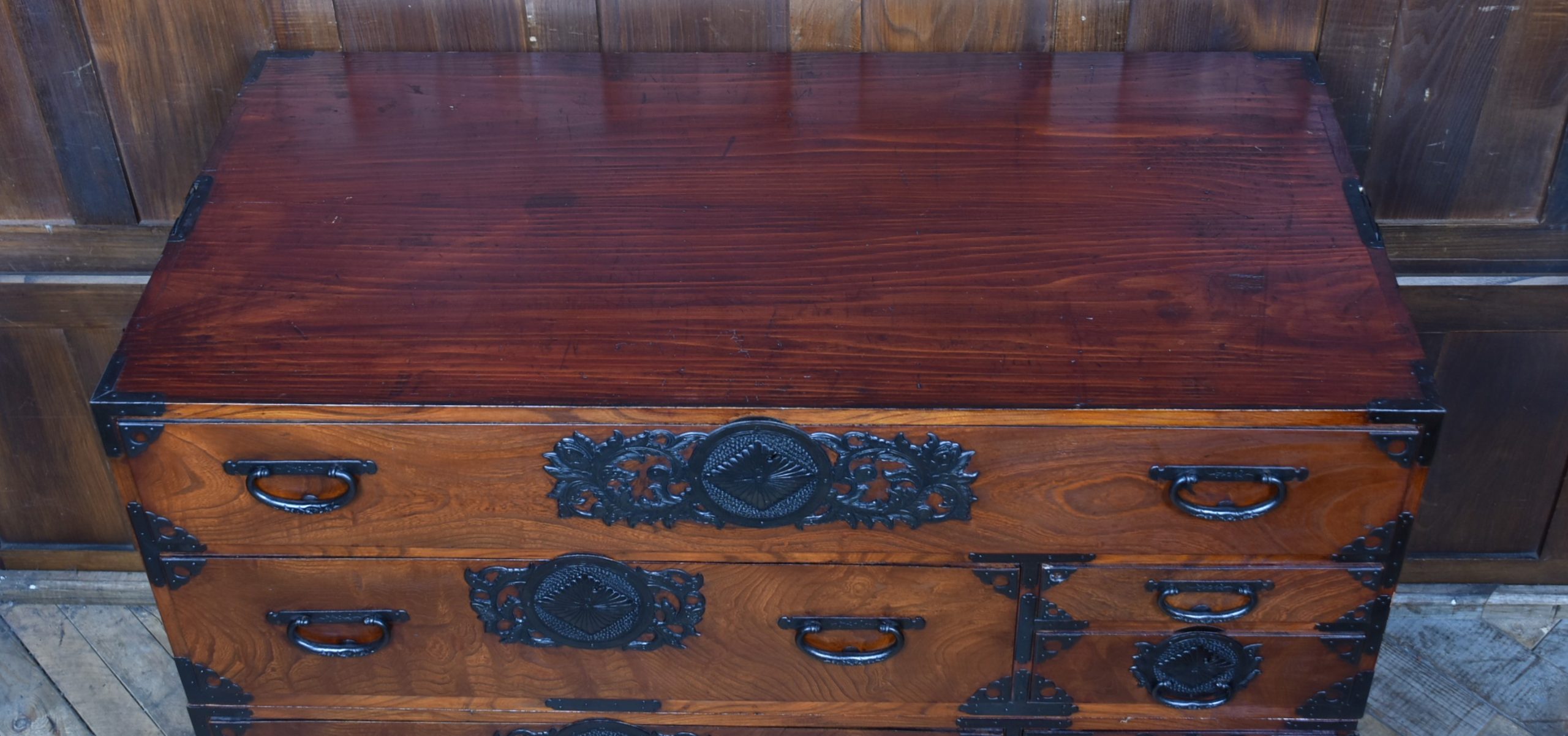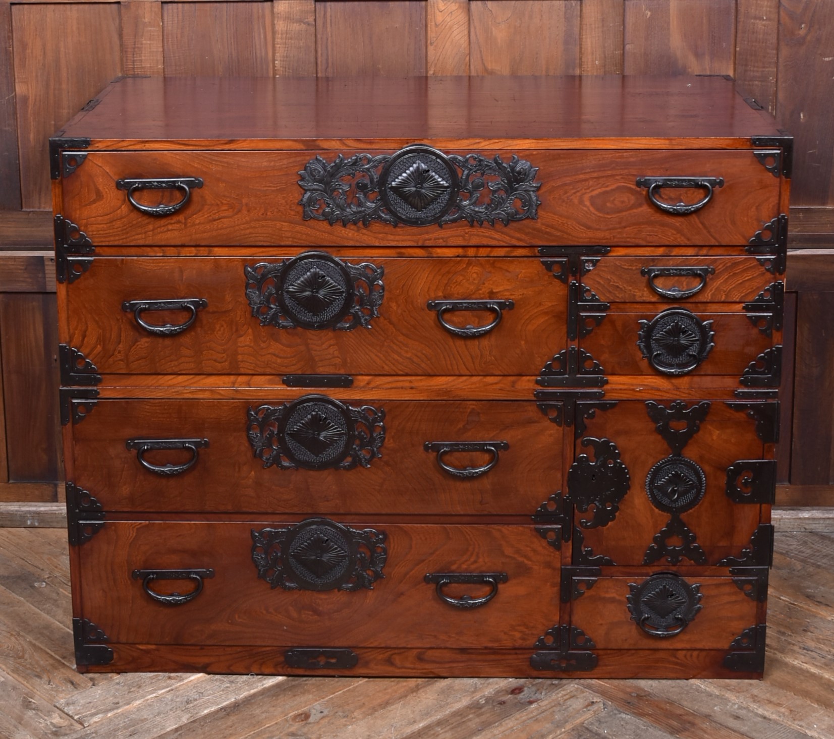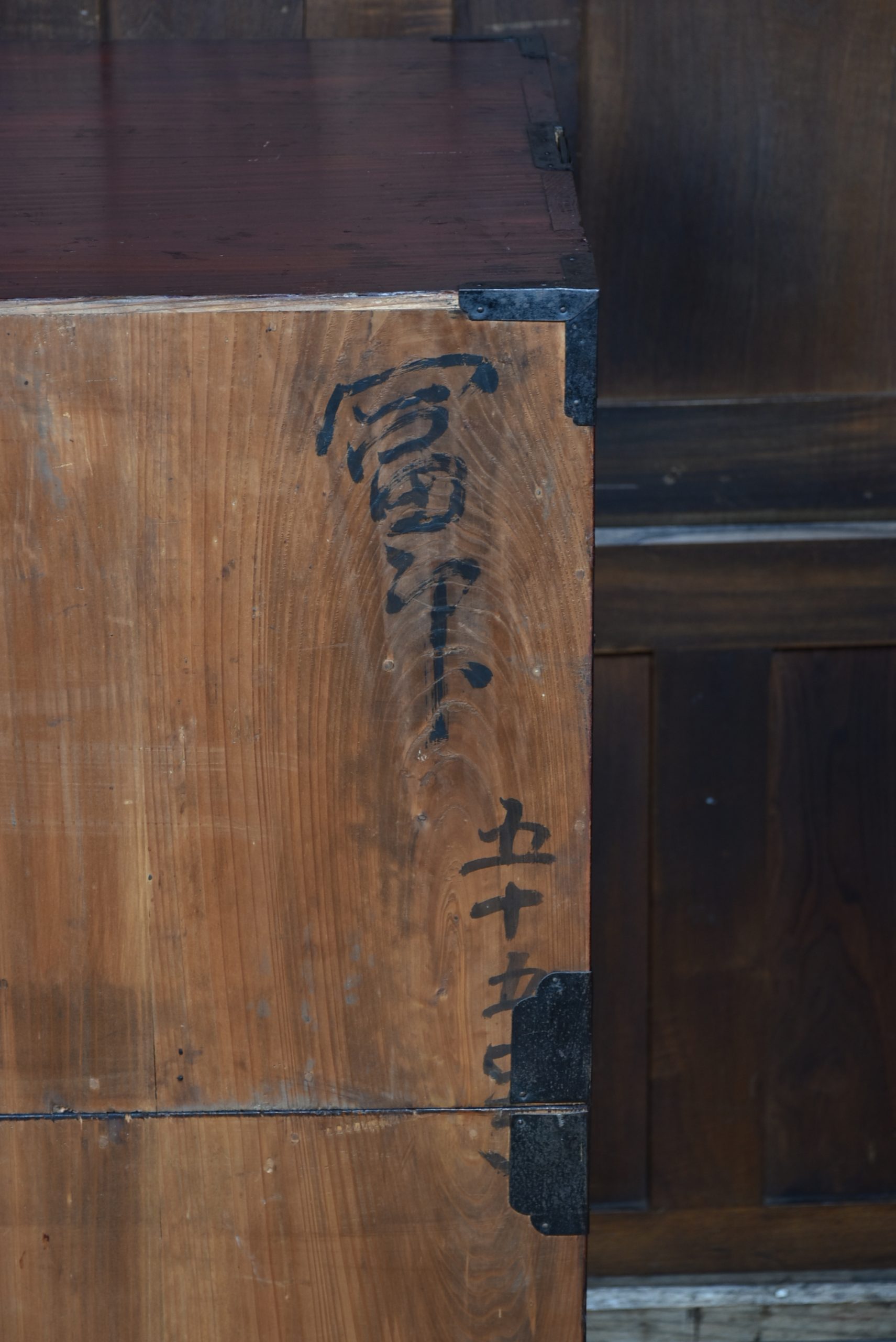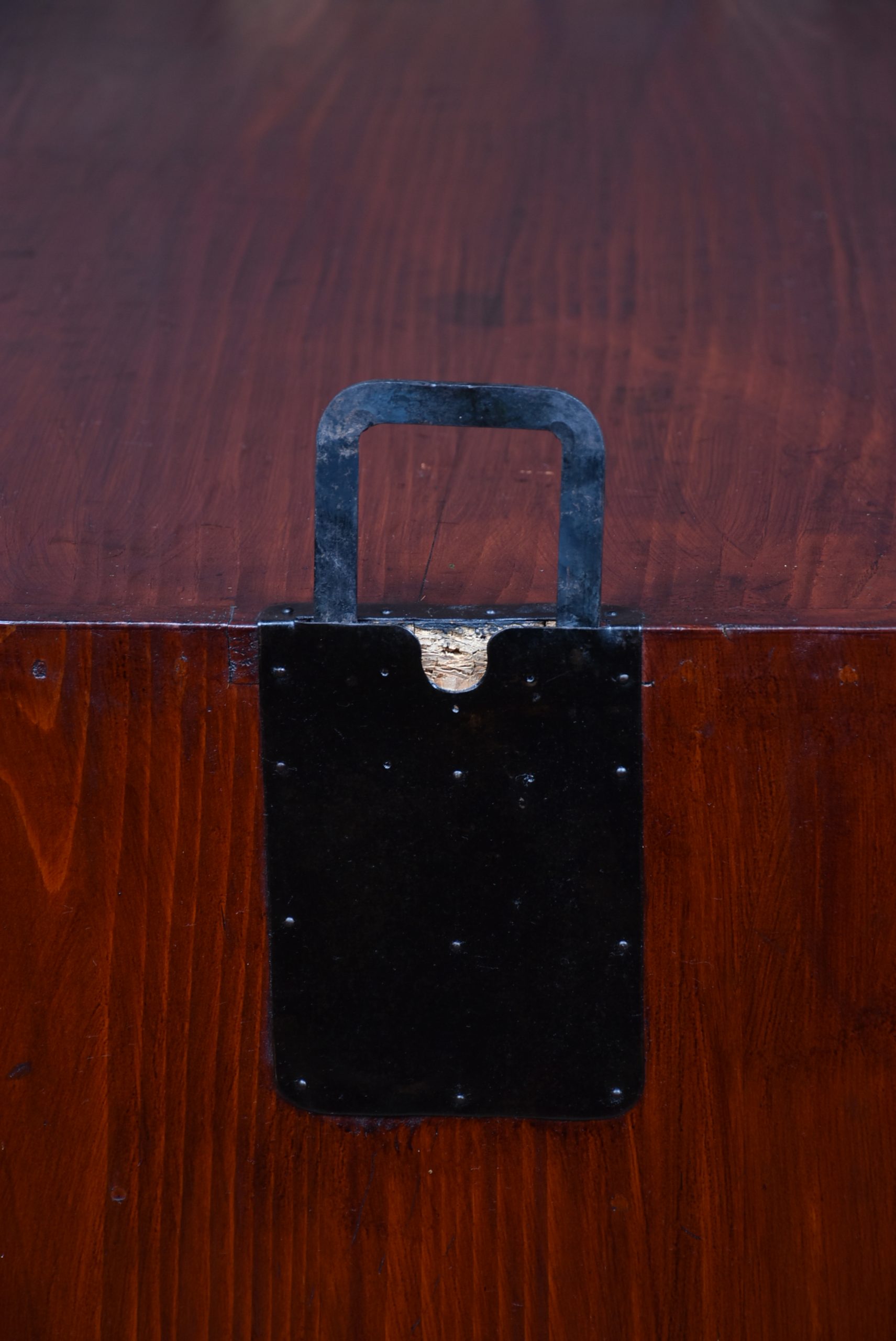 A fantastic Japanese Tansu chest in original condition, crafted from richly grained cedar and adorned with traditional iron hardware. This two-part chest features multiple drawers and compartments, each fitted with ornate black metal handles and decorative mounts showcasing circular and floral motifs. The ironwork is all original, with side-mounted carry handles—one set designed to flip up and secure the upper section to the base. Over years of use, the chest has acquired subtle imperfections that only enhance its character and authenticity. A fine example of Meiji-period craftsmanship, it offers both aesthetic appeal and practical storage, making it a striking addition to any interior.