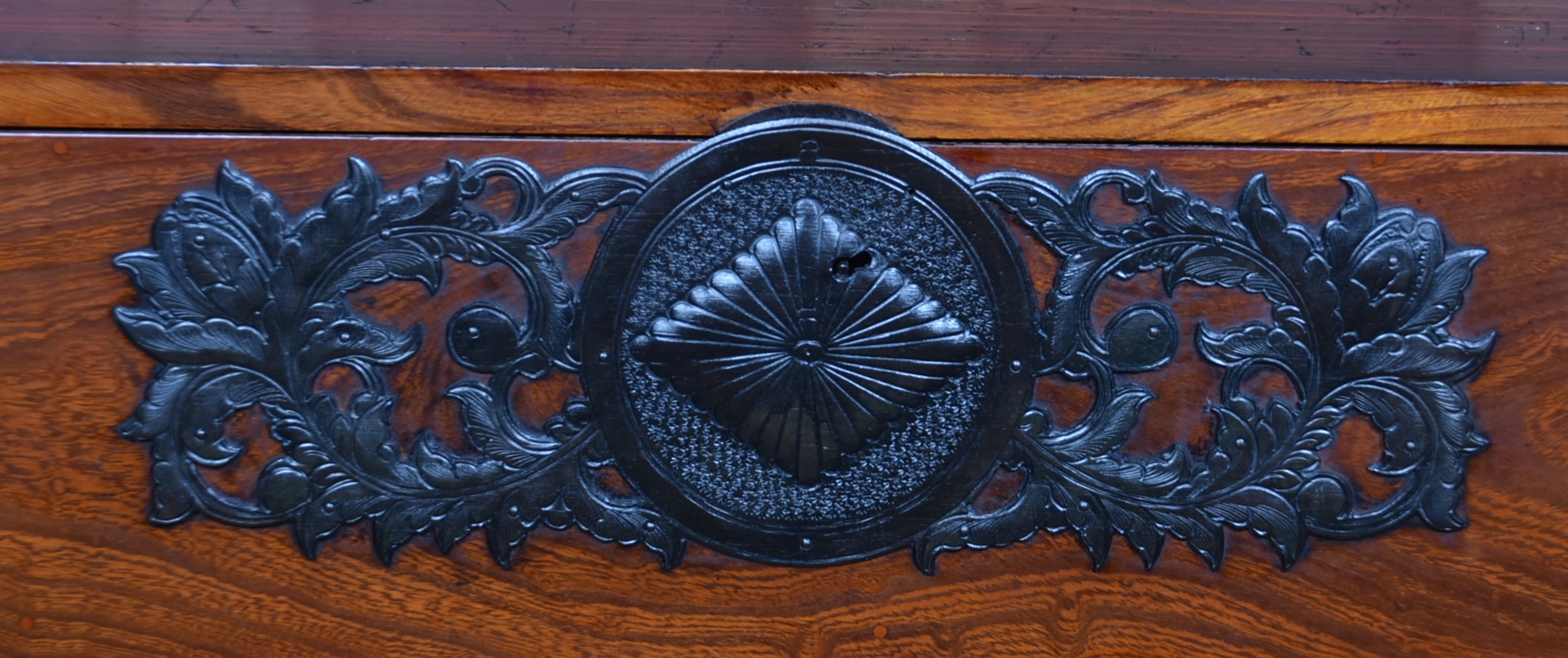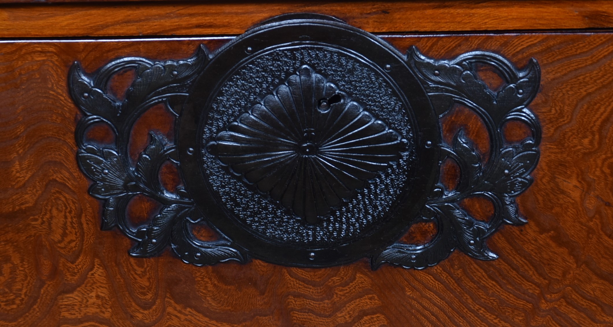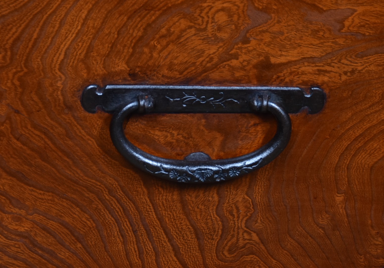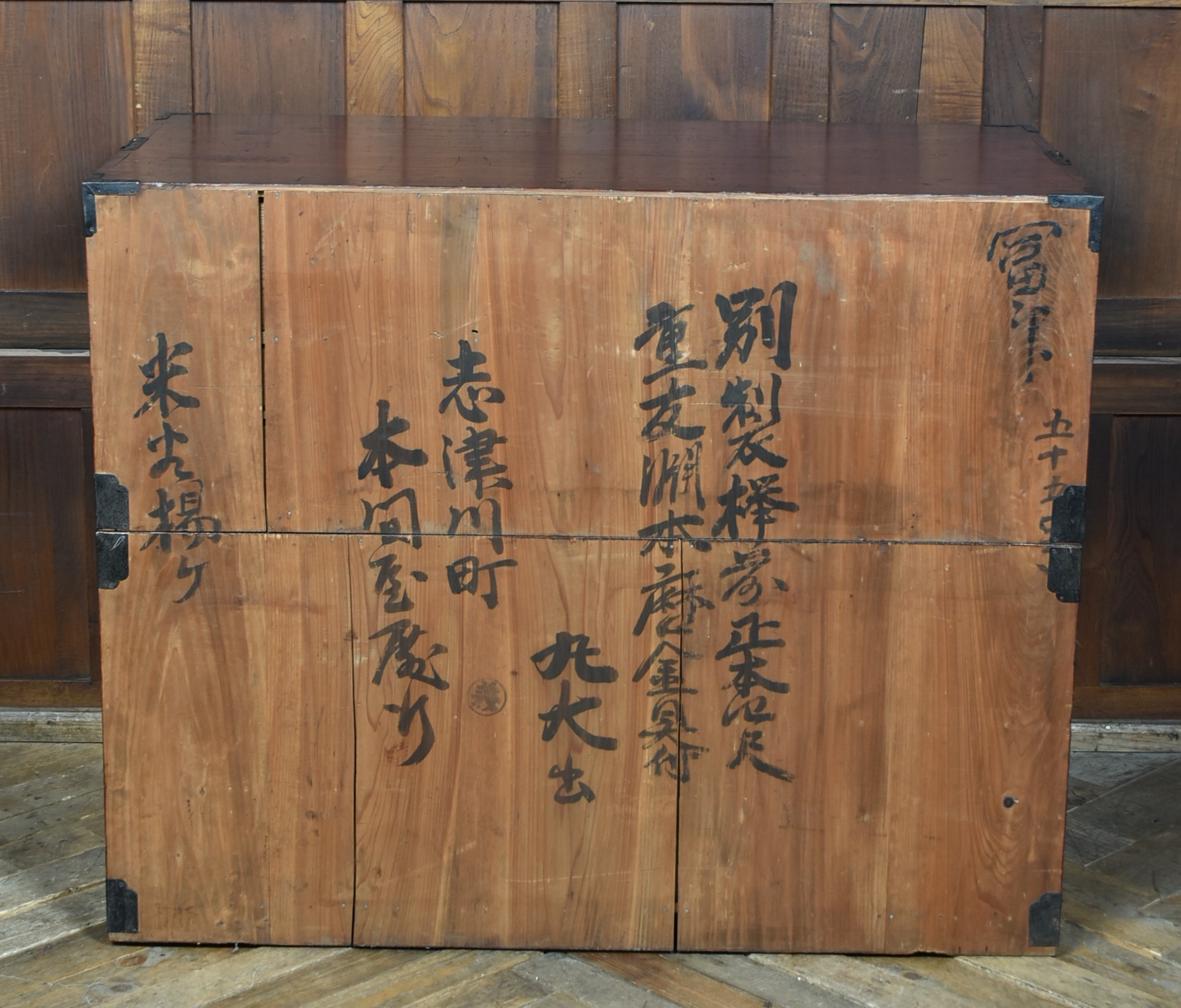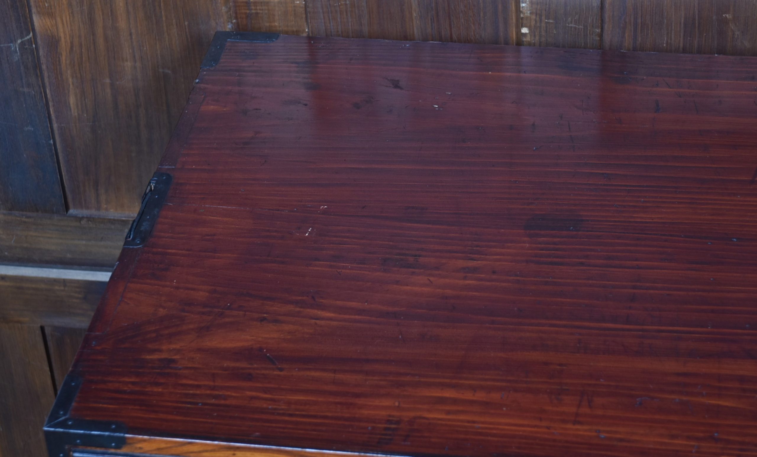 A fantastic Japanese Tansu chest in original condition, crafted from richly grained cedar and adorned with traditional iron hardware. This two-part chest features multiple drawers and compartments, each fitted with ornate black metal handles and decorative mounts showcasing circular and floral motifs. The ironwork is all original, with side-mounted carry handles—one set designed to flip up and secure the upper section to the base. Over years of use, the chest has acquired subtle imperfections that only enhance its character and authenticity. A fine example of Meiji-period craftsmanship, it offers both aesthetic appeal and practical storage, making it a striking addition to any interior.