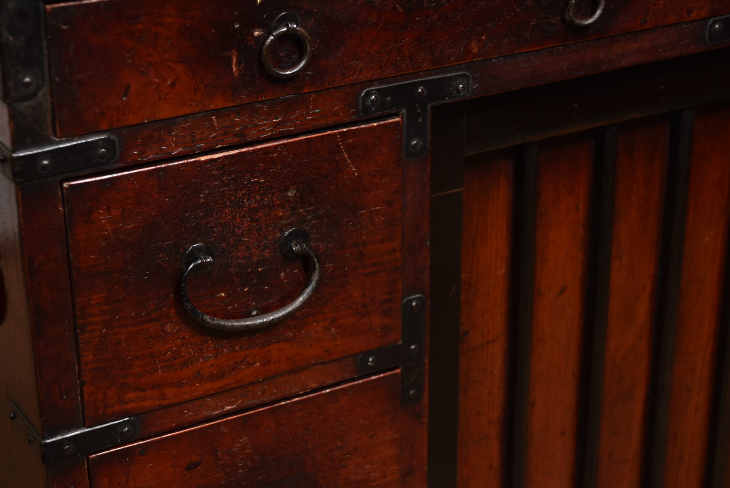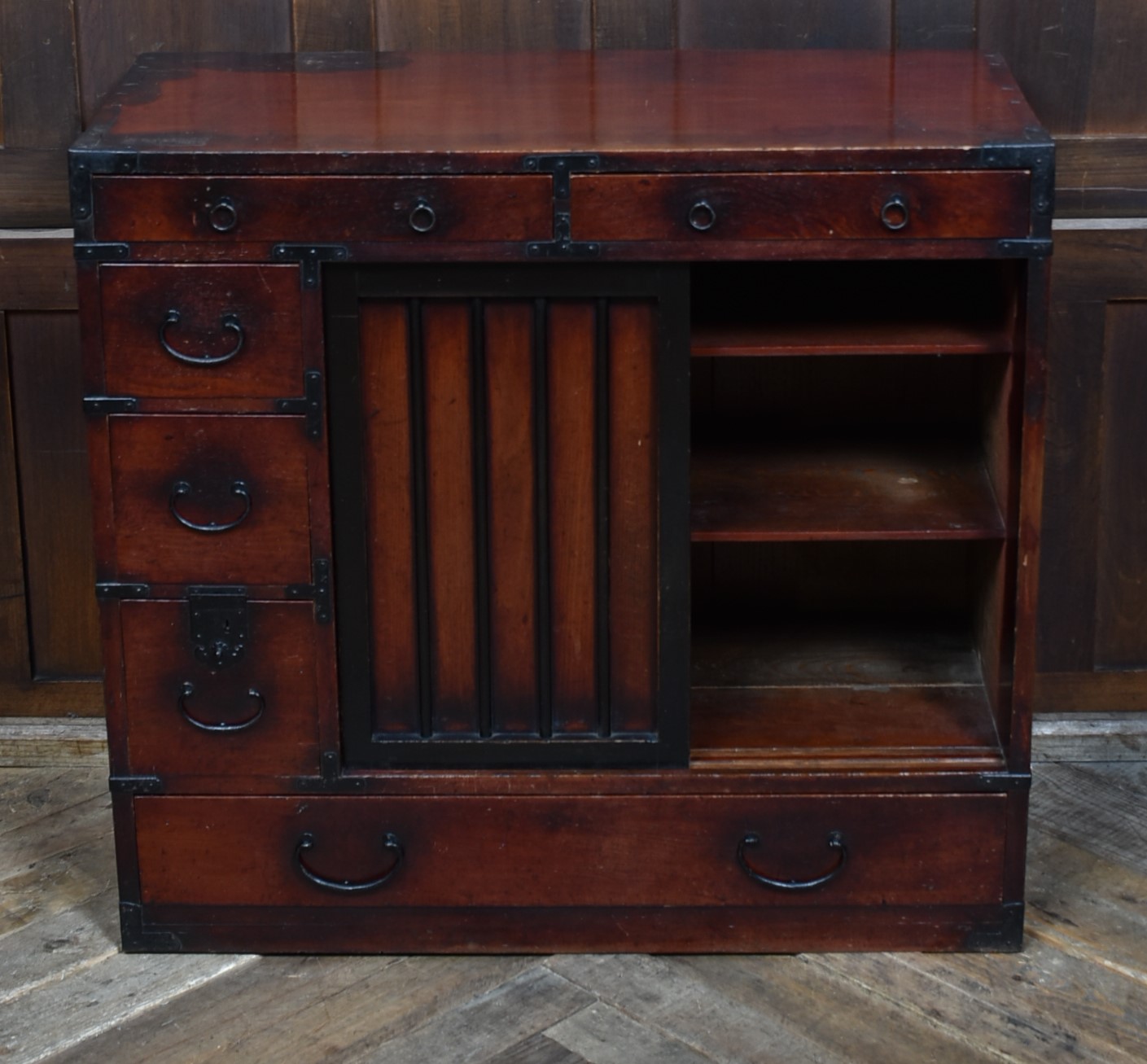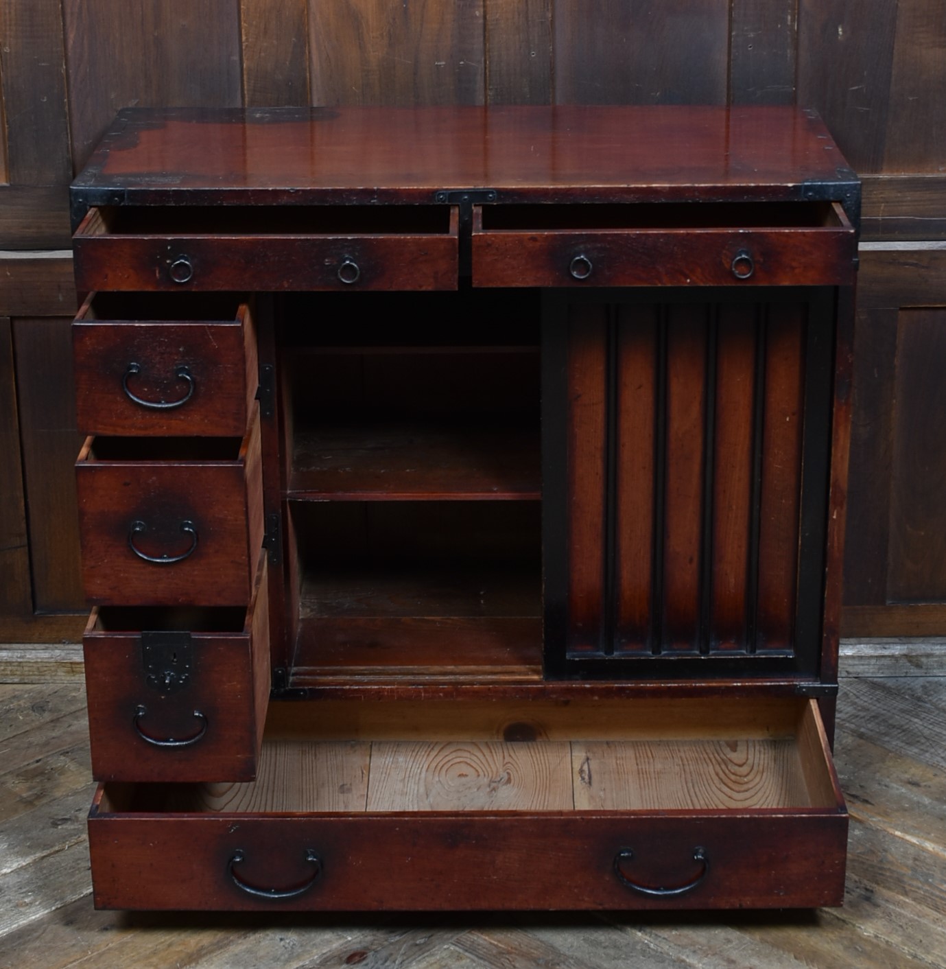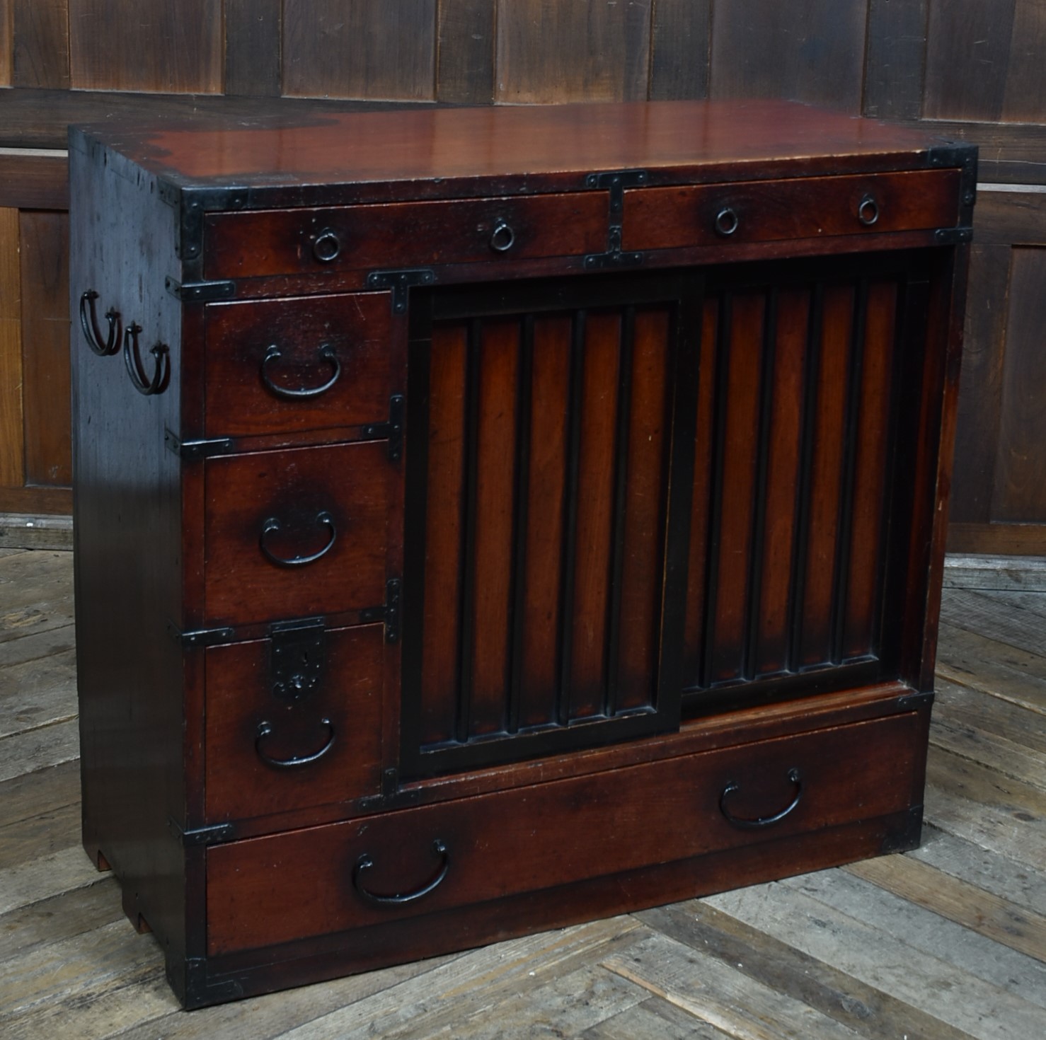 This traditional Choba Tansu, or merchant’s chest, exemplifies the harmonious blend of function and beauty. Crafted from richly stained hardwood—likely keyaki (zelkova) or sugi (cedar), it showcases the expressive grain and enduring strength prized in Japanese joinery. Designed for practical use in merchant shops, the chest features a thoughtful arrangement of storage: a column of drawers in varying sizes lines the left side, ideal for organizing tools, documents, and small wares. At the centre, a pair of sliding doors with vertical slats conceals a spacious, shelved compartment, while additional drawers above and below offer layered utility. Blackened iron fittings and handles provide both structural integrity and striking visual contrast. Side-mounted carrying handles suggest portability, allowing the chest to be repositioned with ease.