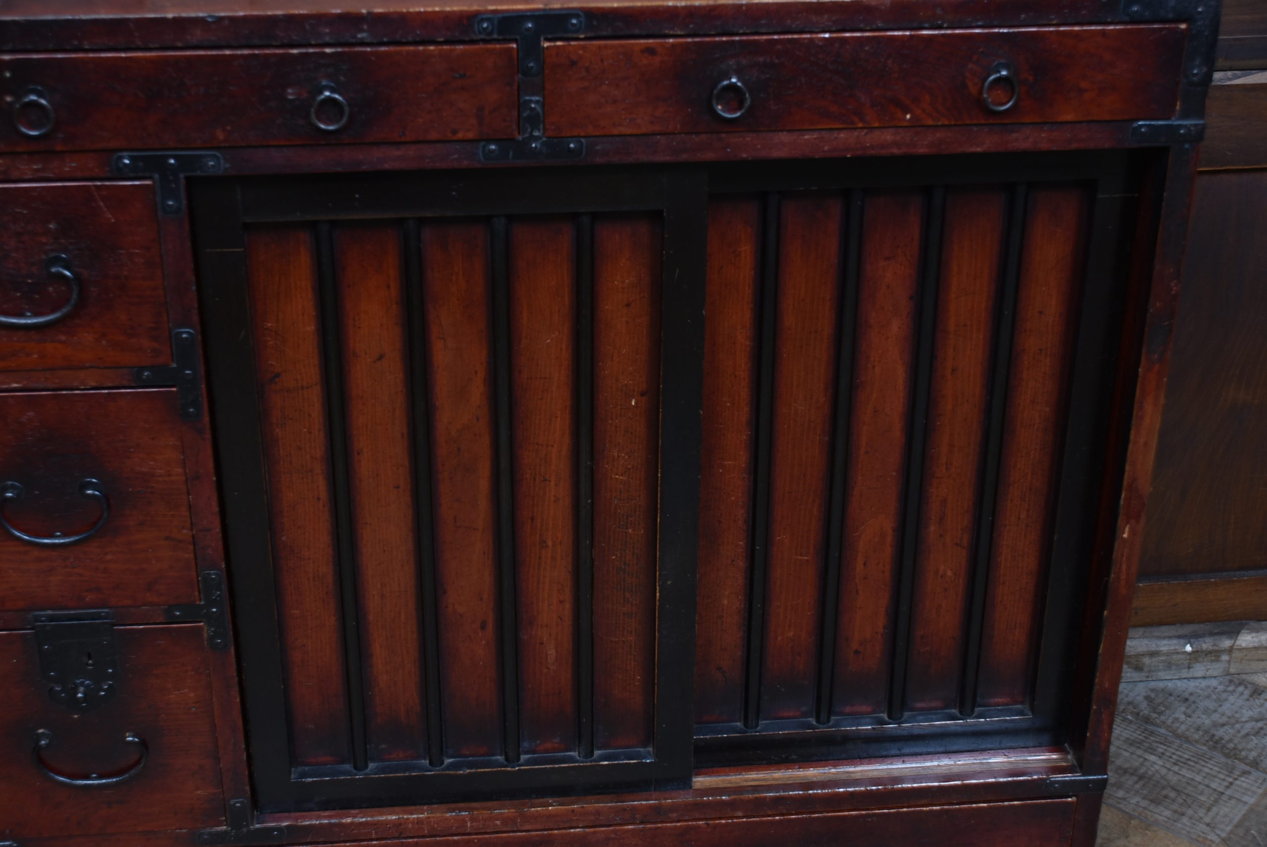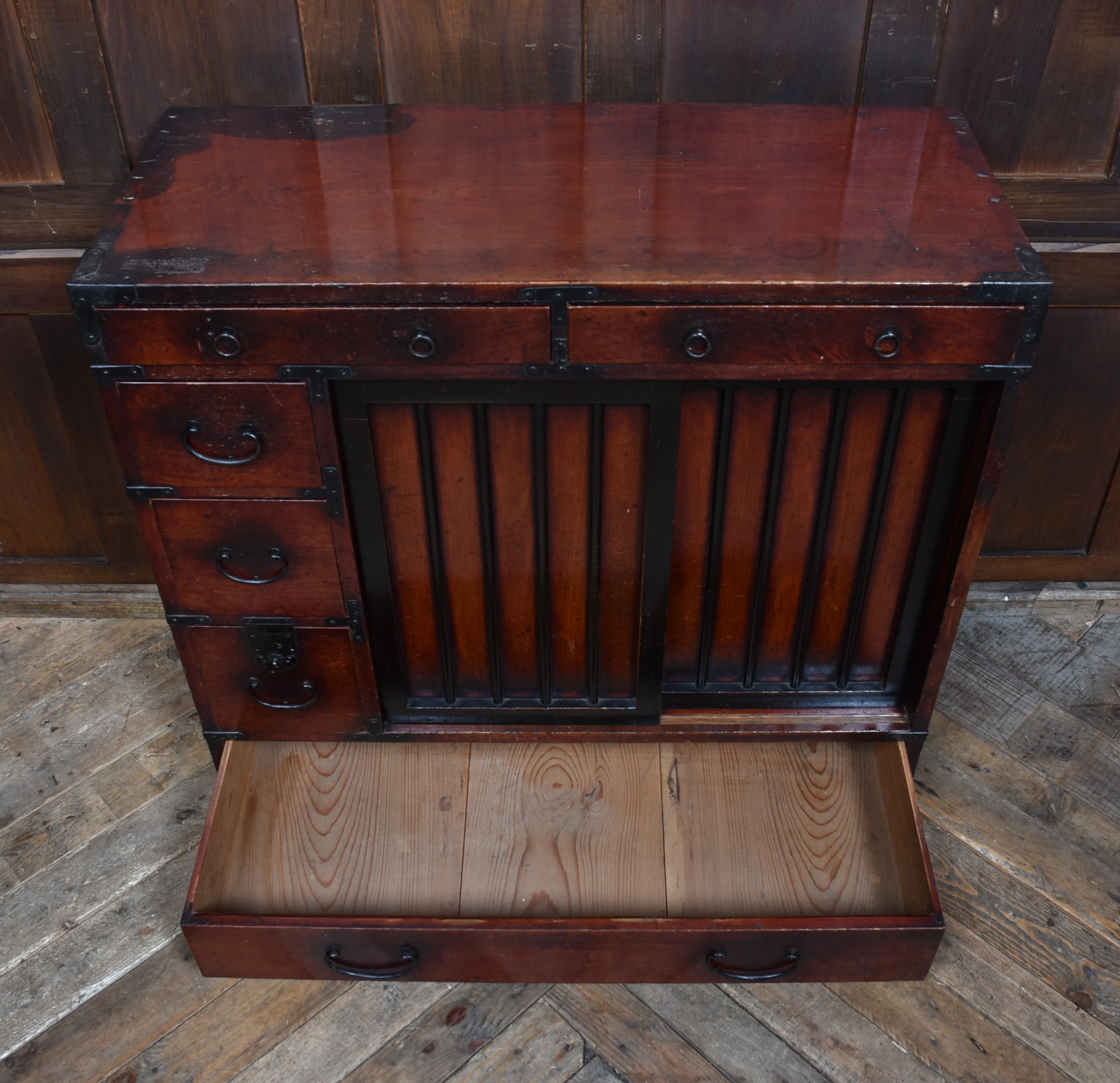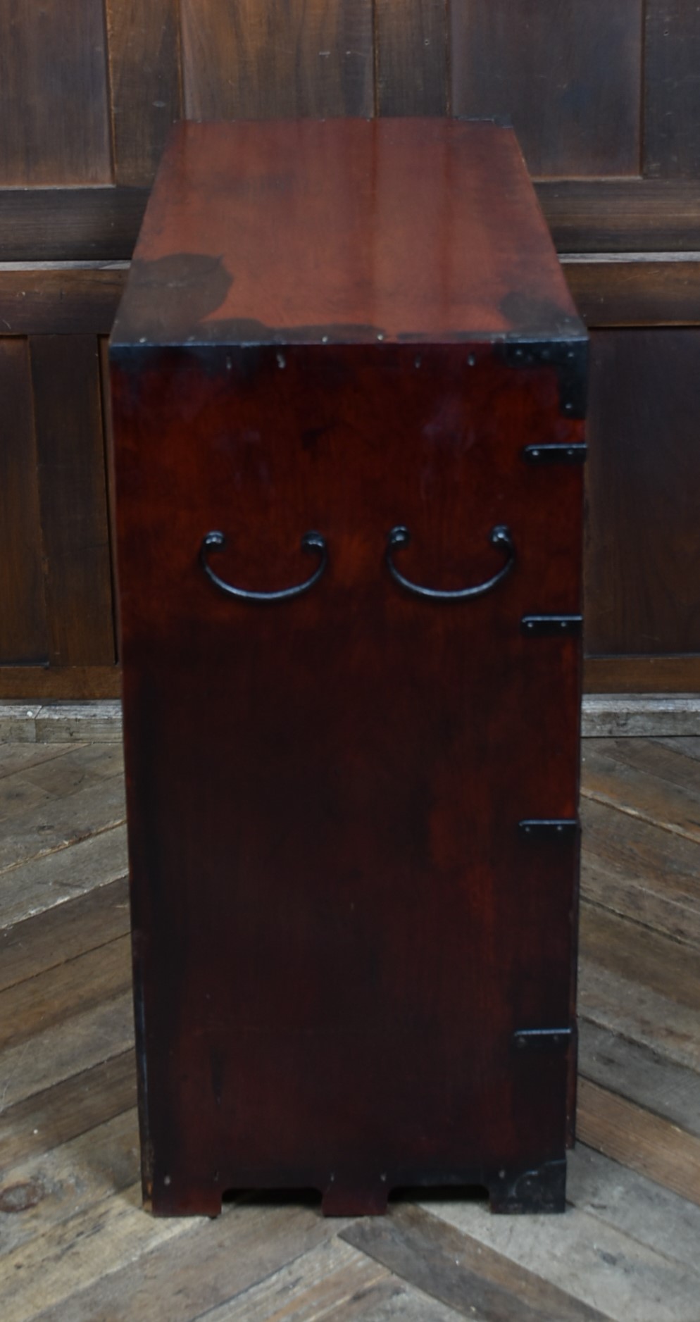 This traditional Choba Tansu, or merchant’s chest, exemplifies the harmonious blend of function and beauty. Crafted from richly stained hardwood—likely keyaki (zelkova) or sugi (cedar), it showcases the expressive grain and enduring strength prized in Japanese joinery. Designed for practical use in merchant shops, the chest features a thoughtful arrangement of storage: a column of drawers in varying sizes lines the left side, ideal for organizing tools, documents, and small wares. At the centre, a pair of sliding doors with vertical slats conceals a spacious, shelved compartment, while additional drawers above and below offer layered utility. Blackened iron fittings and handles provide both structural integrity and striking visual contrast. Side-mounted carrying handles suggest portability, allowing the chest to be repositioned with ease.