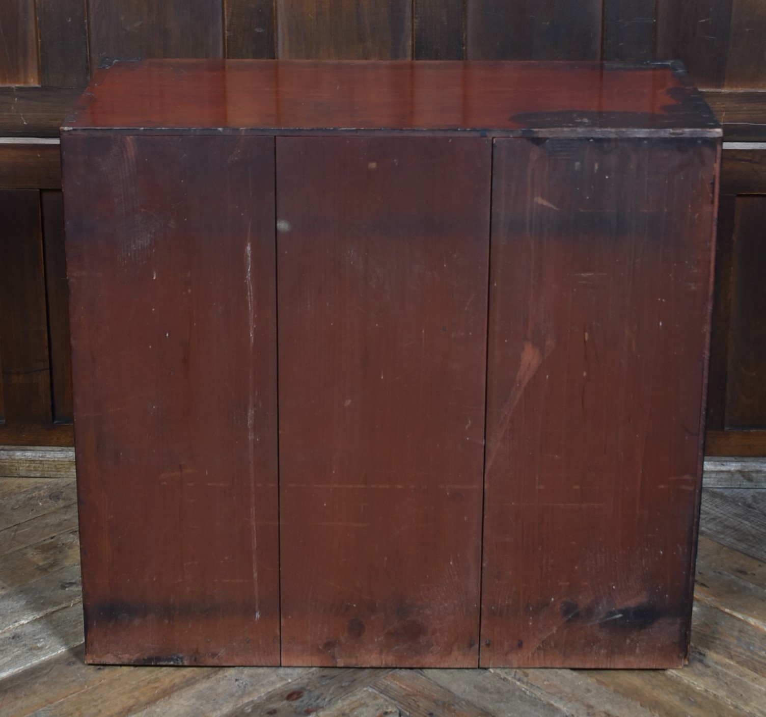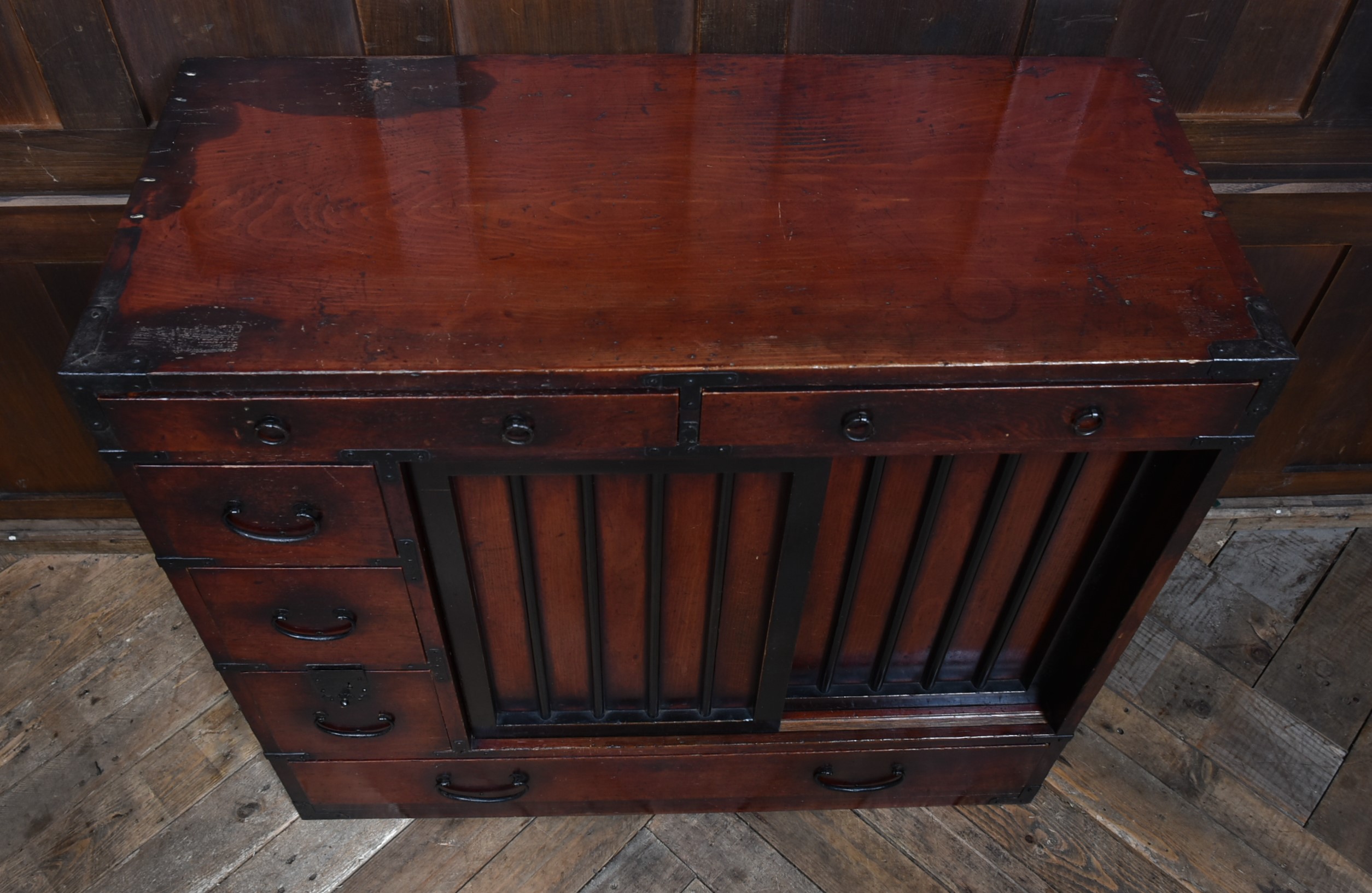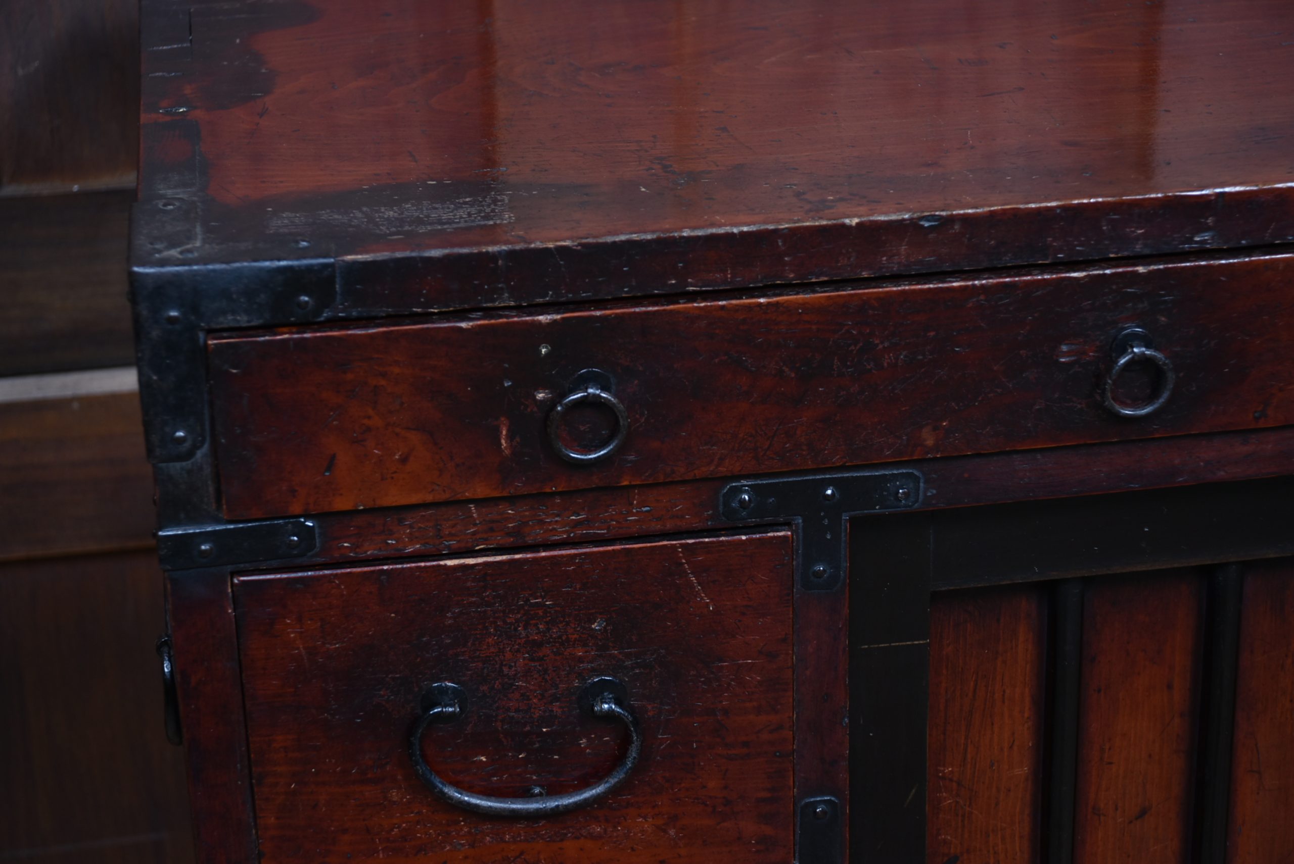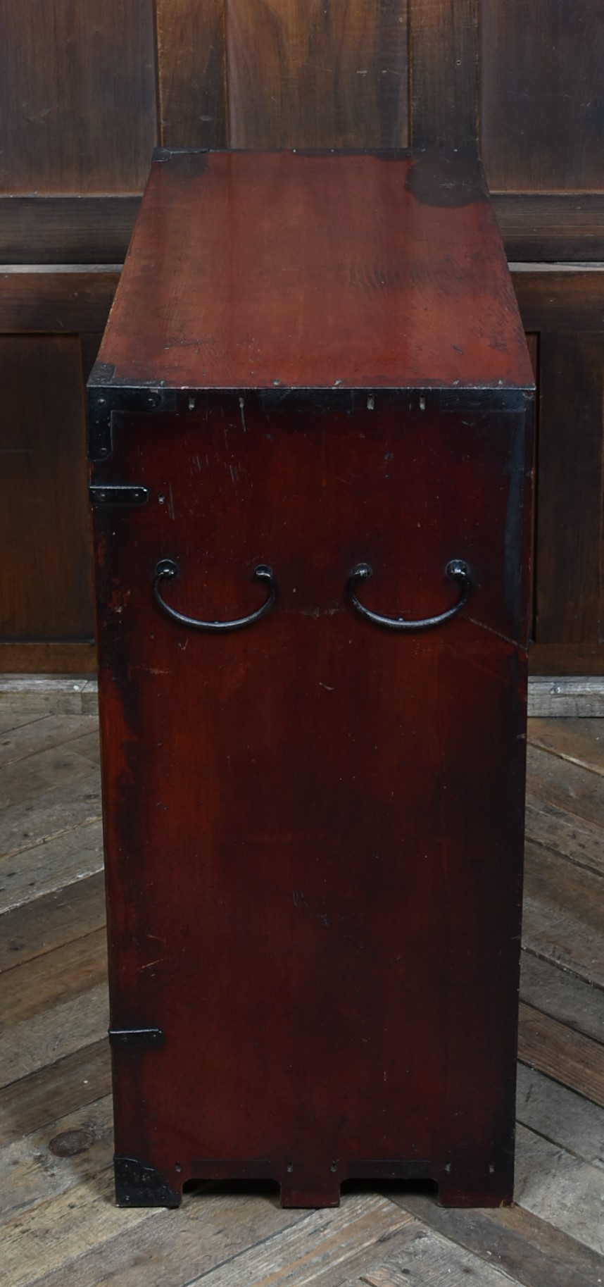 This traditional Choba Tansu, or merchant’s chest, exemplifies the harmonious blend of function and beauty. Crafted from richly stained hardwood—likely keyaki (zelkova) or sugi (cedar), it showcases the expressive grain and enduring strength prized in Japanese joinery. Designed for practical use in merchant shops, the chest features a thoughtful arrangement of storage: a column of drawers in varying sizes lines the left side, ideal for organizing tools, documents, and small wares. At the centre, a pair of sliding doors with vertical slats conceals a spacious, shelved compartment, while additional drawers above and below offer layered utility. Blackened iron fittings and handles provide both structural integrity and striking visual contrast. Side-mounted carrying handles suggest portability, allowing the chest to be repositioned with ease.