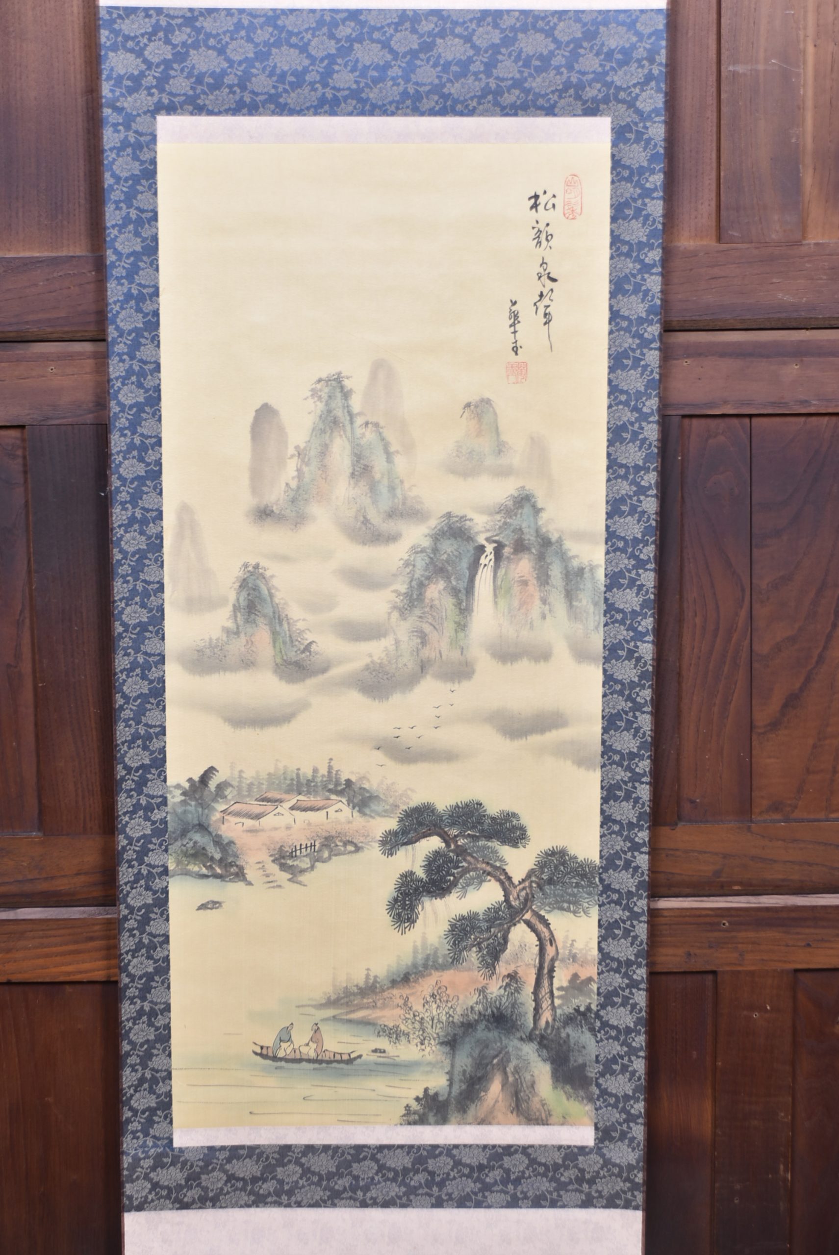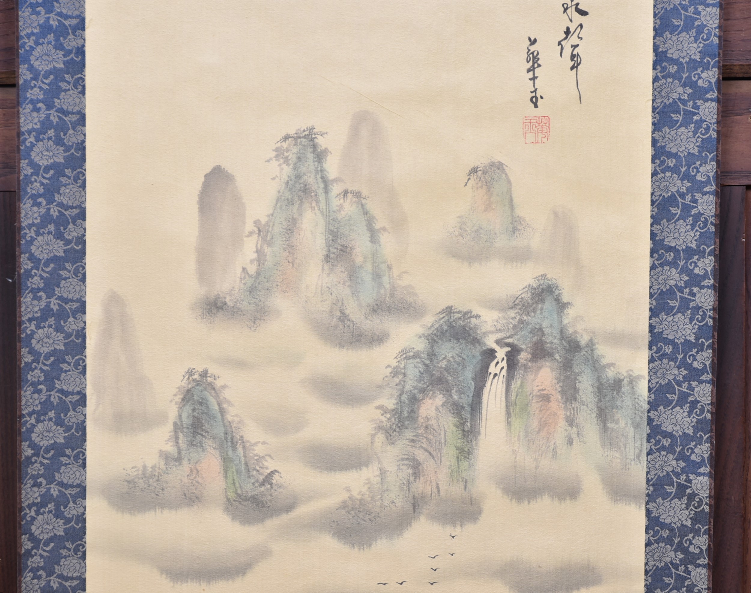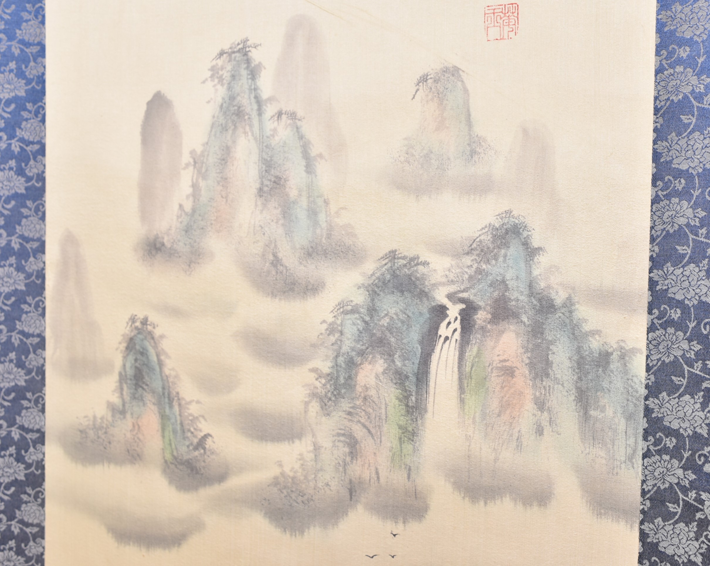 A superb Japanese hanging scroll (kakejiku), beautifully painted in ink and soft washes of colour. The the painting depicts a classic Sansui (mountain‑and‑water) landscape: mist‑laden peaks rising in layered blues and greys, a waterfall descending into a quiet valley, and three small birds gliding across the lower foreground. A red artist’s seal appears to the upper right, accompanied by flowing calligraphy. The painting is mounted on patterned blue brocade with a cream silk upper and lower section, all in very good condition and ready to hang. The scroll comes complete with a wooden tomobako storage box, adding provenance and protection. A tranquil and elegant work, ideal for bringing a touch of Japanese refinement to any interior — whether displayed alone or as part of a curated wall of scrolls.