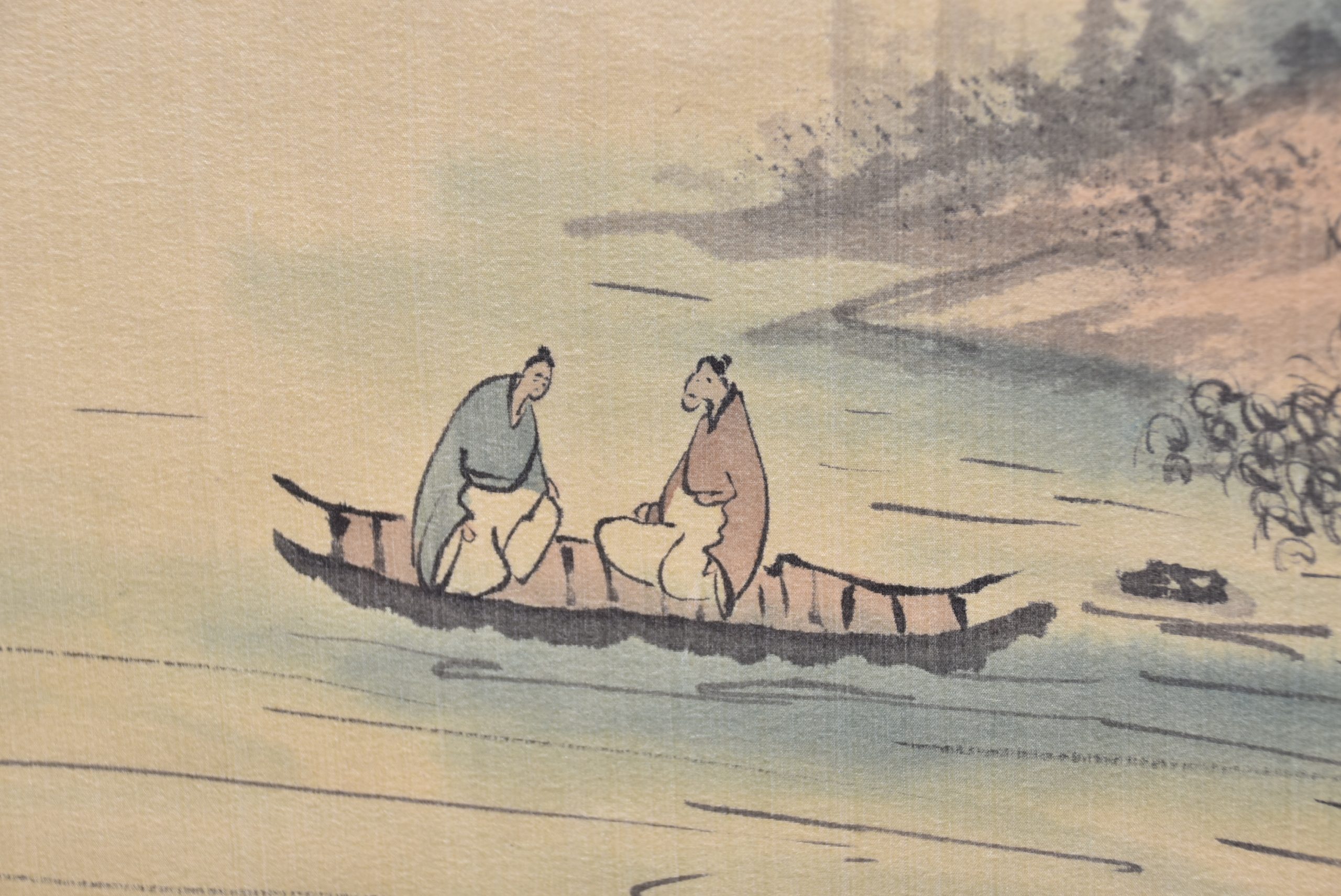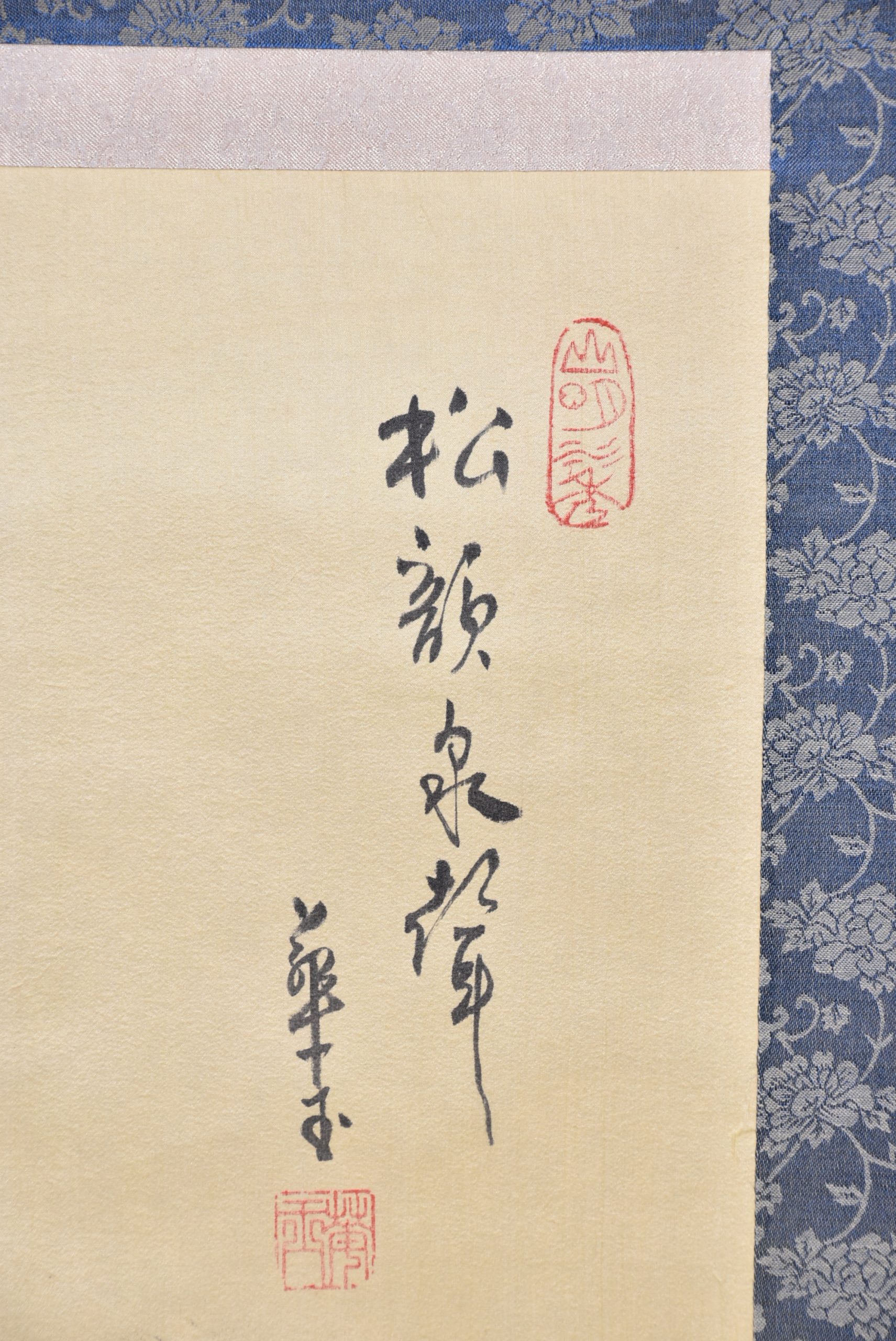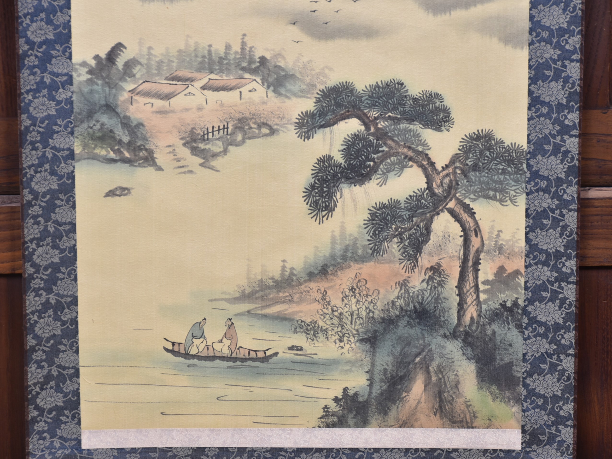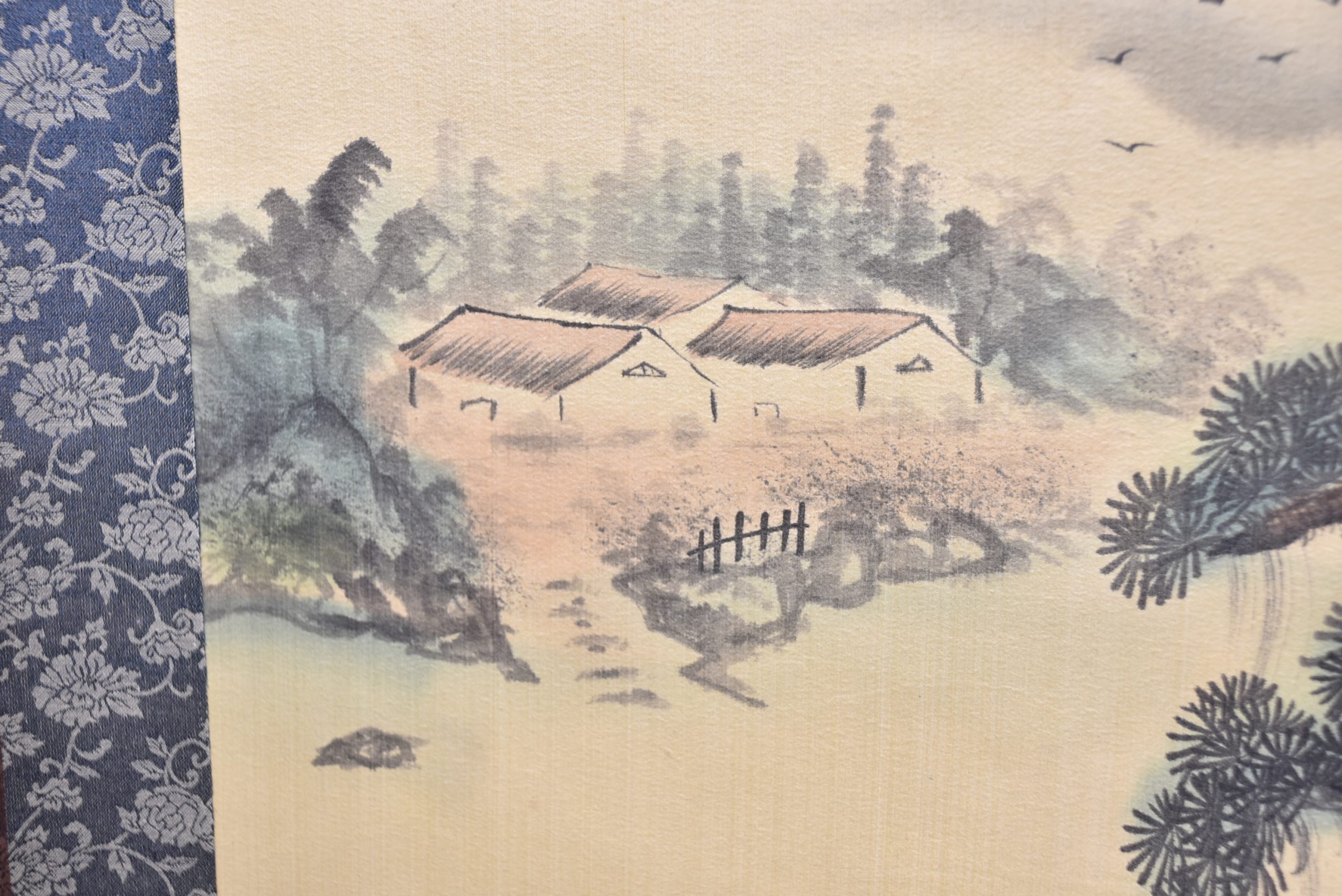 A superb Japanese hanging scroll (kakejiku), beautifully painted in ink and soft washes of colour. The the painting depicts a classic Sansui (mountain‑and‑water) landscape: mist‑laden peaks rising in layered blues and greys, a waterfall descending into a quiet valley, and three small birds gliding across the lower foreground. A red artist’s seal appears to the upper right, accompanied by flowing calligraphy. The painting is mounted on patterned blue brocade with a cream silk upper and lower section, all in very good condition and ready to hang. The scroll comes complete with a wooden tomobako storage box, adding provenance and protection. A tranquil and elegant work, ideal for bringing a touch of Japanese refinement to any interior — whether displayed alone or as part of a curated wall of scrolls.
