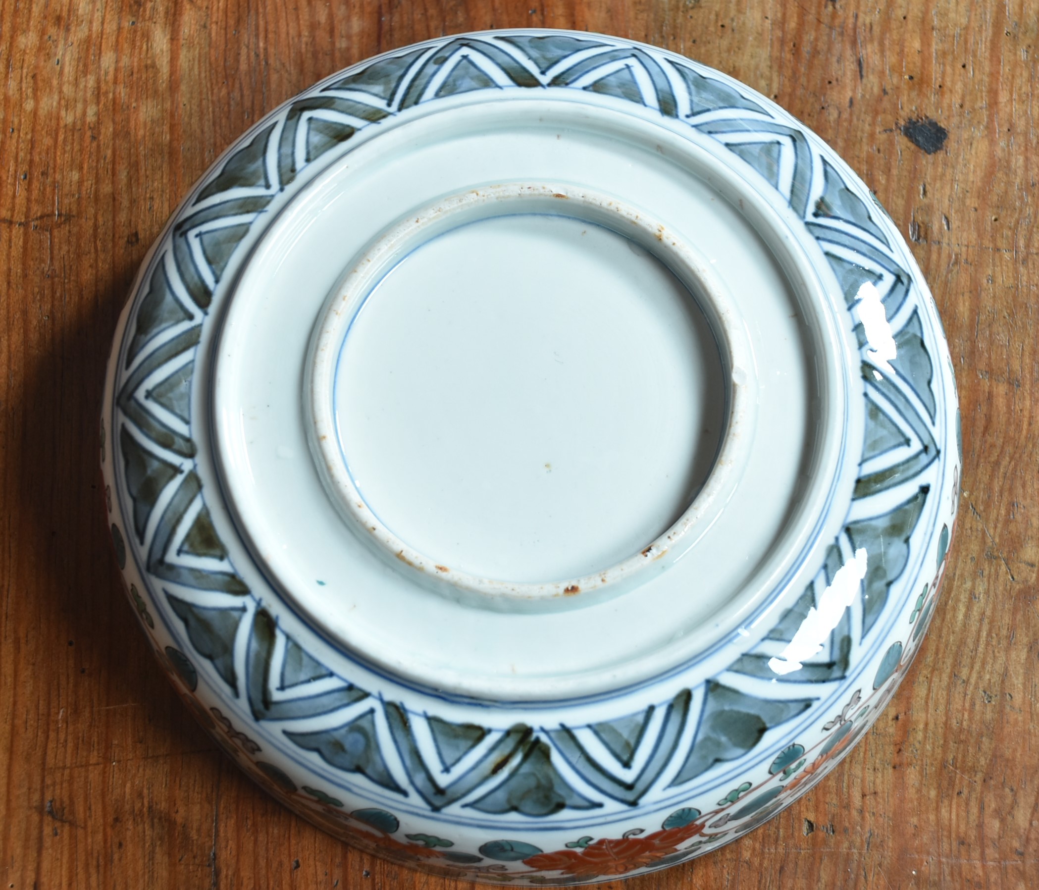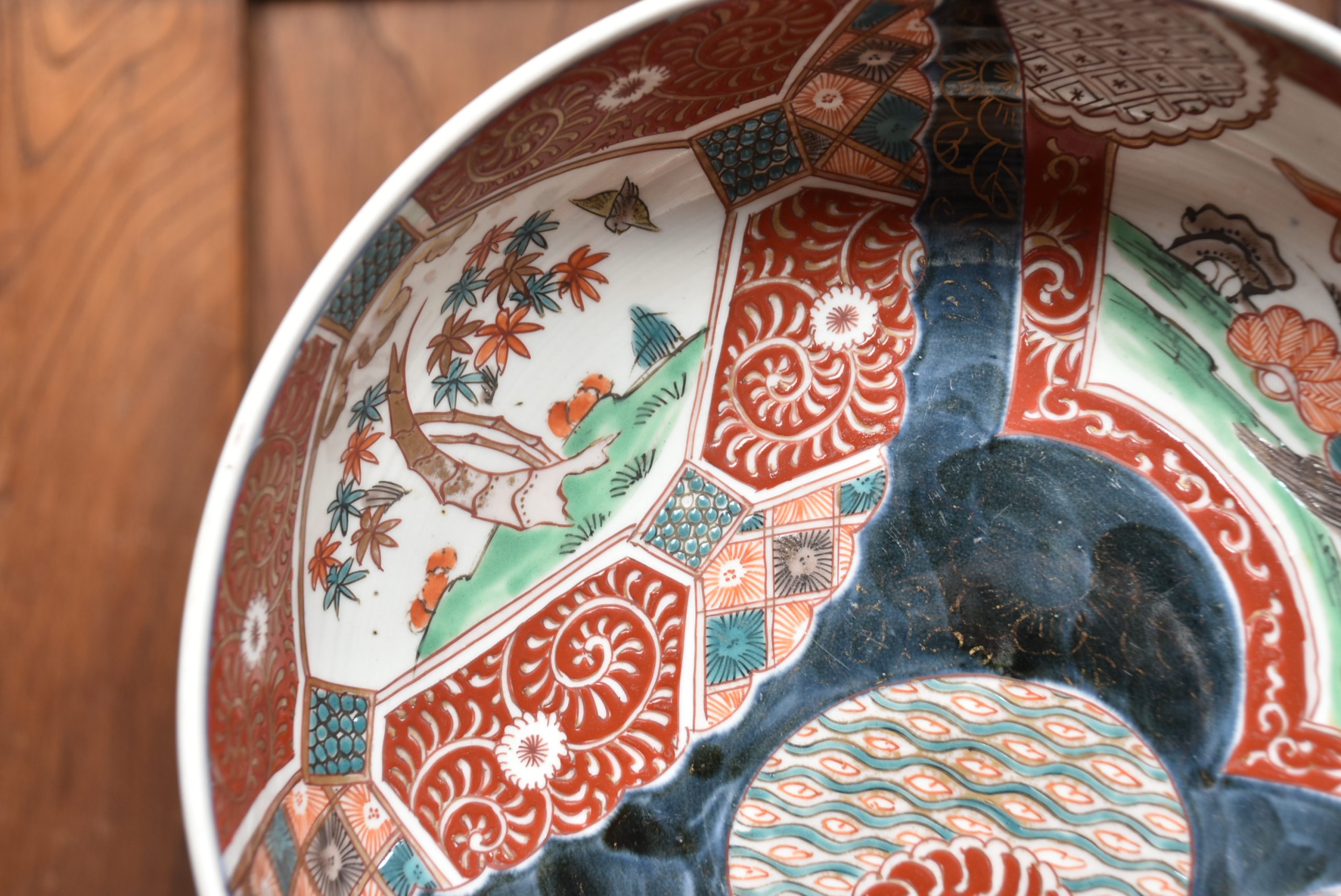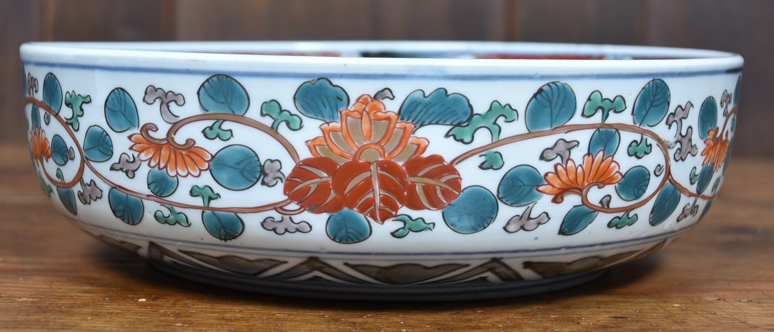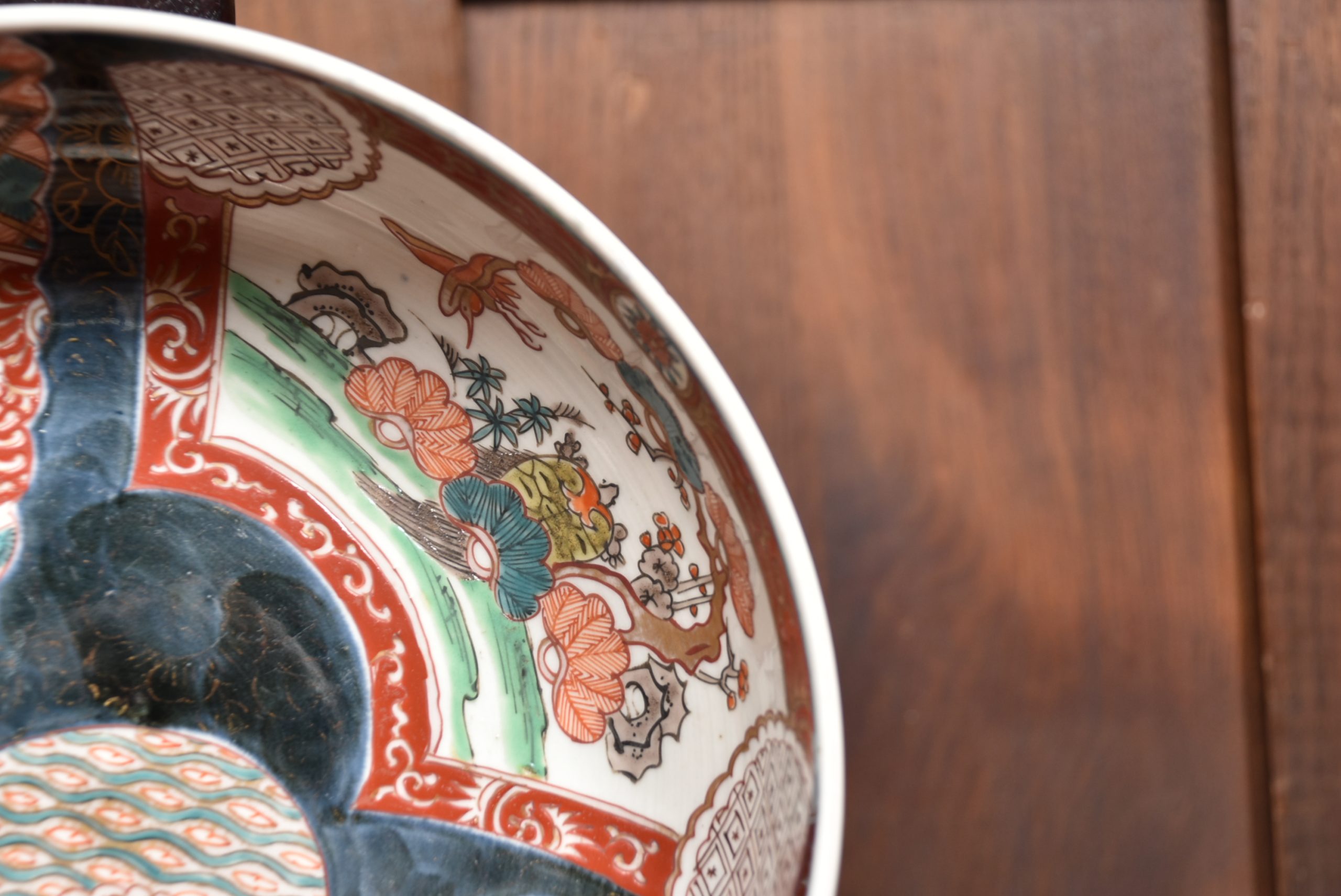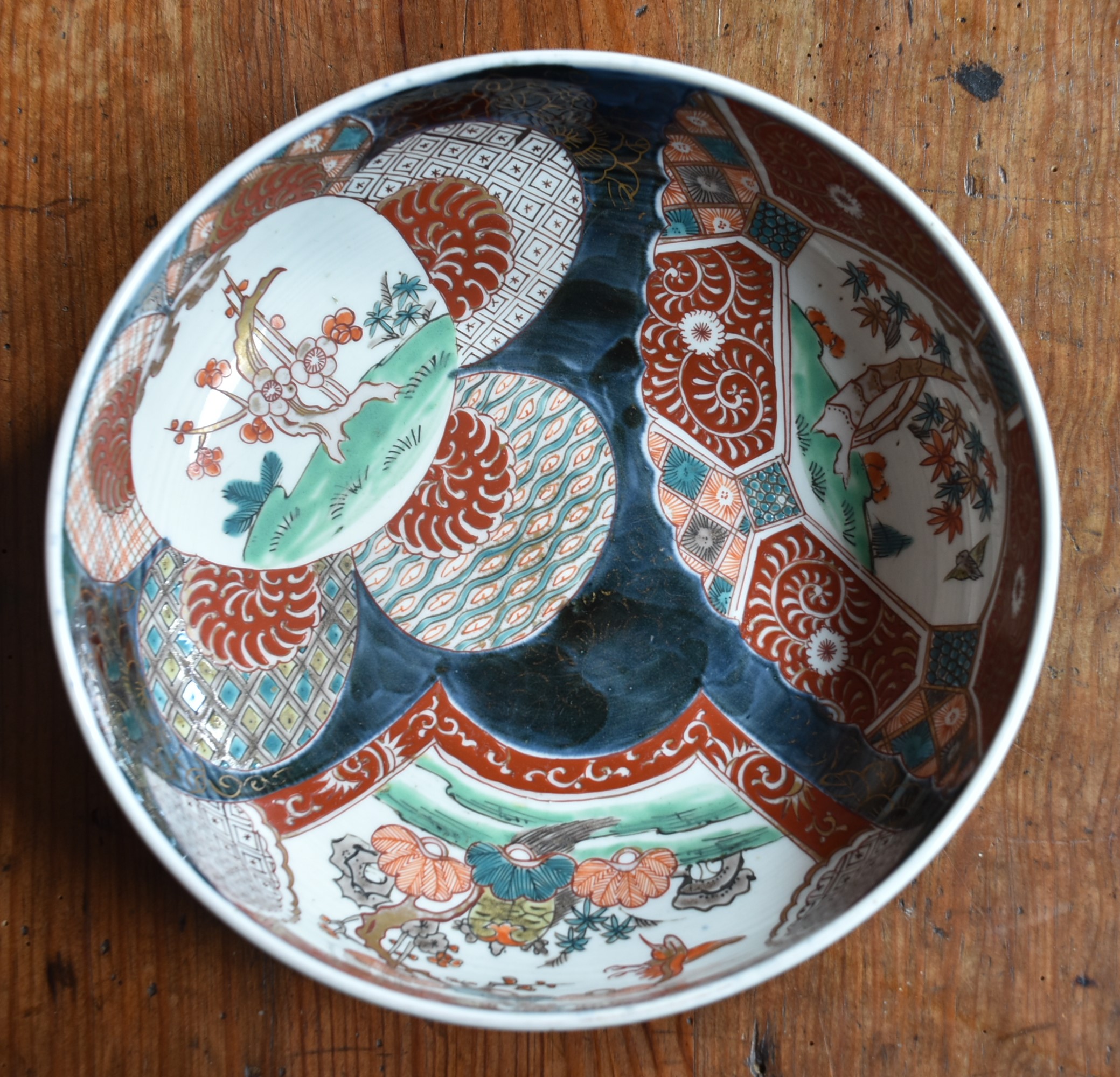 A richly decorated Japanese Imari bowl, featuring a vibrant palette of iron red, emerald green, cobalt blue, and gilt. The interior features alternating panels of traditional motifs, blossoming trees, stylised florals, and tranquil landscape scenes. The exterior is equally striking, hand-painted with a continuous band of stylised florals and foliage in coordinating tones. Delicate outlines lend rhythm to the decoration, while a fine blue line encircles the rim and a subtle geometric border finishes the lower edge. Together, these elements enhance the bowl’s sculptural presence and reflect the refined craftsmanship and export elegance characteristic of the Imari tradition.