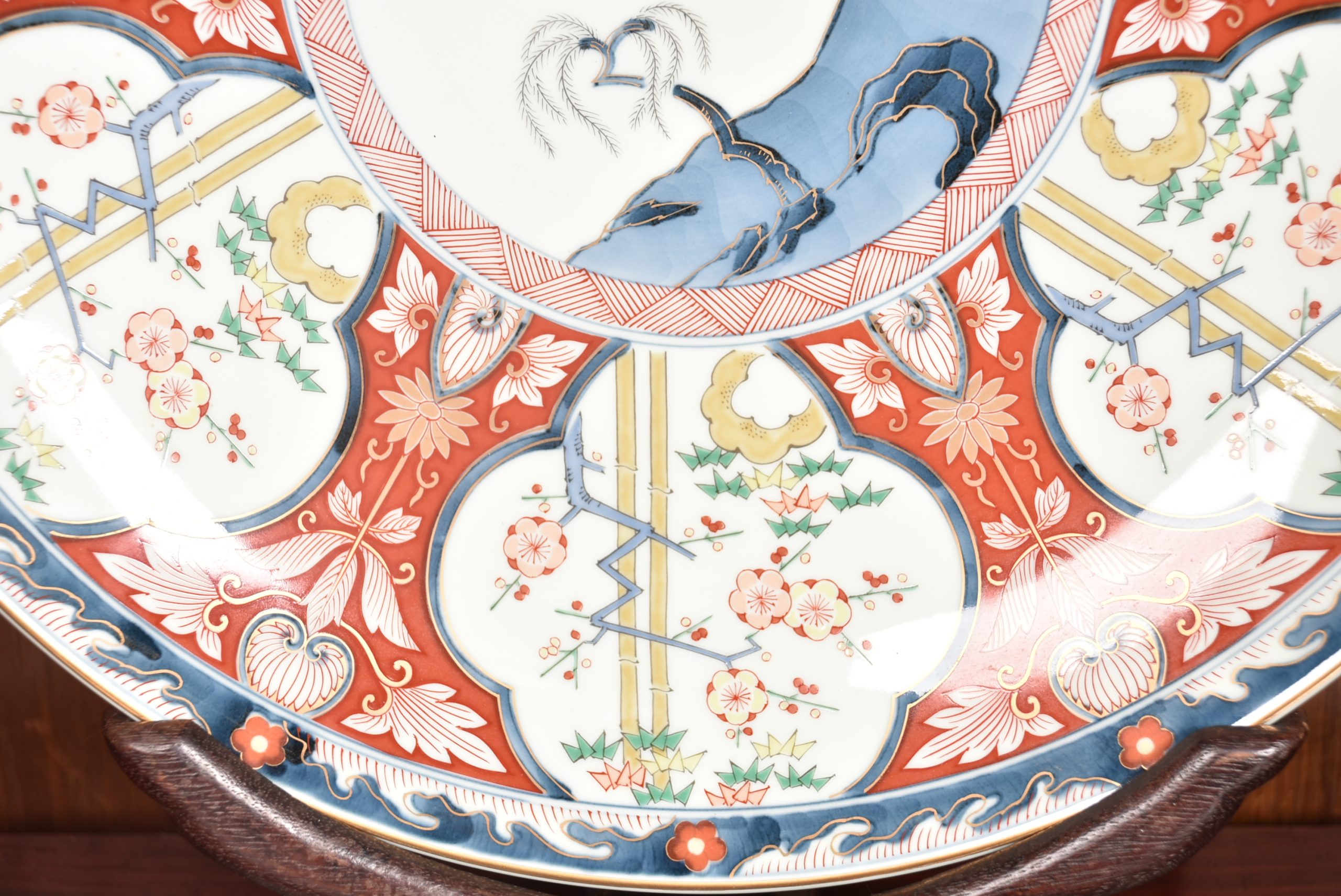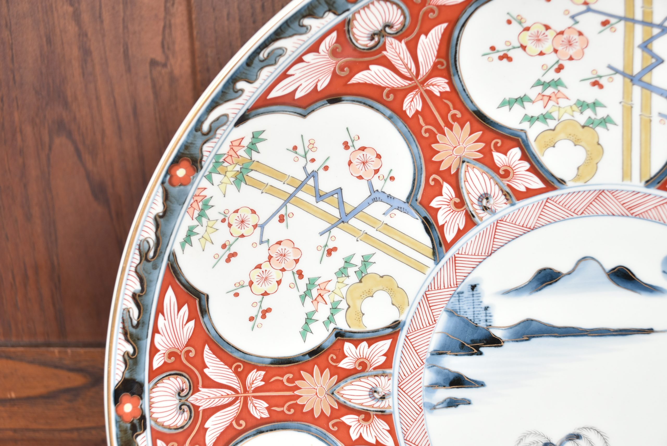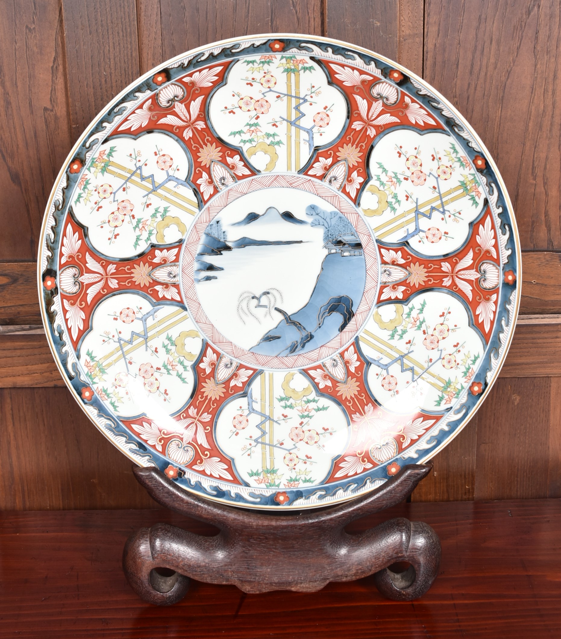 A finely decorated Imari plate featuring a Tranquil blue landscape at its centre, framed by eight scalloped panels with vibrant floral motifs in iron red, white, and gold. This piece exemplifies the Imari aesthetic, combining Japanese artistry with export appeal. The intricate layering of glazes and the interplay of natural and architectural elements reflect both technical mastery and cultural symbolism.