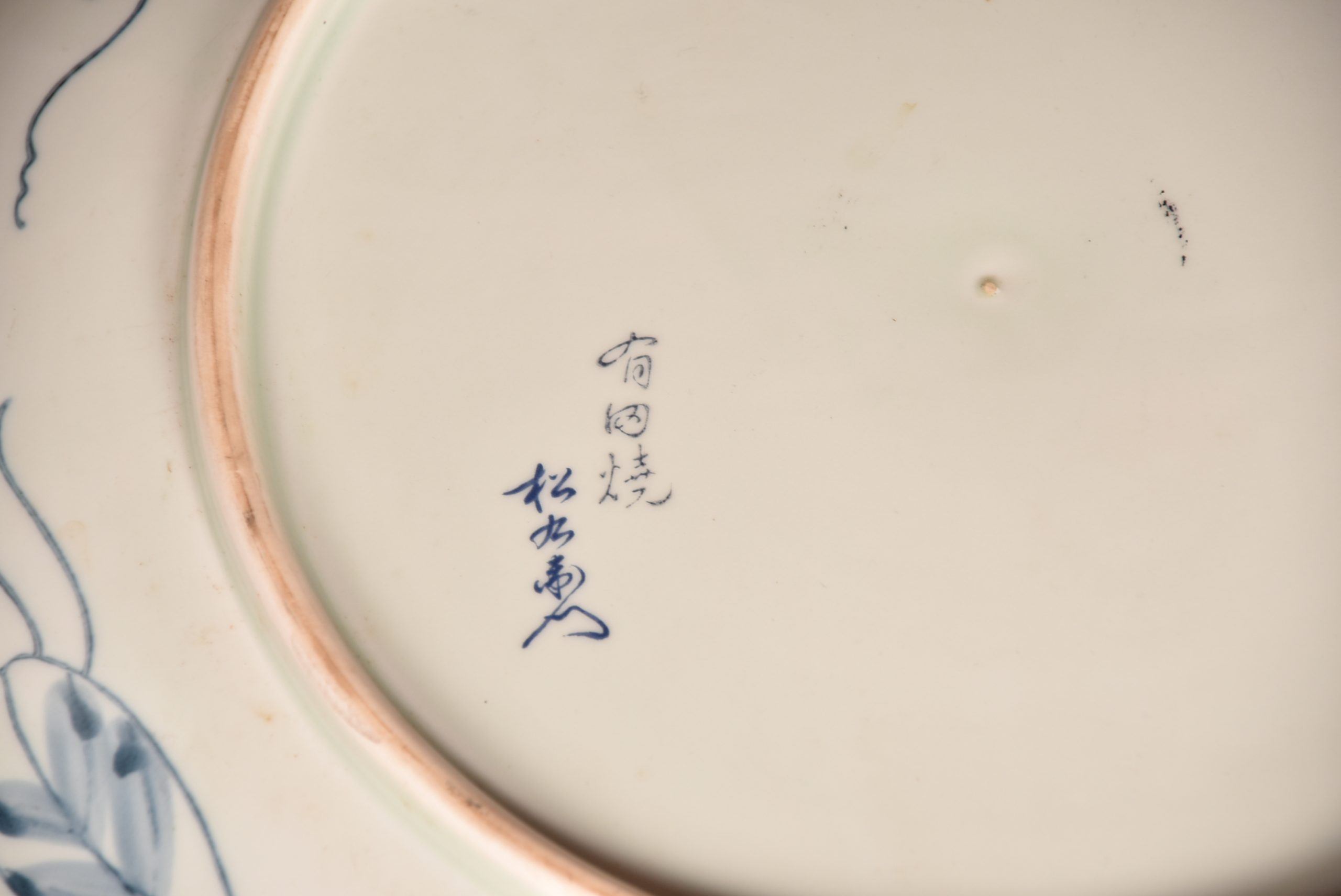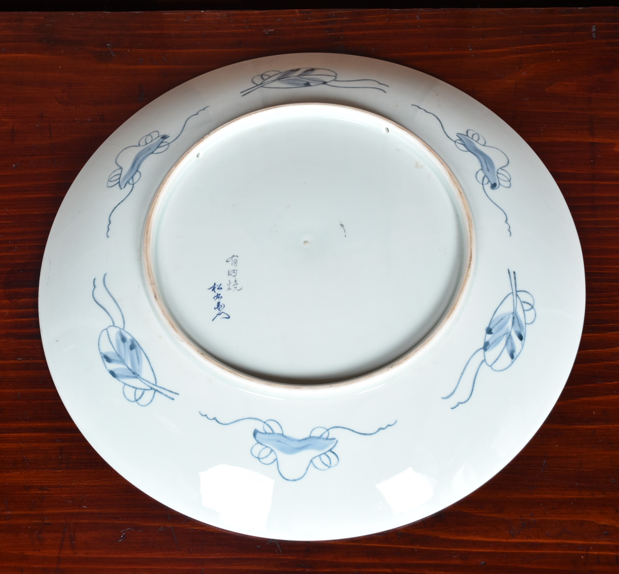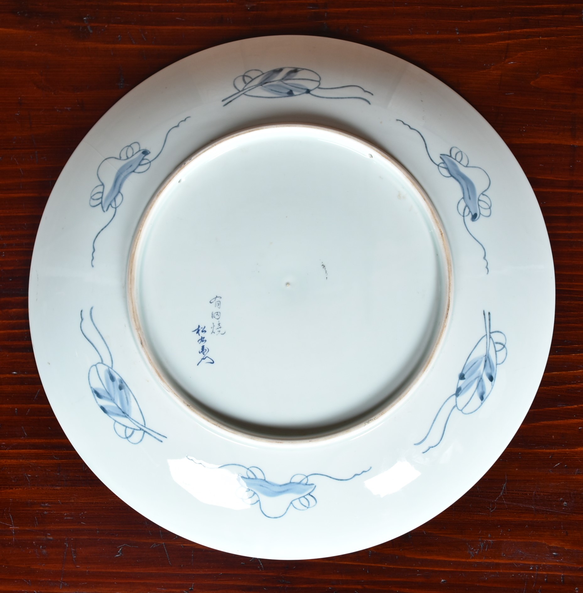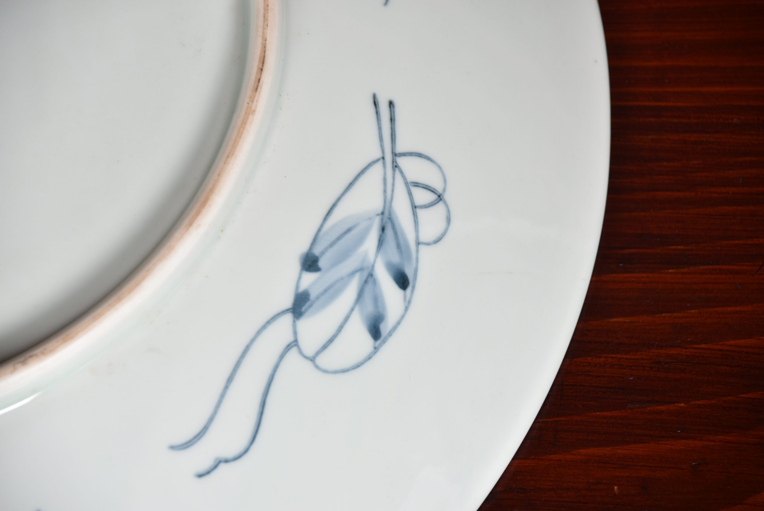 A finely decorated Imari plate featuring a Tranquil blue landscape at its centre, framed by eight scalloped panels with vibrant floral motifs in iron red, white, and gold. This piece exemplifies the Imari aesthetic, combining Japanese artistry with export appeal. The intricate layering of glazes and the interplay of natural and architectural elements reflect both technical mastery and cultural symbolism.