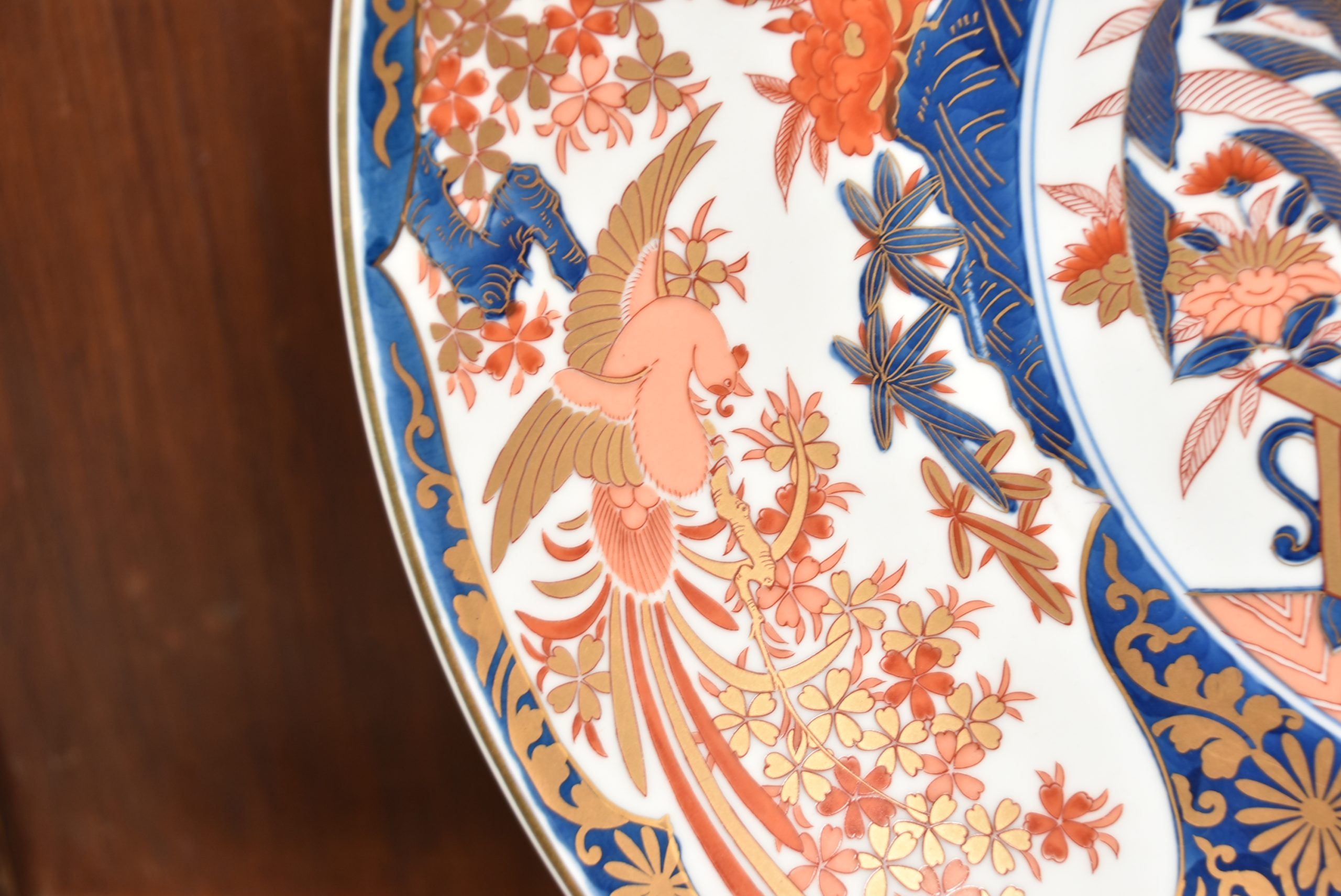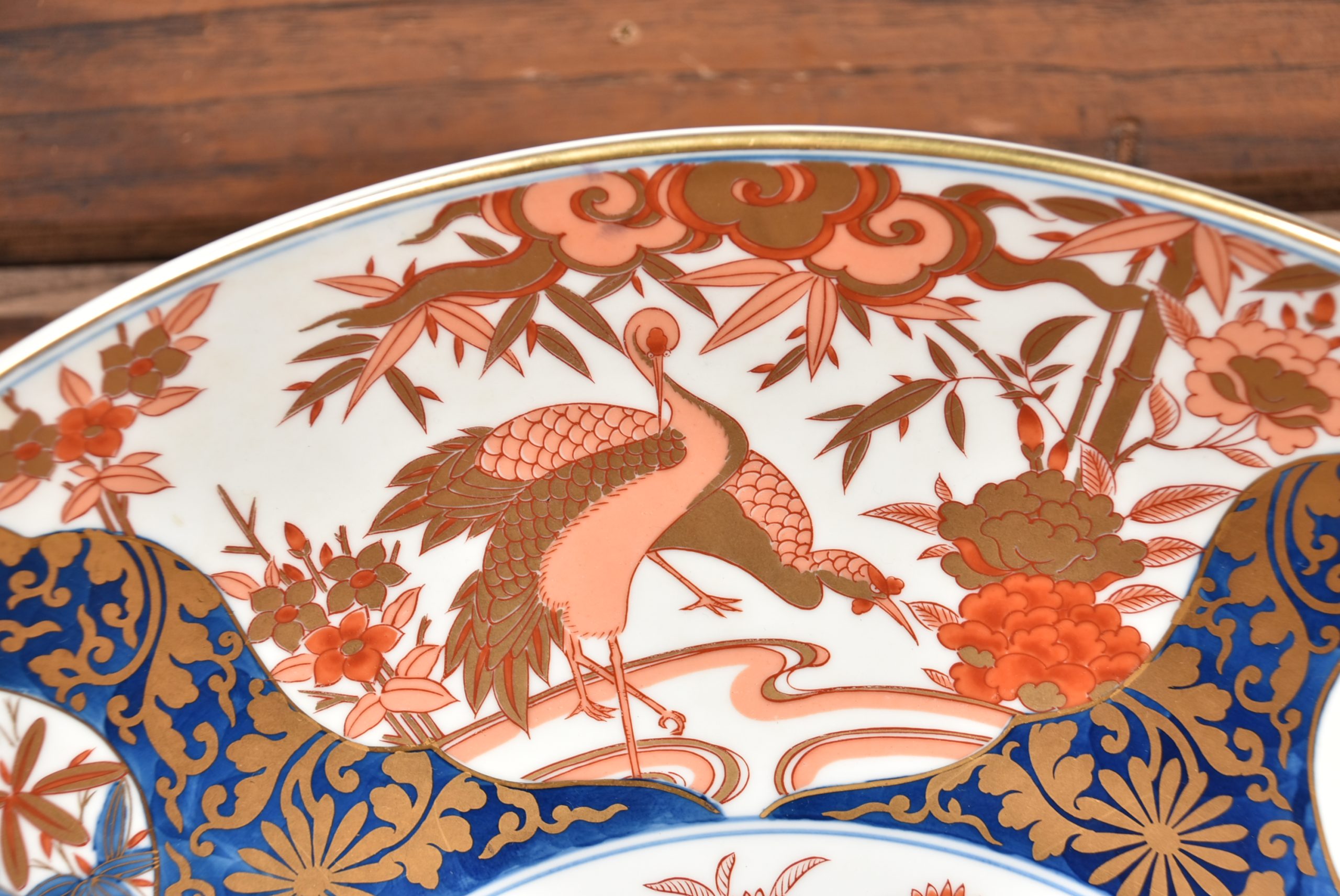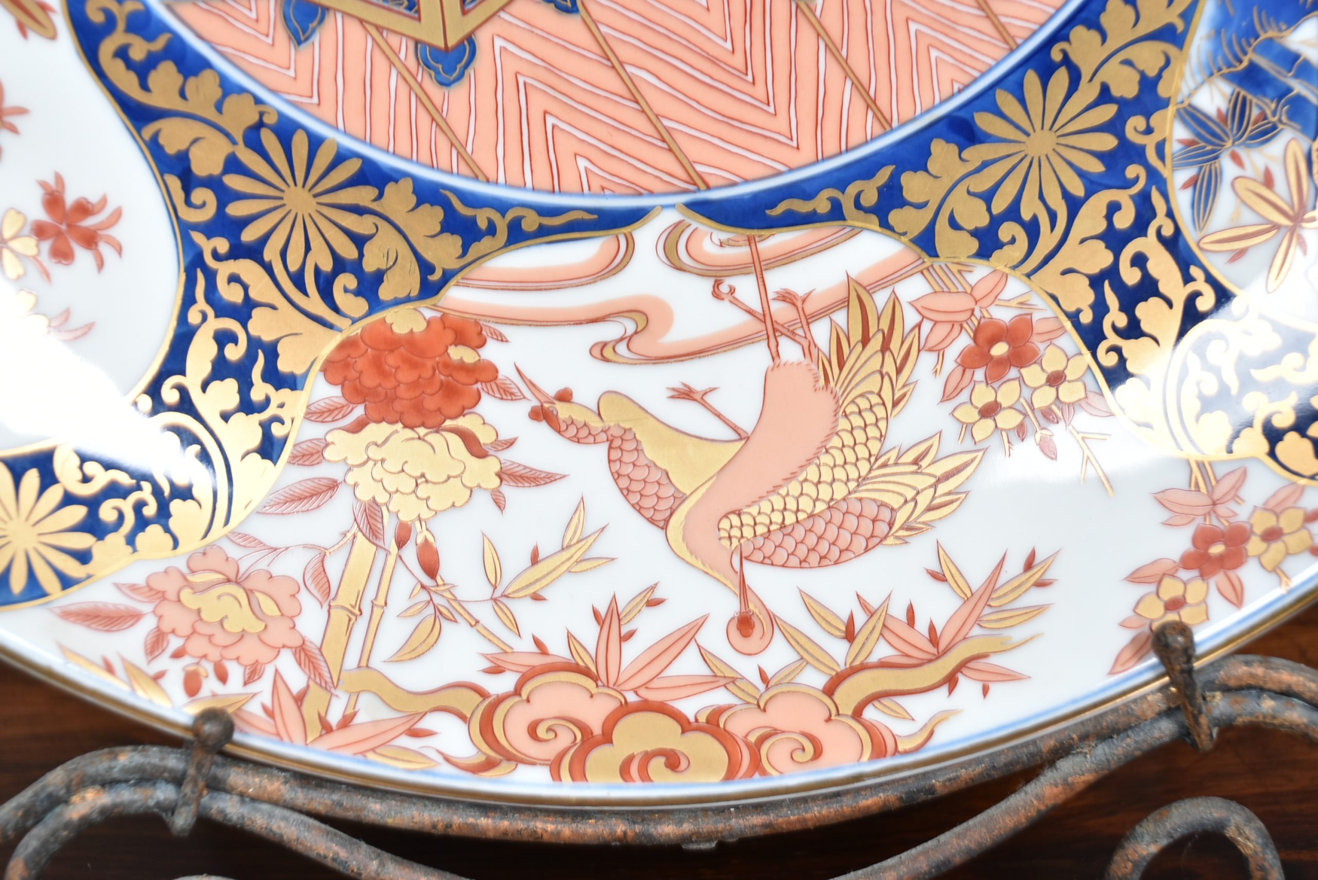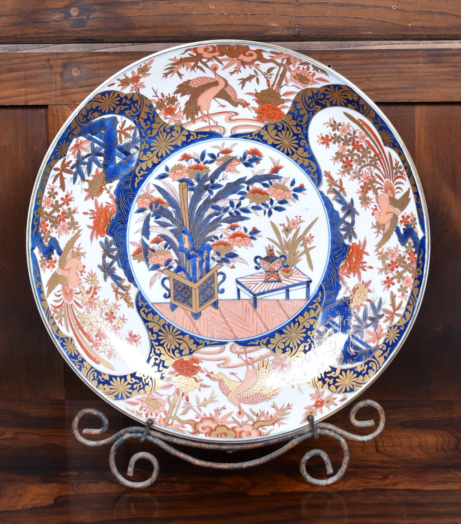 A superb Imari charger in excellent condition, showcasing traditional Japanese porcelain at its finest. At the centre, a floral arrangement in a vase is framed by intricate botanical and avian motifs, including cranes—symbols of longevity and good fortune. The bold palette of cobalt blue, iron red, gold, and white is classic Imari, while the rim’s symmetrical patterns echo traditional textile and lacquer designs. Decorative and symbolic, this striking piece reflects Japan’s reverence for seasonal beauty and balanced design.