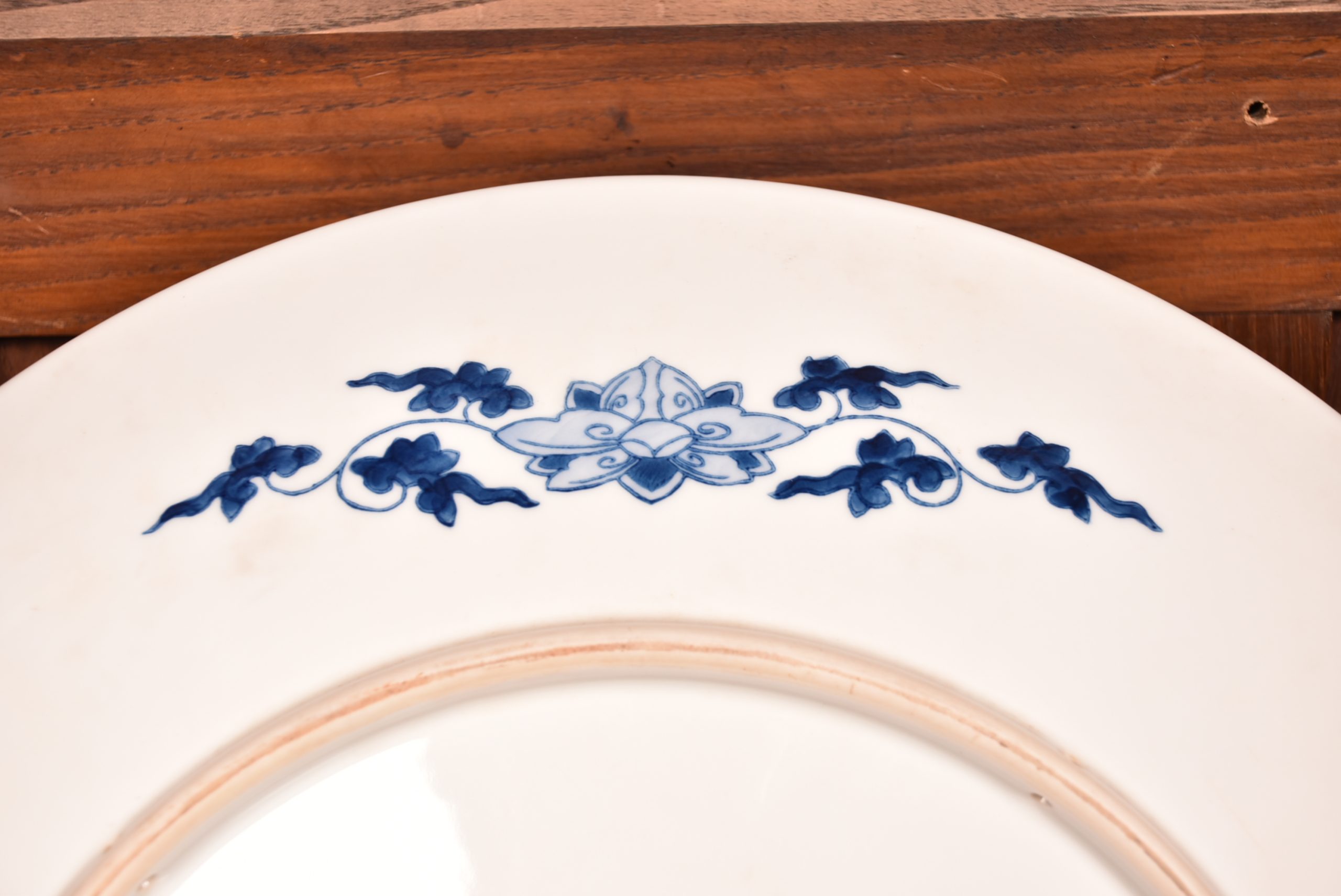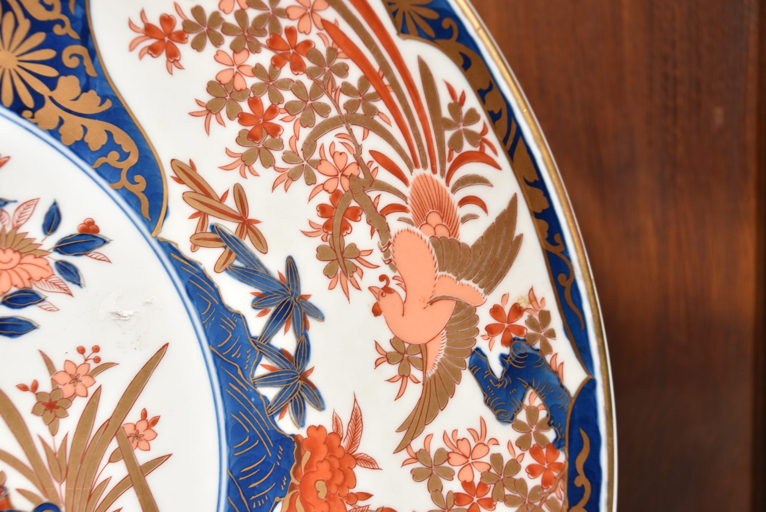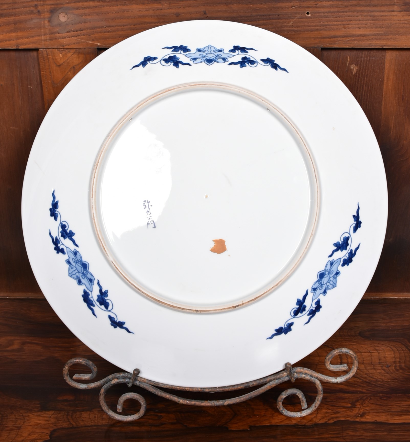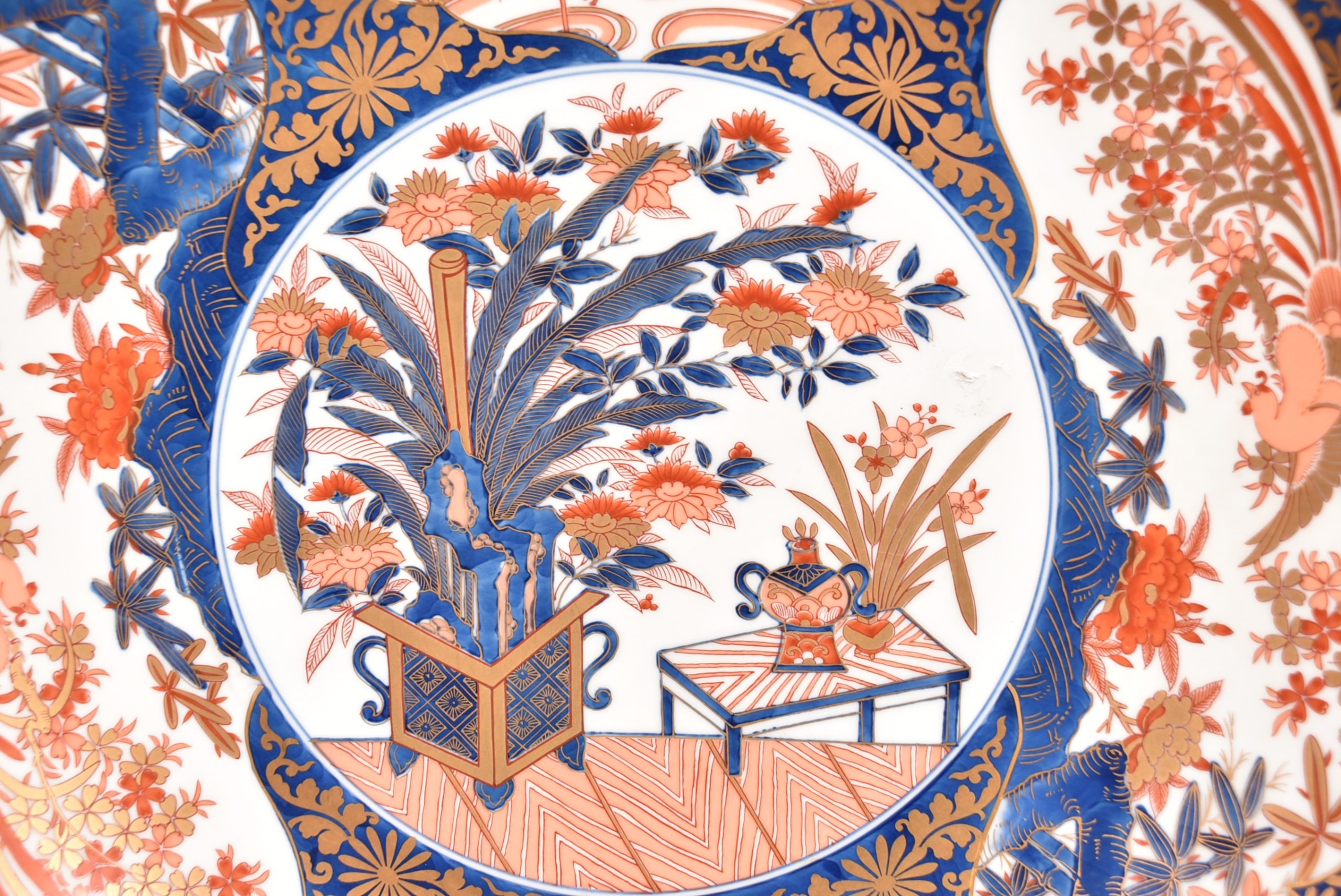 A superb Imari charger in excellent condition, showcasing traditional Japanese porcelain at its finest. At the centre, a floral arrangement in a vase is framed by intricate botanical and avian motifs, including cranes—symbols of longevity and good fortune. The bold palette of cobalt blue, iron red, gold, and white is classic Imari, while the rim’s symmetrical patterns echo traditional textile and lacquer designs. Decorative and symbolic, this striking piece reflects Japan’s reverence for seasonal beauty and balanced design.