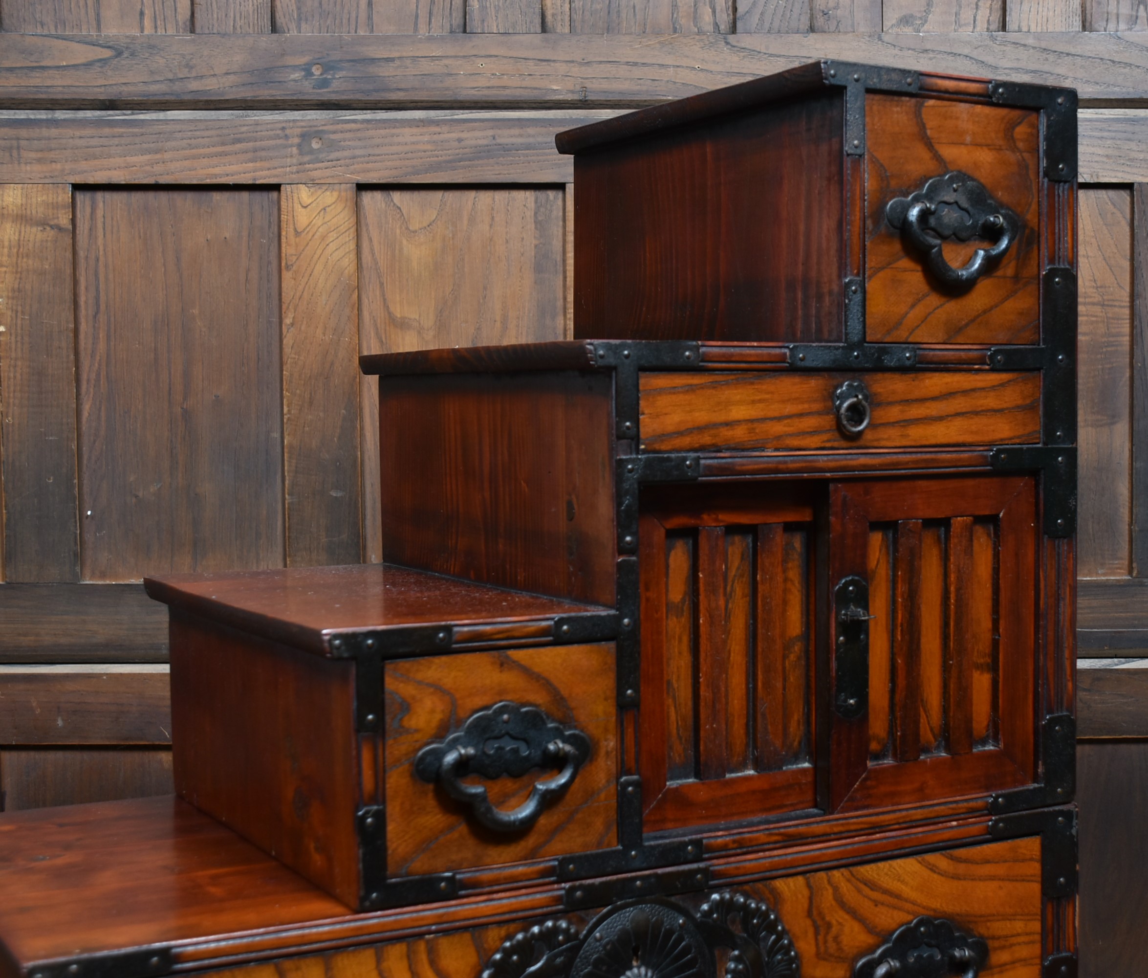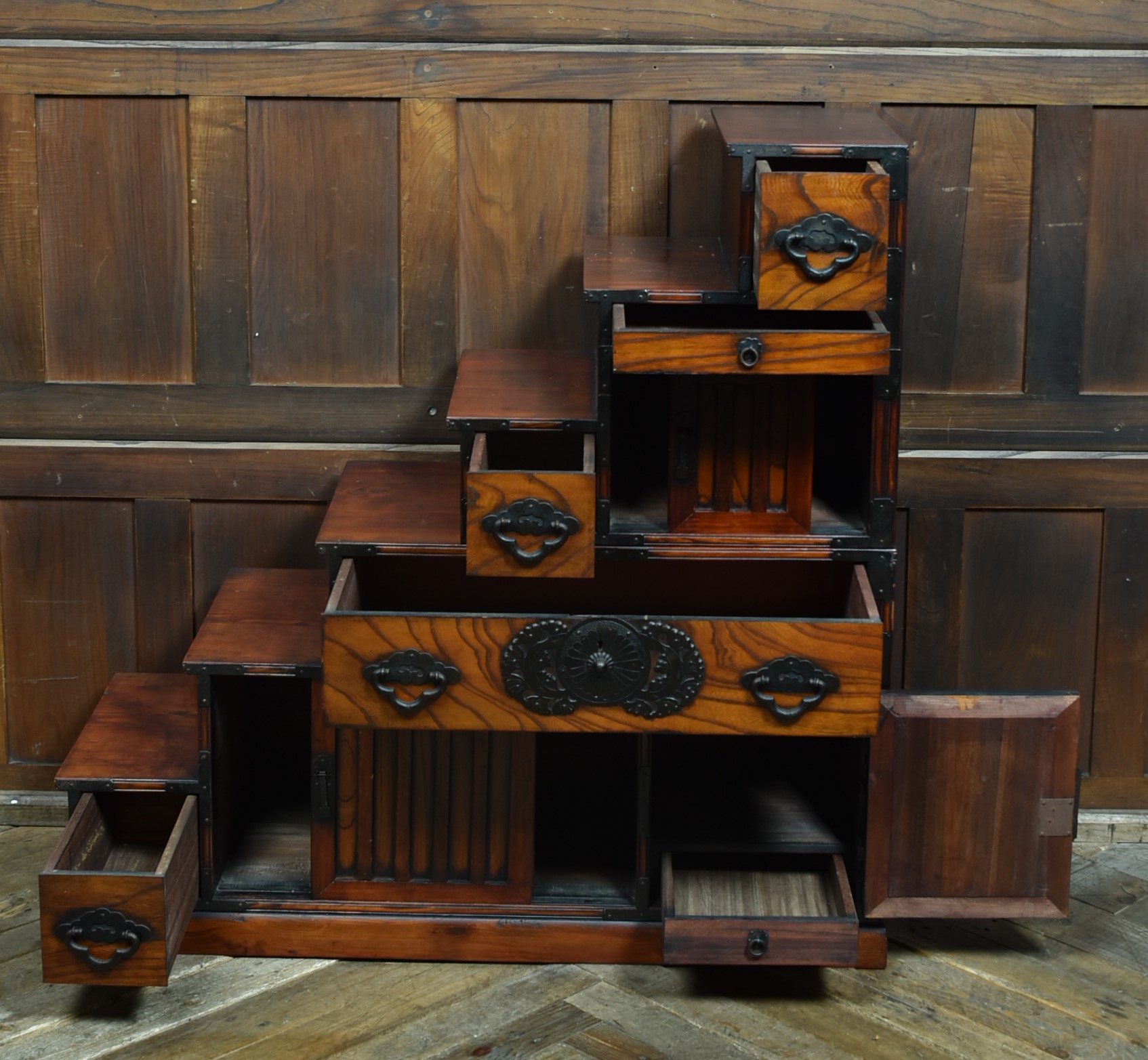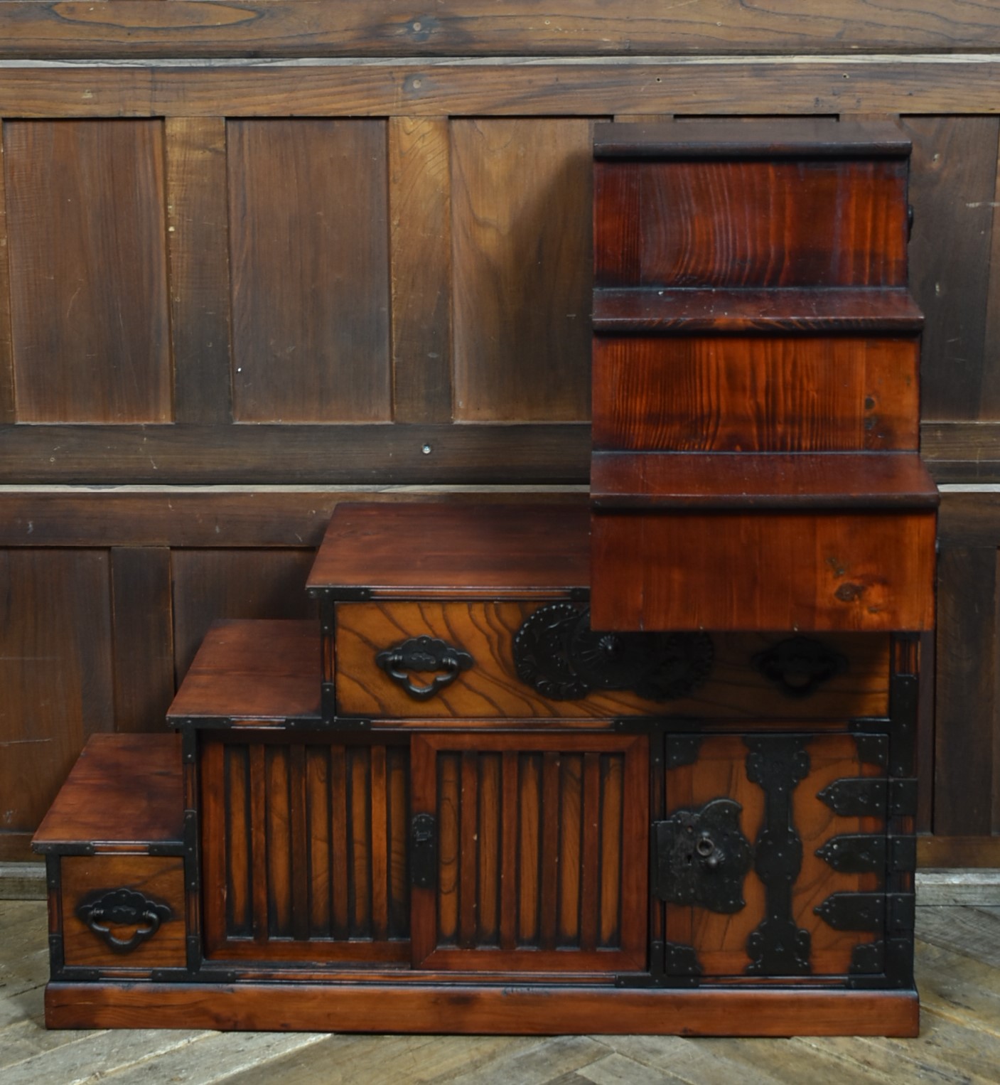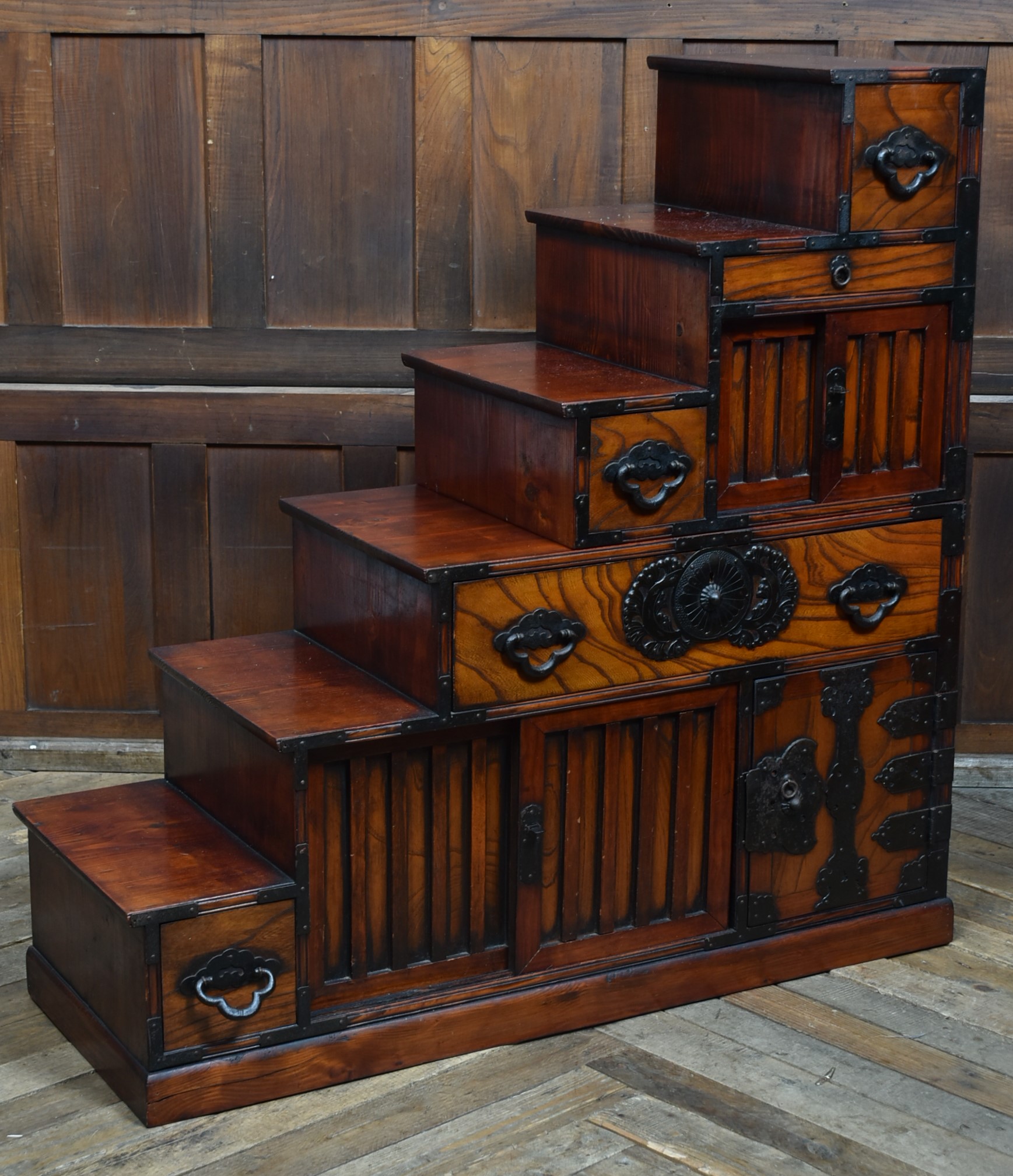 A superb example of traditional Japanese design, this kaidan tansu—or step chest in excellent antique condition. A single-sided step chest conveniently separates into two sections for ease of movement throughout the home. Crafted from richly patinated hardwood, its design features a tiered arrangement of compartments, each adorned with ornate iron handles and decorative escutcheons. Designed for wall placement, it features sliding doors, hinged compartments, and drawers, all fitted with original iron hardware. Originally conceived to serve as both storage and staircase in Meiji-era merchant houses, this piece embodies the ingenuity and elegance of Japanese craftsmanship. Its bold form, natural finish, and practical layout make it a standout feature in any interior—classic or modern.