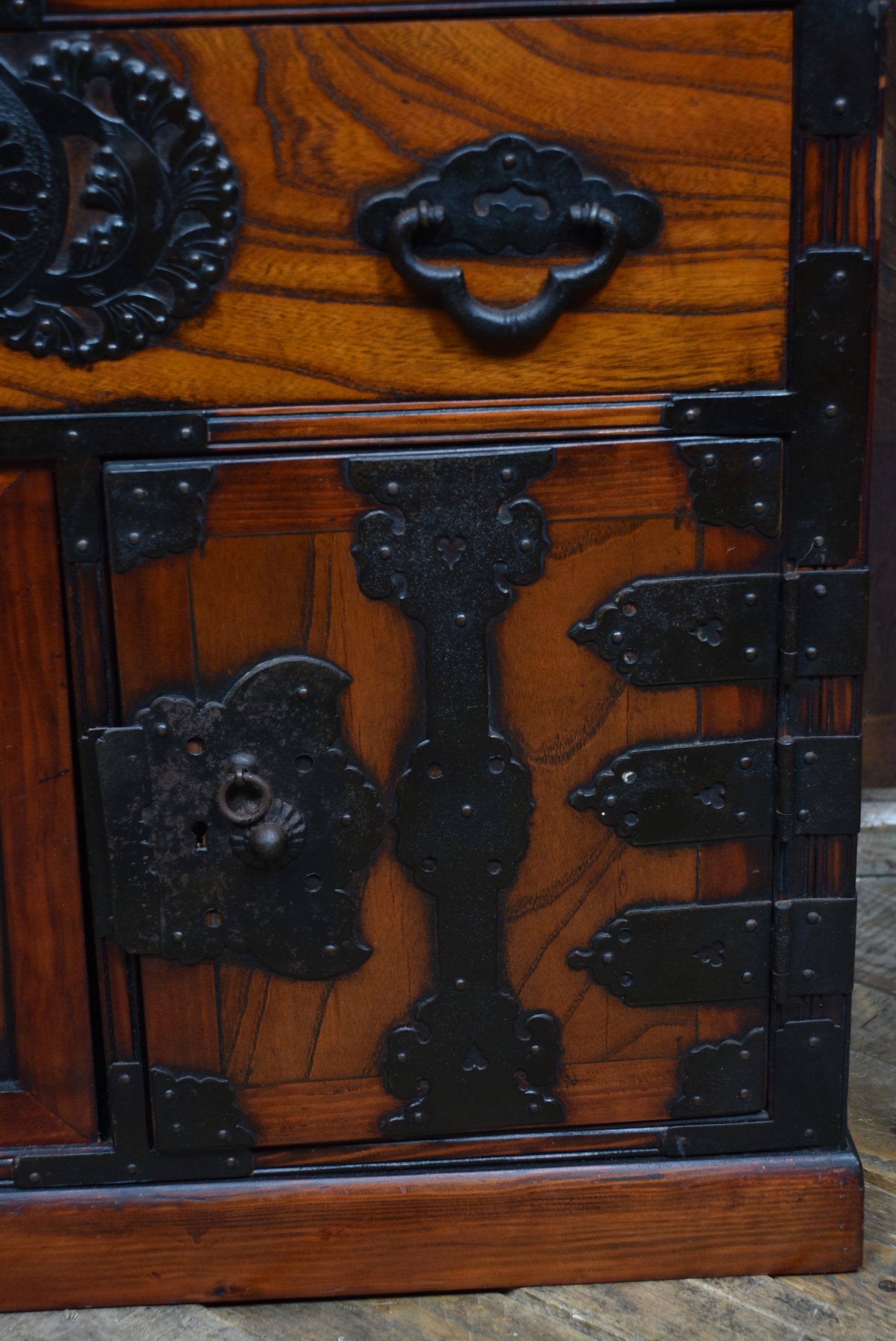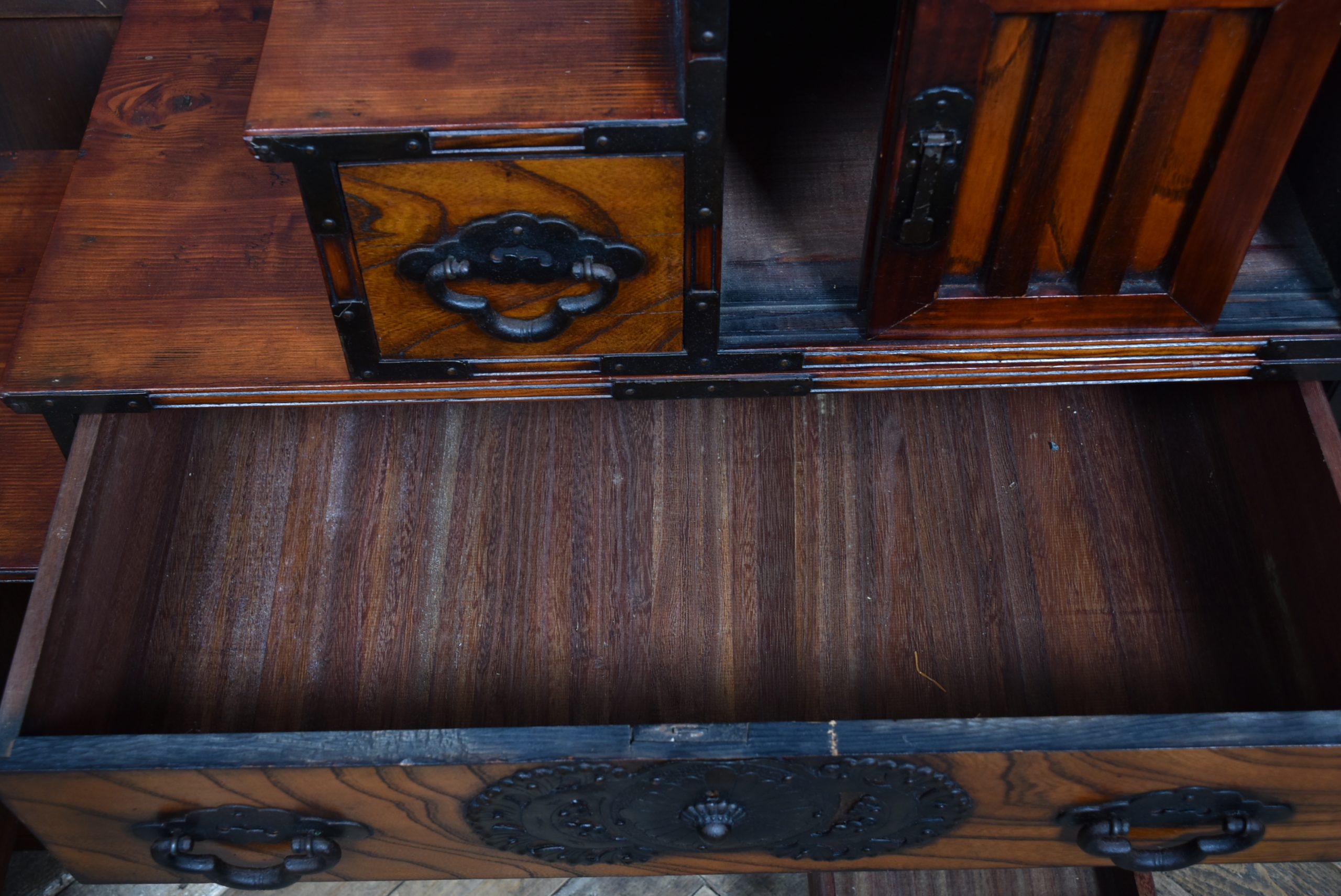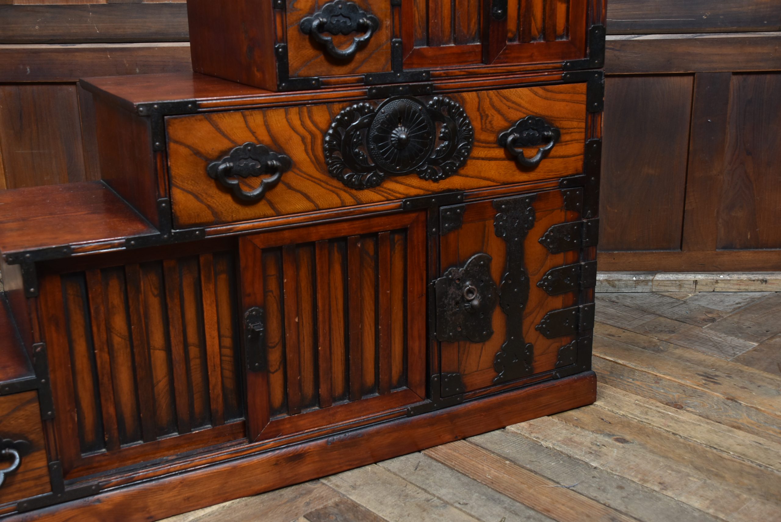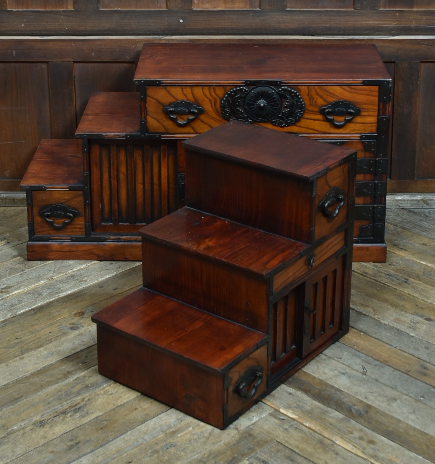A superb example of traditional Japanese design, this kaidan tansu—or step chest in excellent antique condition. A single-sided step chest conveniently separates into two sections for ease of movement throughout the home. Crafted from richly patinated hardwood, its design features a tiered arrangement of compartments, each adorned with ornate iron handles and decorative escutcheons. Designed for wall placement, it features sliding doors, hinged compartments, and drawers, all fitted with original iron hardware. Originally conceived to serve as both storage and staircase in Meiji-era merchant houses, this piece embodies the ingenuity and elegance of Japanese craftsmanship. Its bold form, natural finish, and practical layout make it a standout feature in any interior—classic or modern.
