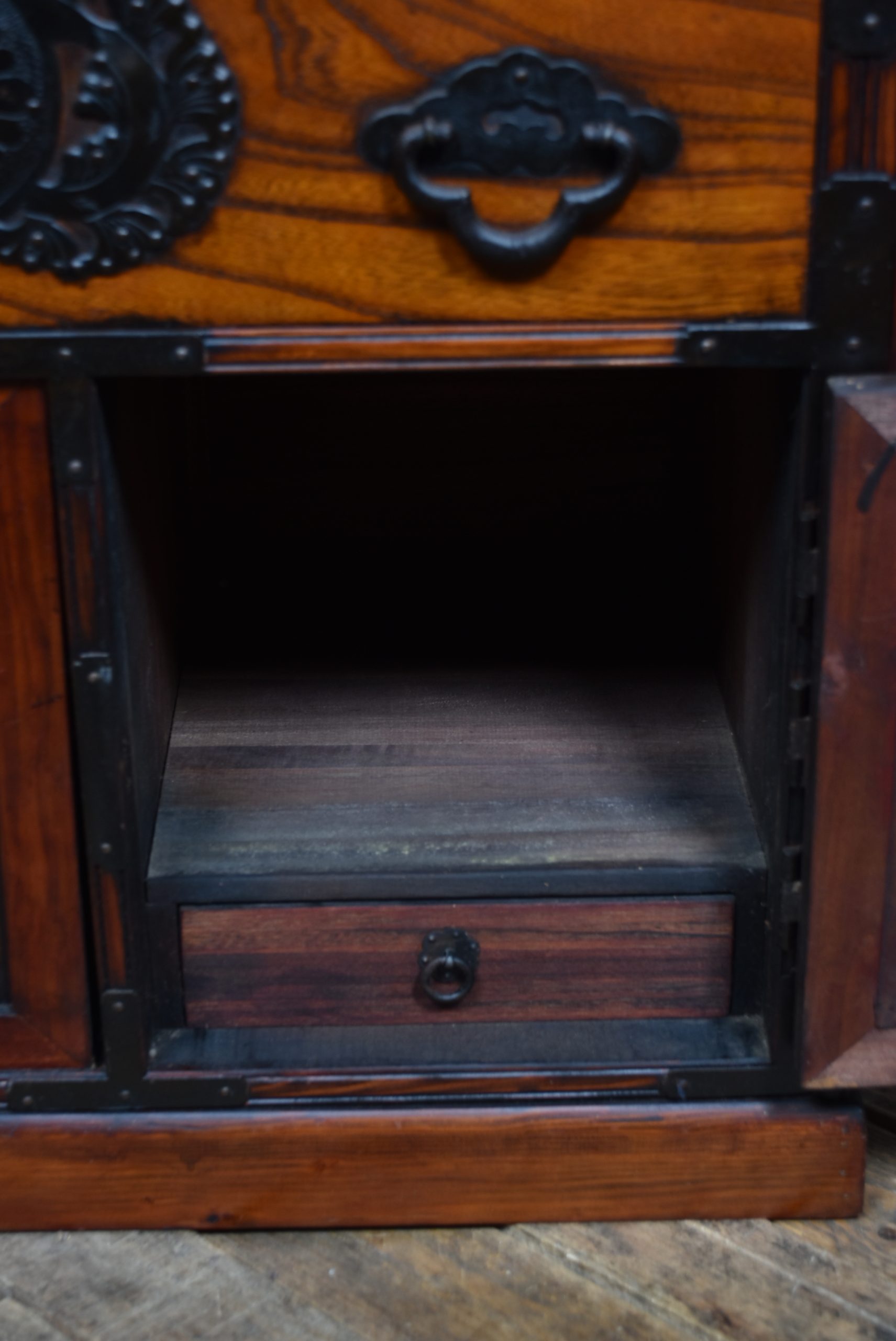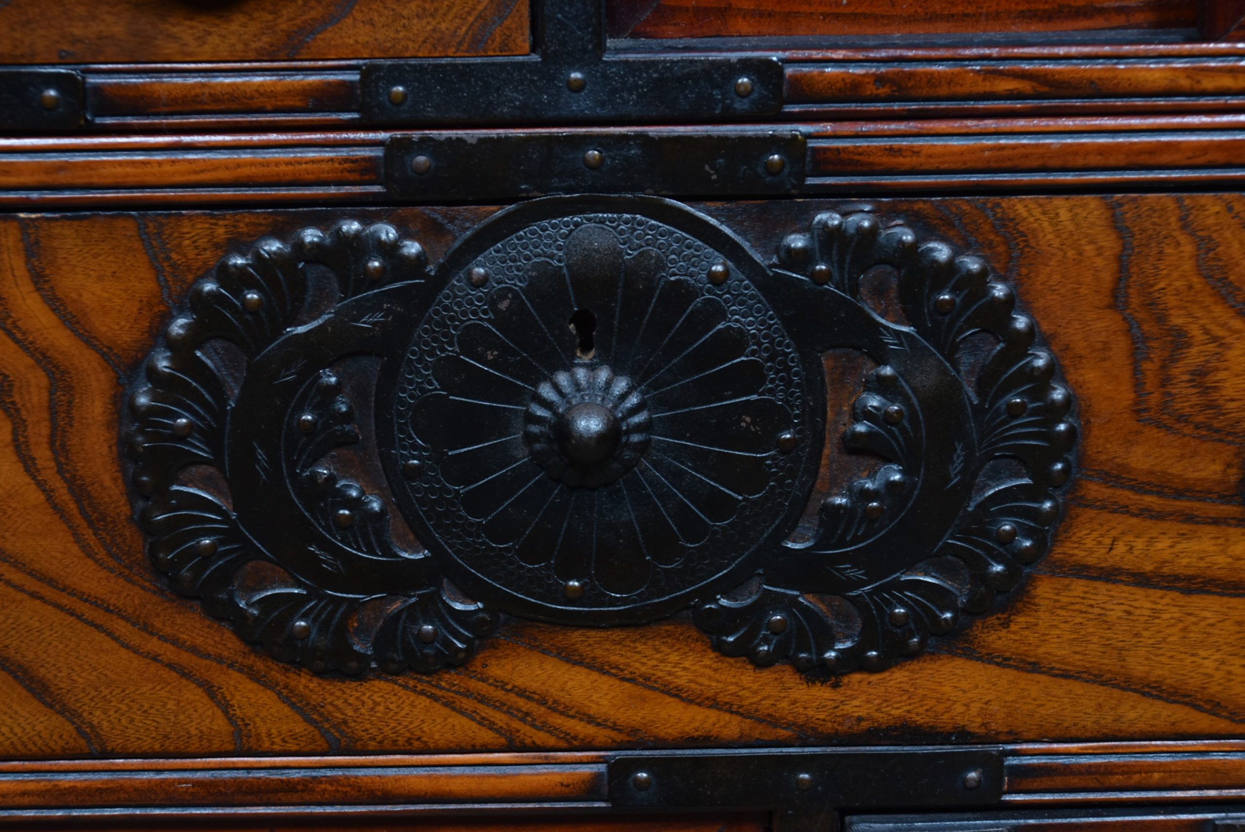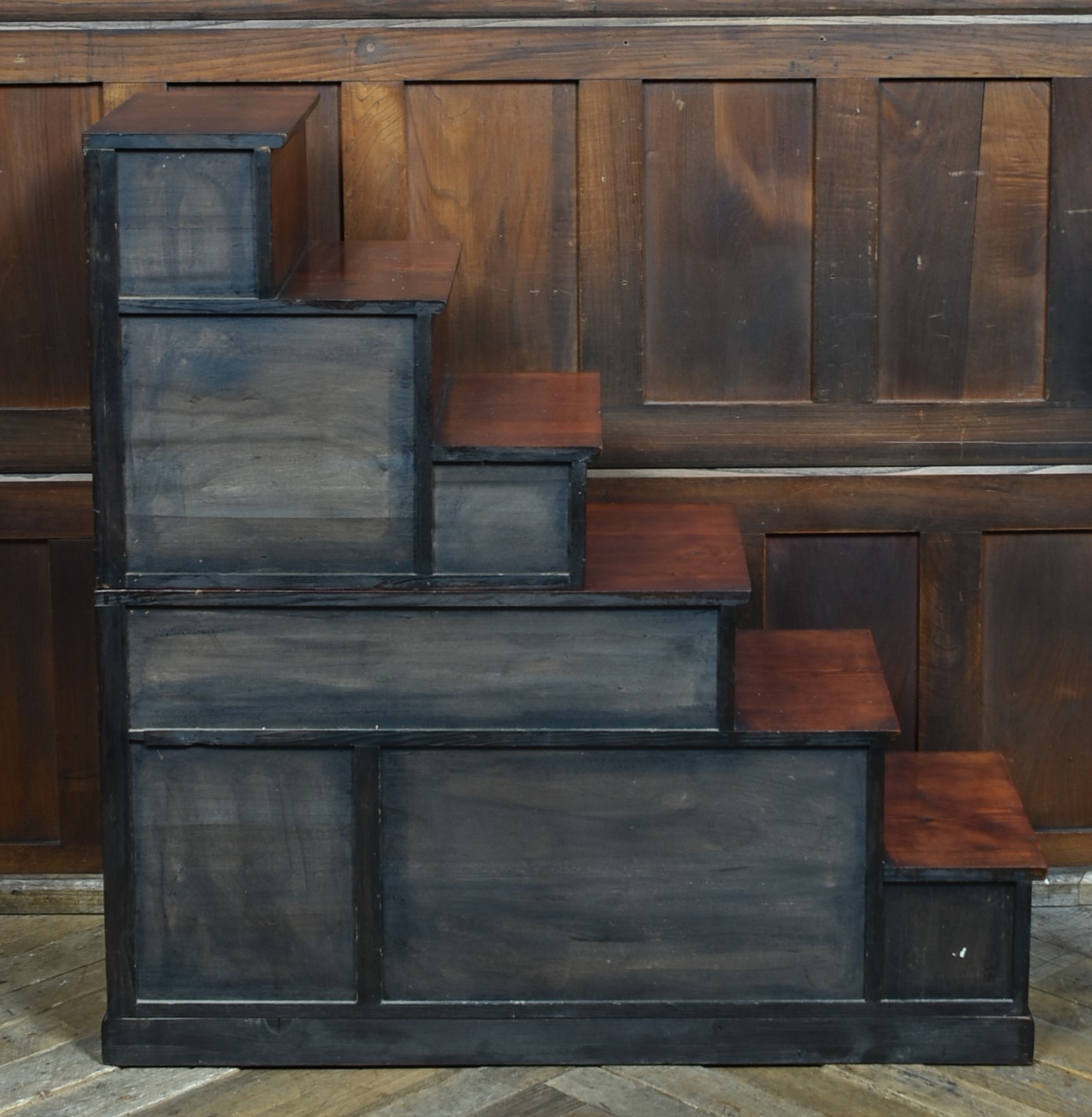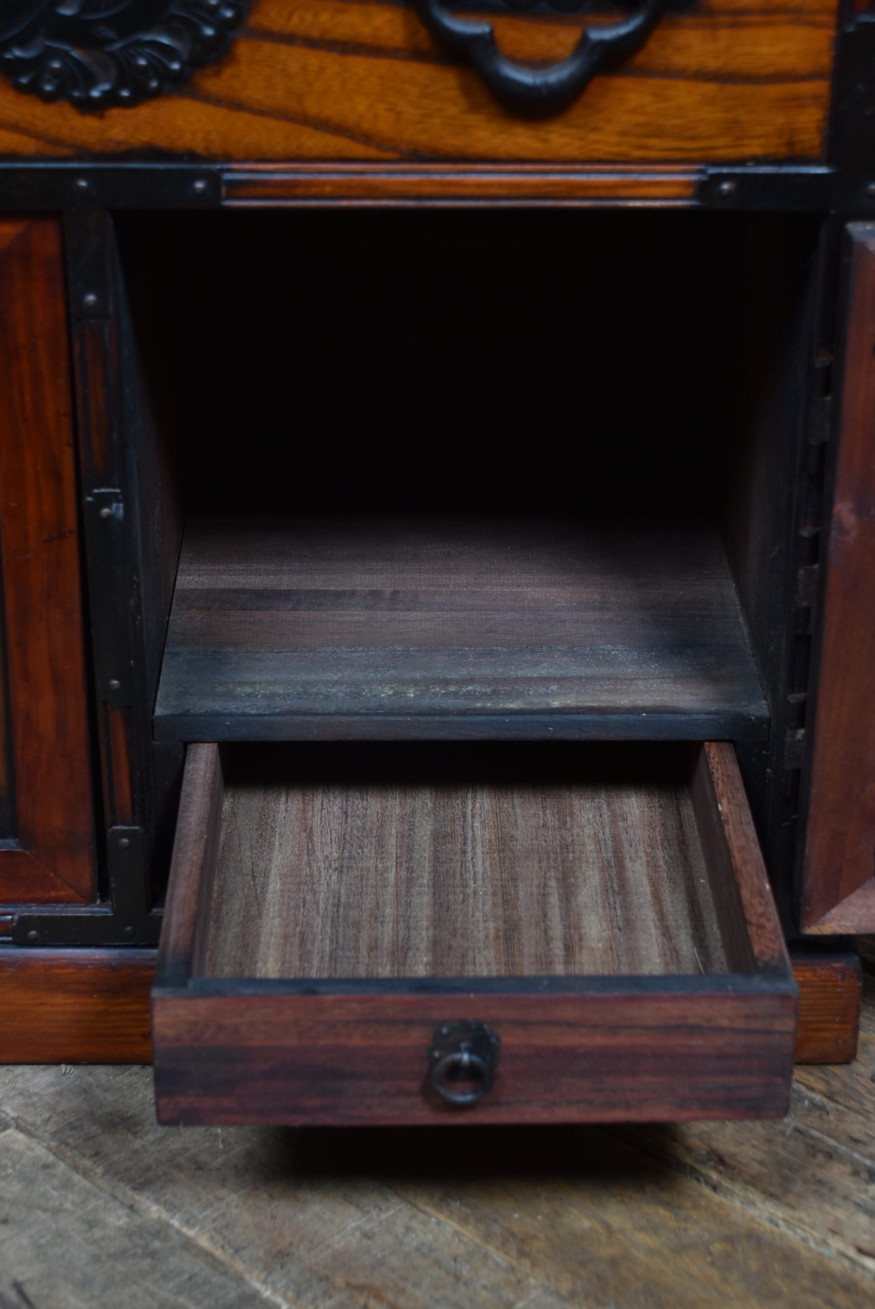 A superb example of traditional Japanese design, this kaidan tansu—or step chest in excellent antique condition. A single-sided step chest conveniently separates into two sections for ease of movement throughout the home. Crafted from richly patinated hardwood, its design features a tiered arrangement of compartments, each adorned with ornate iron handles and decorative escutcheons. Designed for wall placement, it features sliding doors, hinged compartments, and drawers, all fitted with original iron hardware. Originally conceived to serve as both storage and staircase in Meiji-era merchant houses, this piece embodies the ingenuity and elegance of Japanese craftsmanship. Its bold form, natural finish, and practical layout make it a standout feature in any interior—classic or modern.