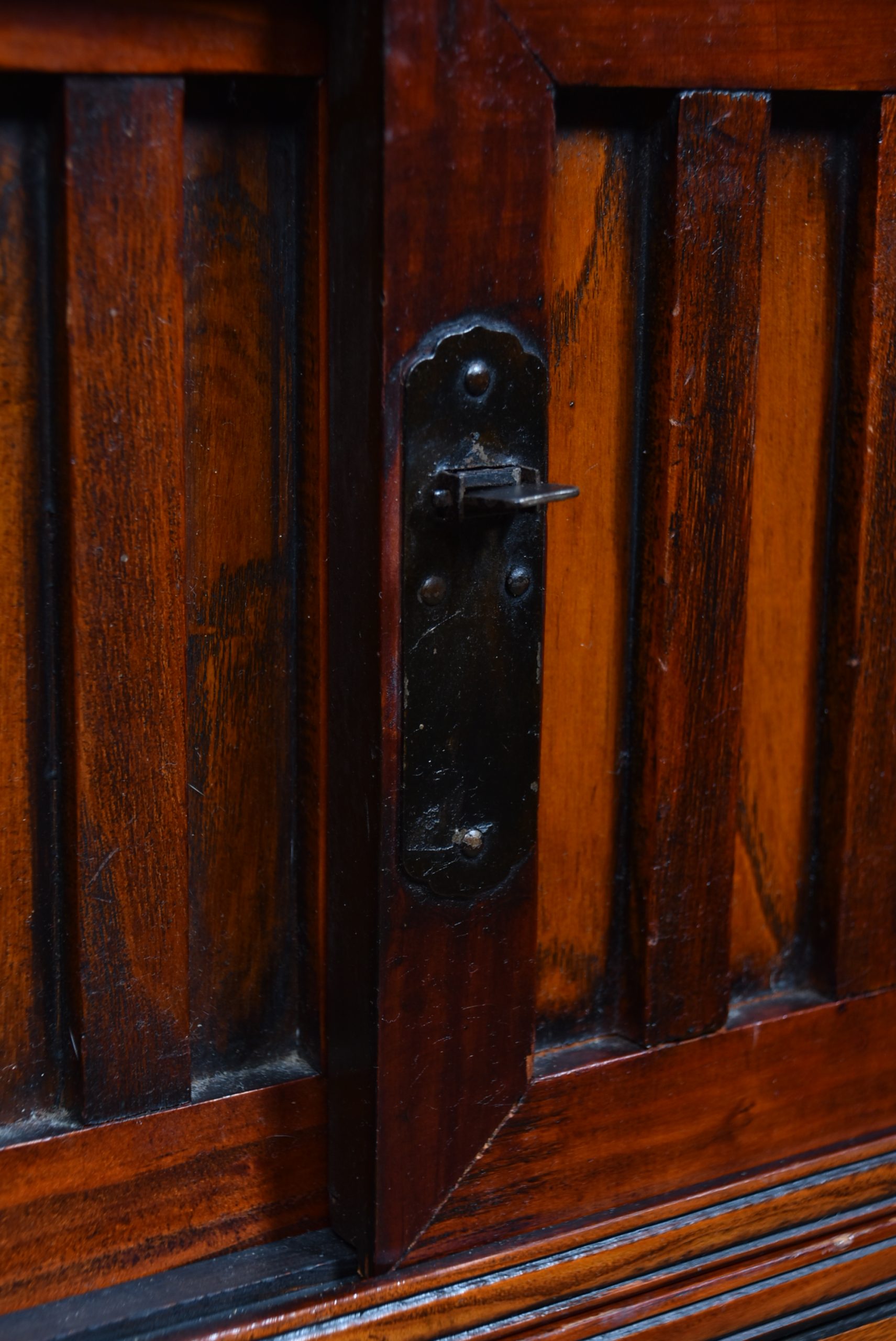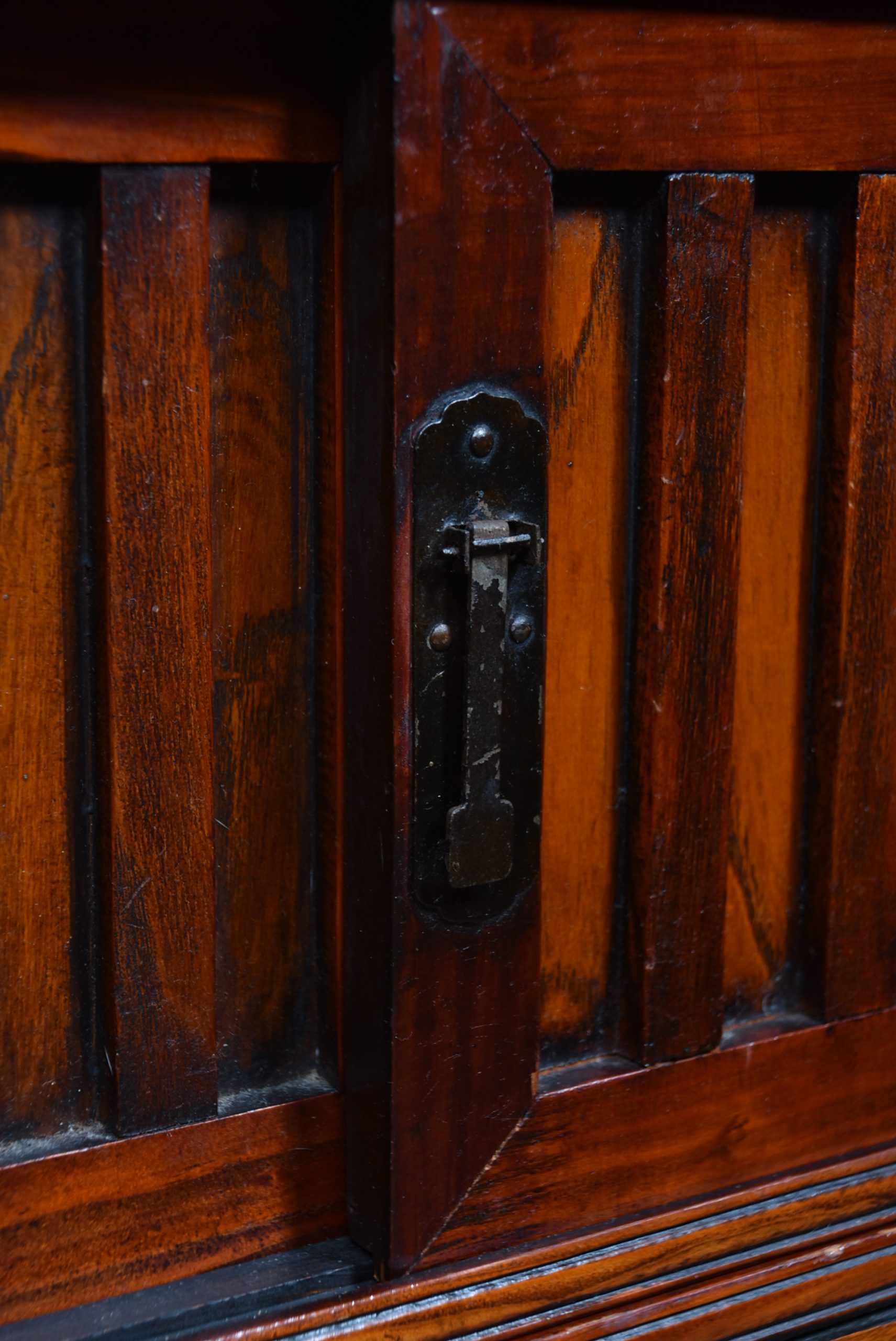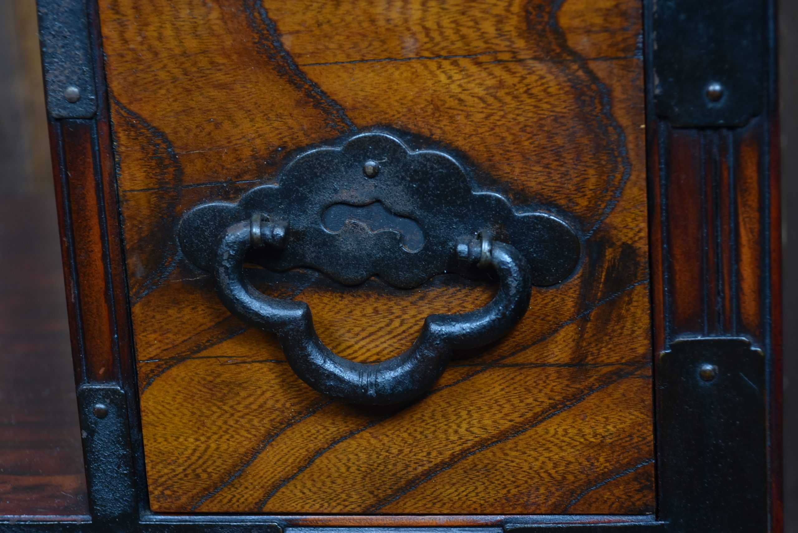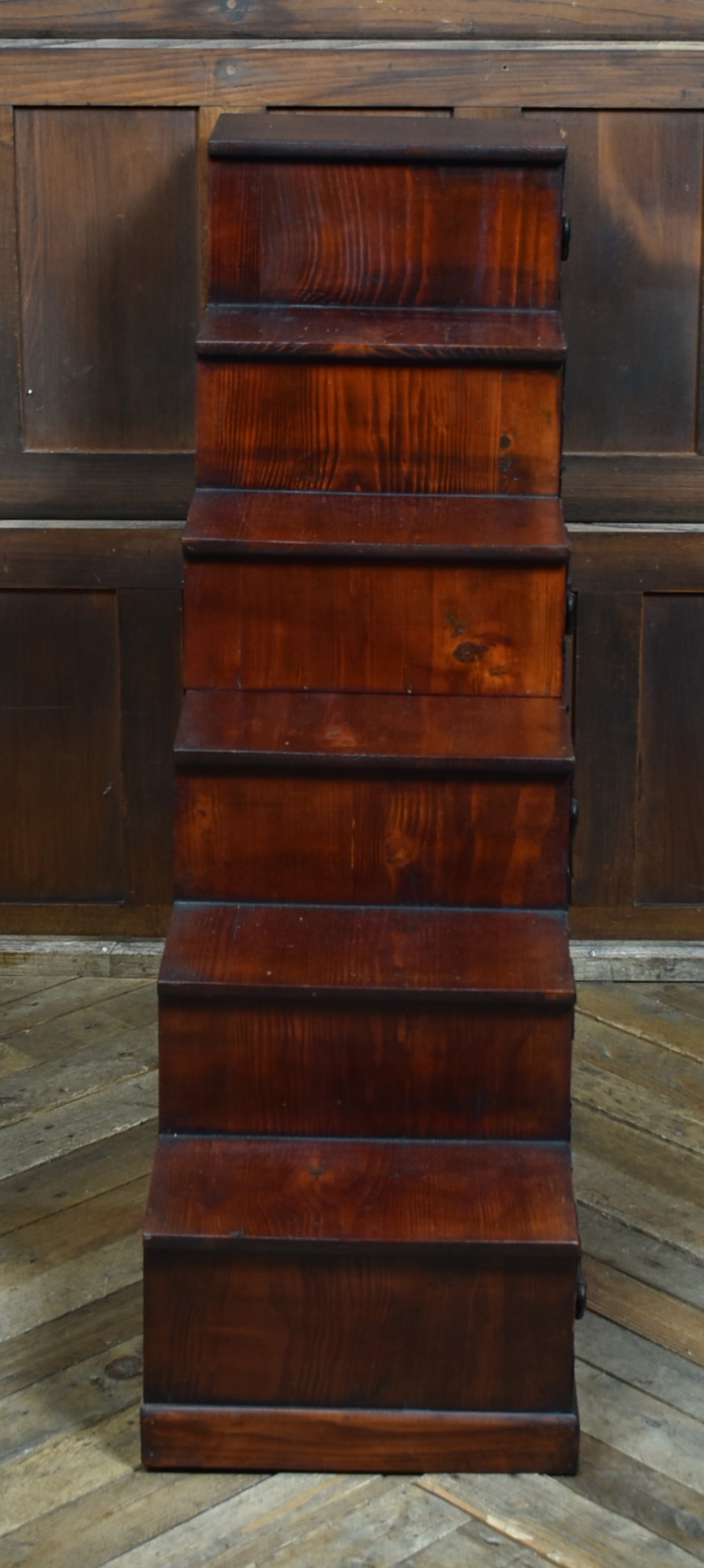 A superb example of traditional Japanese design, this kaidan tansu—or step chest in excellent antique condition. A single-sided step chest conveniently separates into two sections for ease of movement throughout the home. Crafted from richly patinated hardwood, its design features a tiered arrangement of compartments, each adorned with ornate iron handles and decorative escutcheons. Designed for wall placement, it features sliding doors, hinged compartments, and drawers, all fitted with original iron hardware. Originally conceived to serve as both storage and staircase in Meiji-era merchant houses, this piece embodies the ingenuity and elegance of Japanese craftsmanship. Its bold form, natural finish, and practical layout make it a standout feature in any interior—classic or modern.