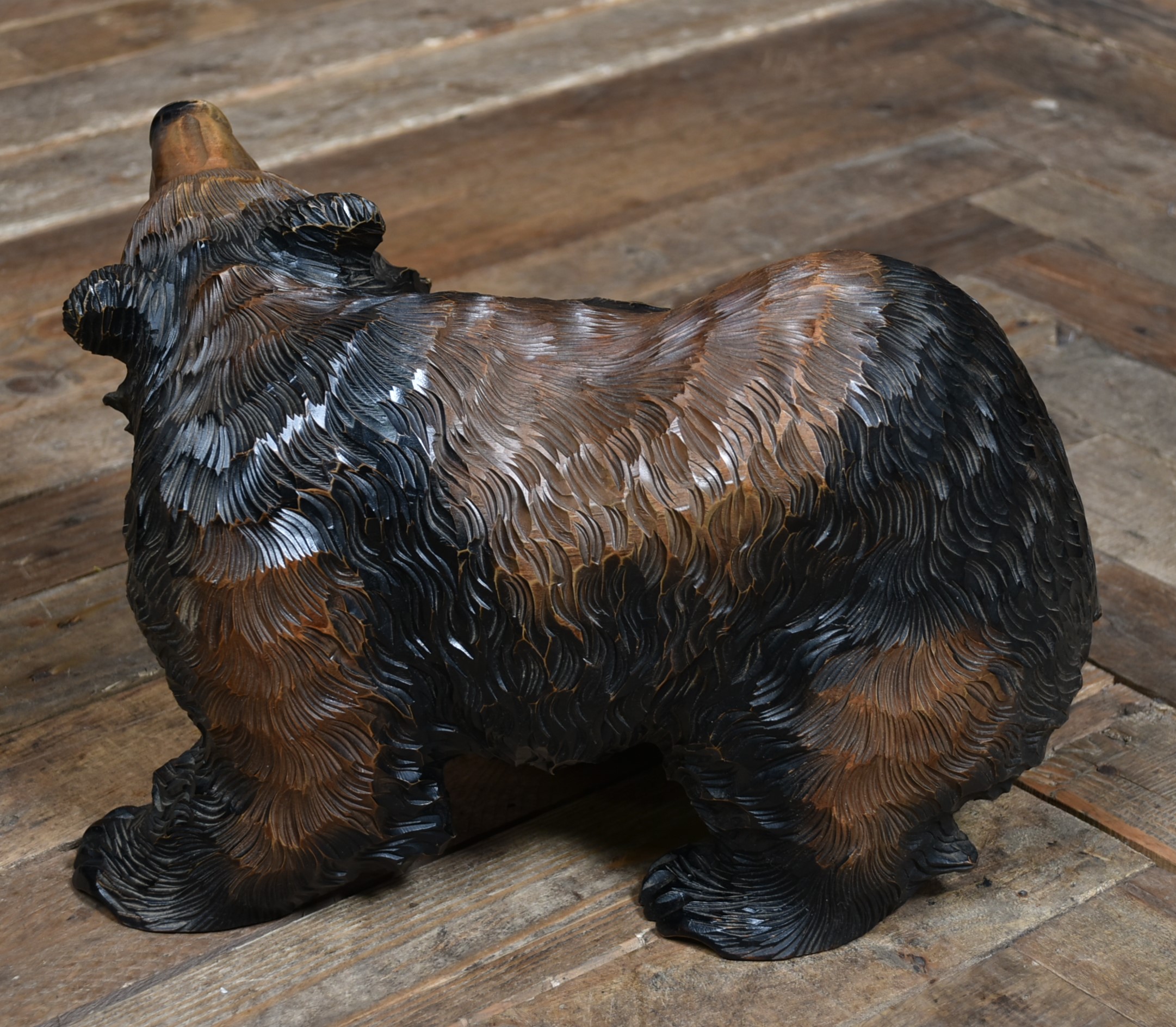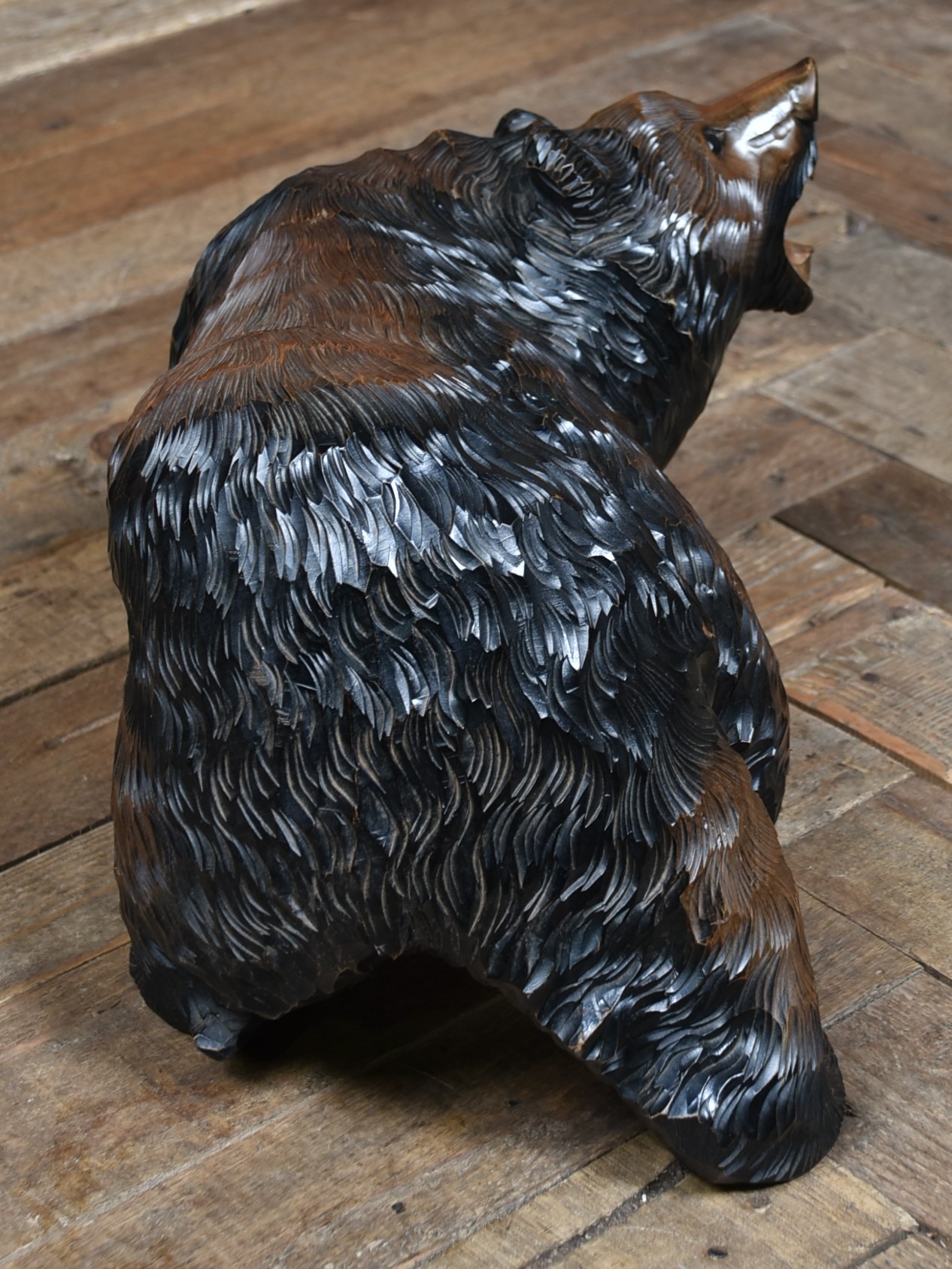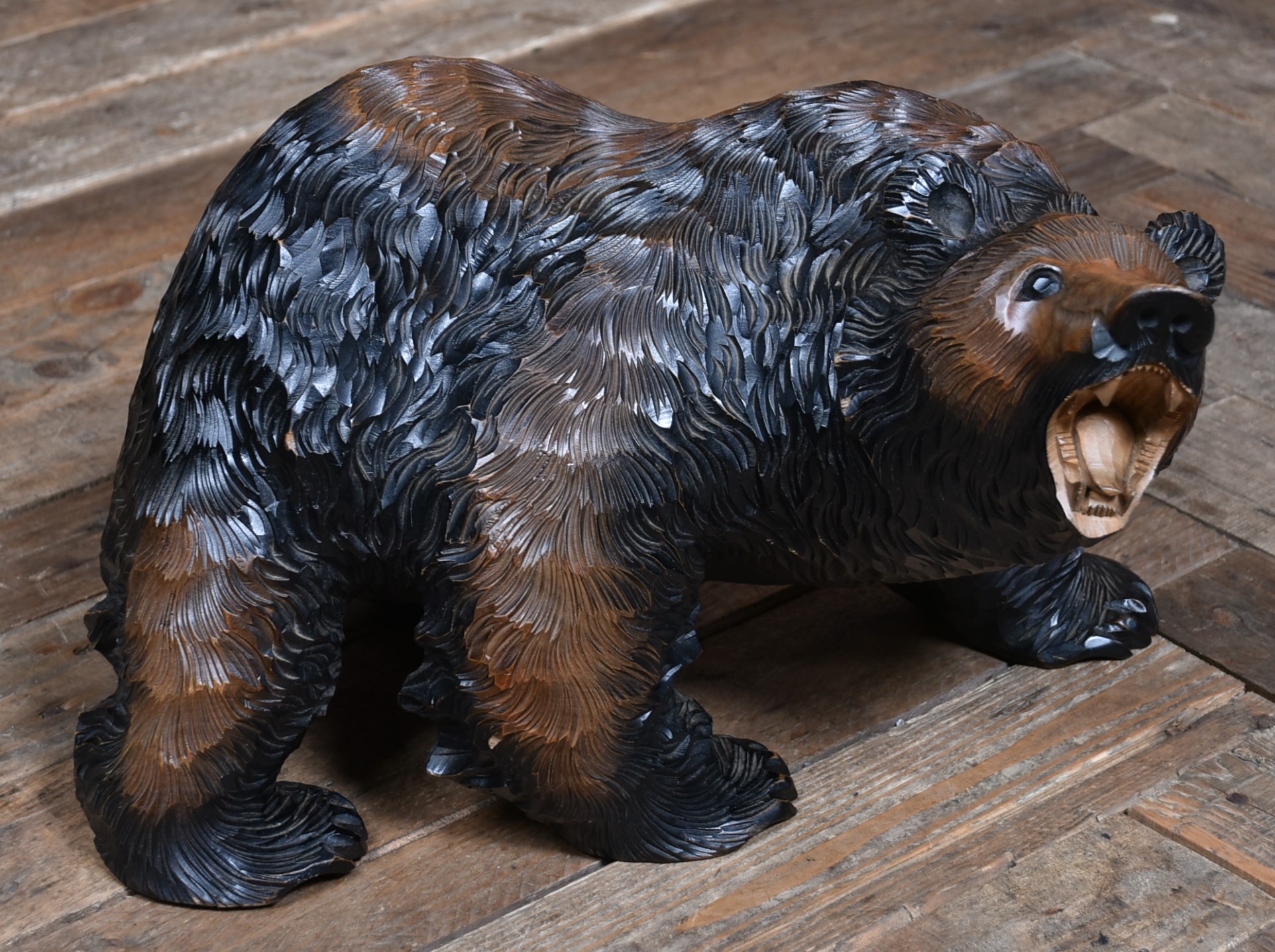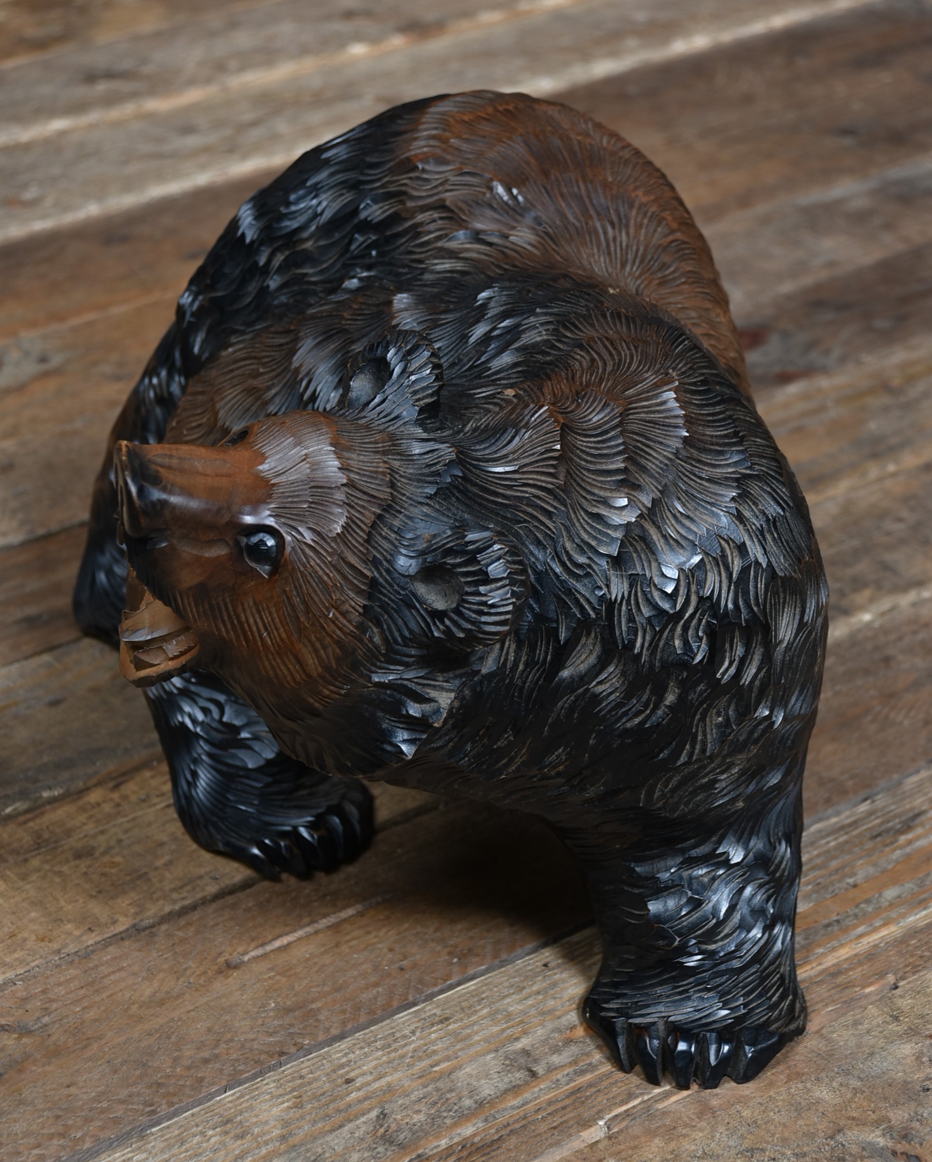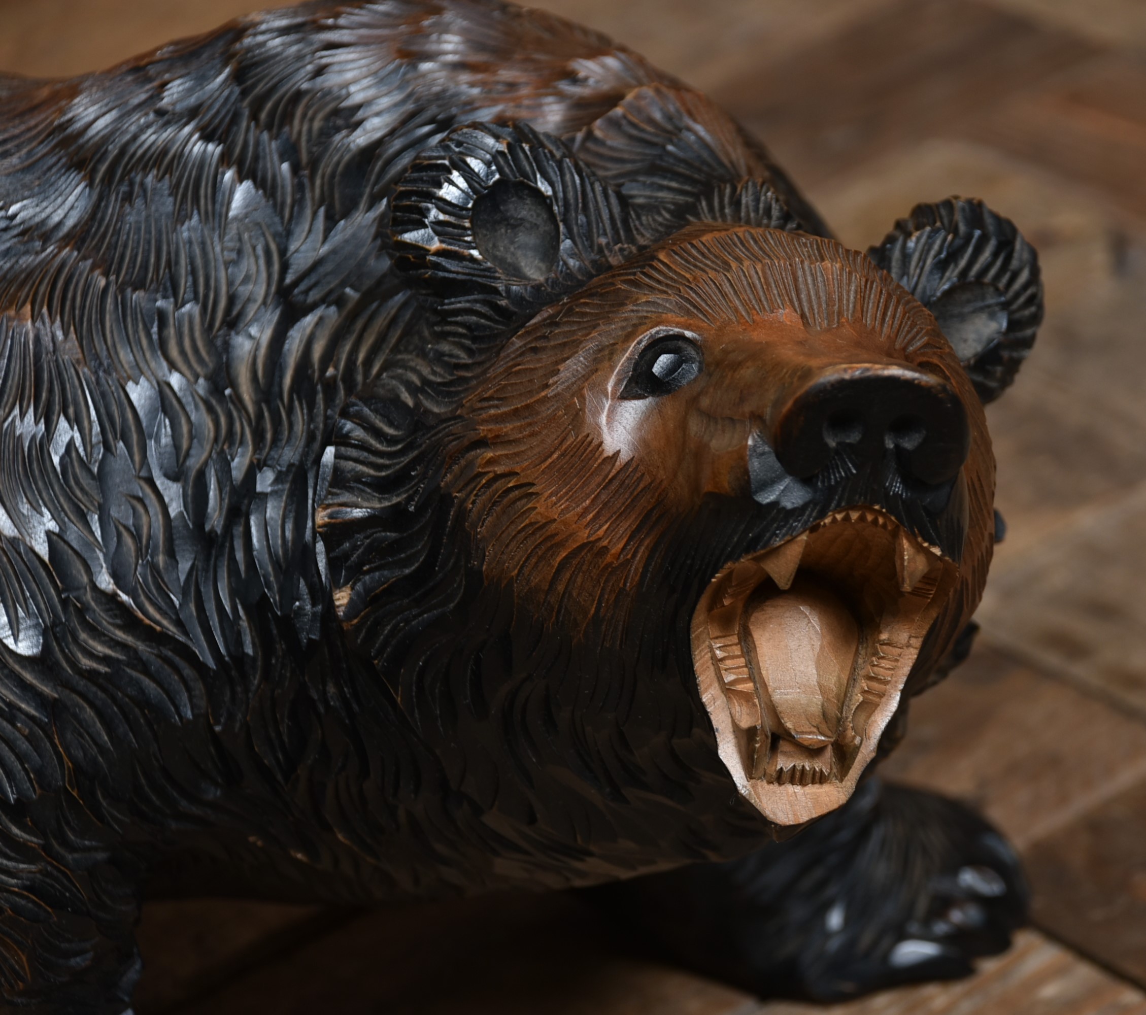 A beautifully carved Japanese wooden bear in excellent antique condition. The bear is captured mid-stride with its jaws open, creating a dynamic and expressive pose. The two-toned timber has been worked to produce a rich, textured surface that evokes the depth and movement of real fur, while darkened accents emphasise the contours and dramatic facial expression, giving the piece a striking sense of life and presence. A classic example of Kibori Kuma carving, it reflects both the cultural tradition and the exceptional craftsmanship associated with these iconic bears.