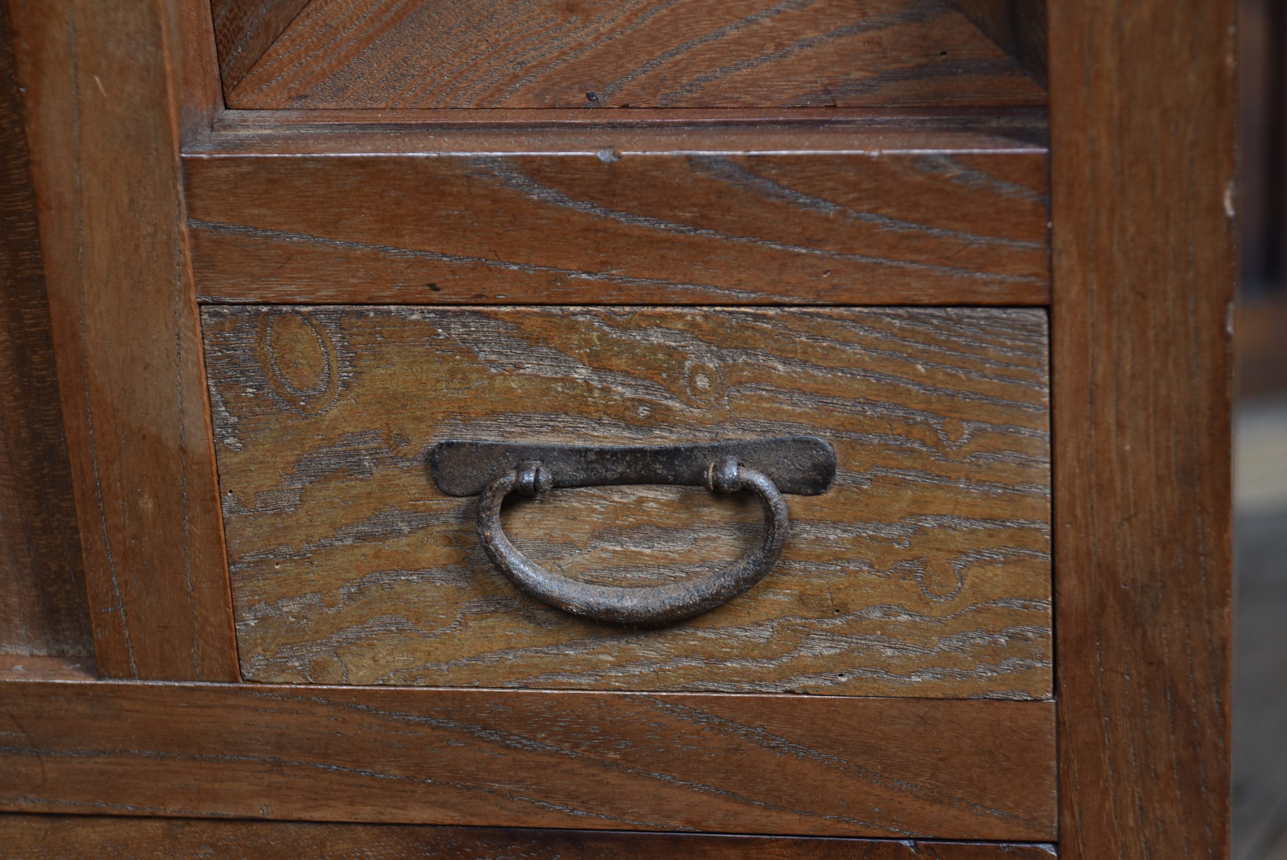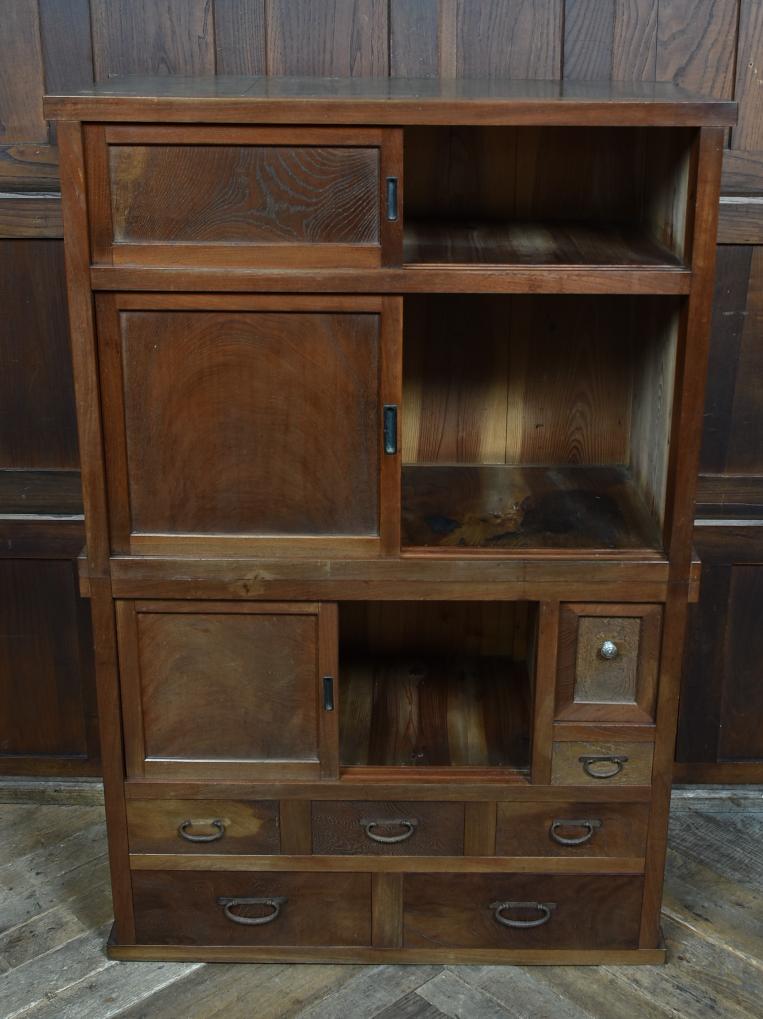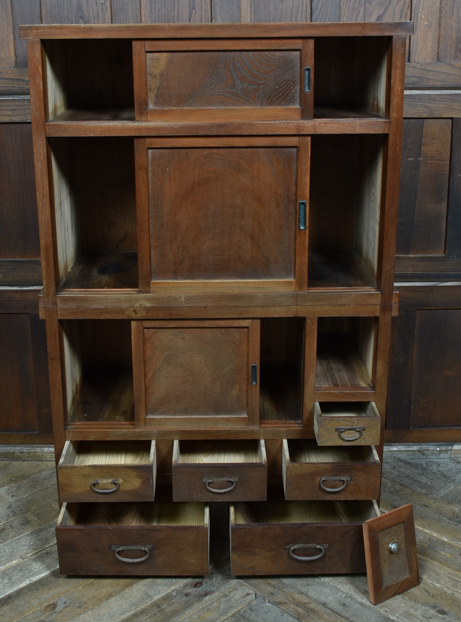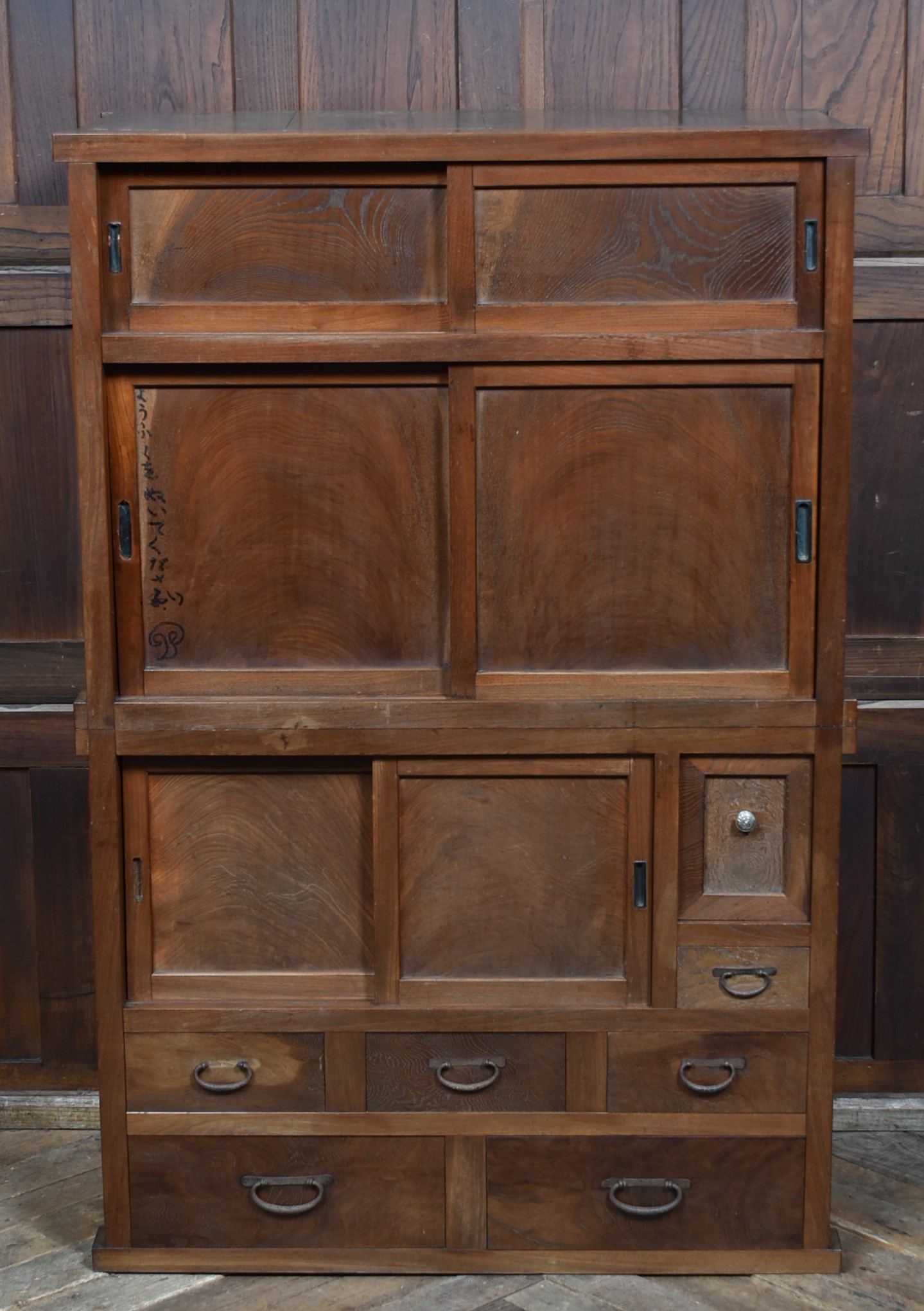 A superb Japanese cedar mizuya chest in excellent antique condition, separating into two sections for easy movement. The top section has two sliding cupboards, one retaining its original hand‑brushed inscription “Yamamoto,” giving the piece strong authenticity. Below are multiple drawers with original iron loop handles and a rich, aged patina. The dark ironwork pairs beautifully with the warm, well‑figured cedar grain. A decorative and practical tansu, perfect for kitchens, hallways, or modern interiors needing a striking statement piece.