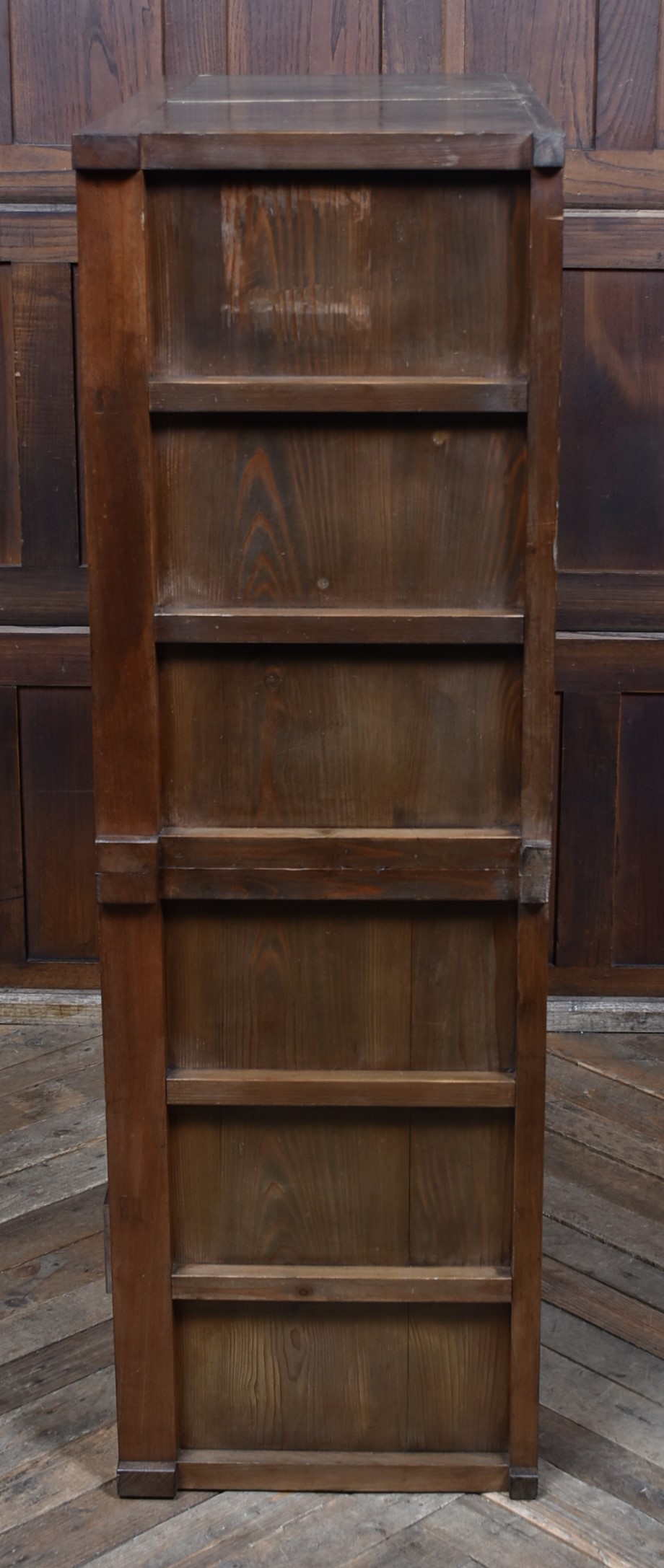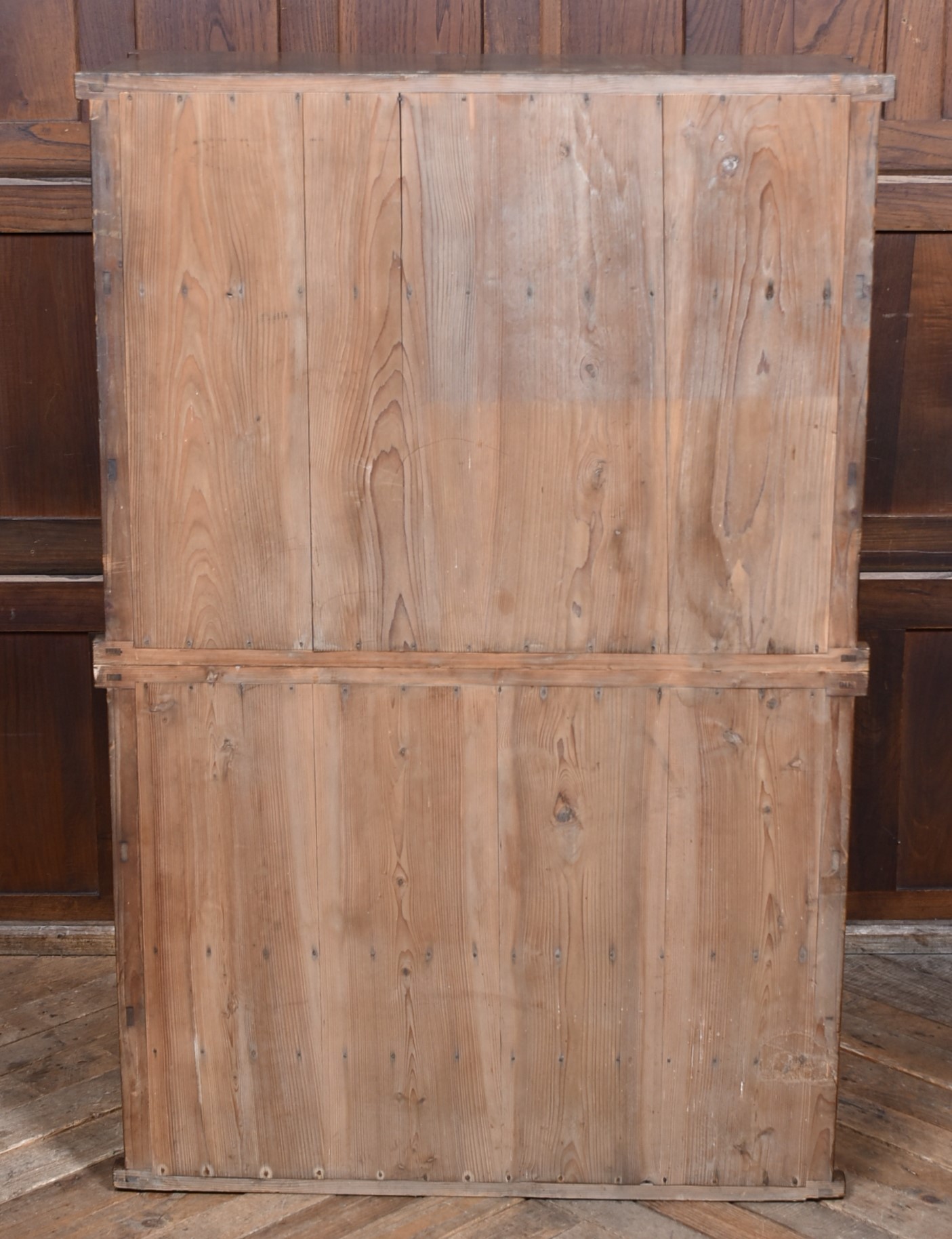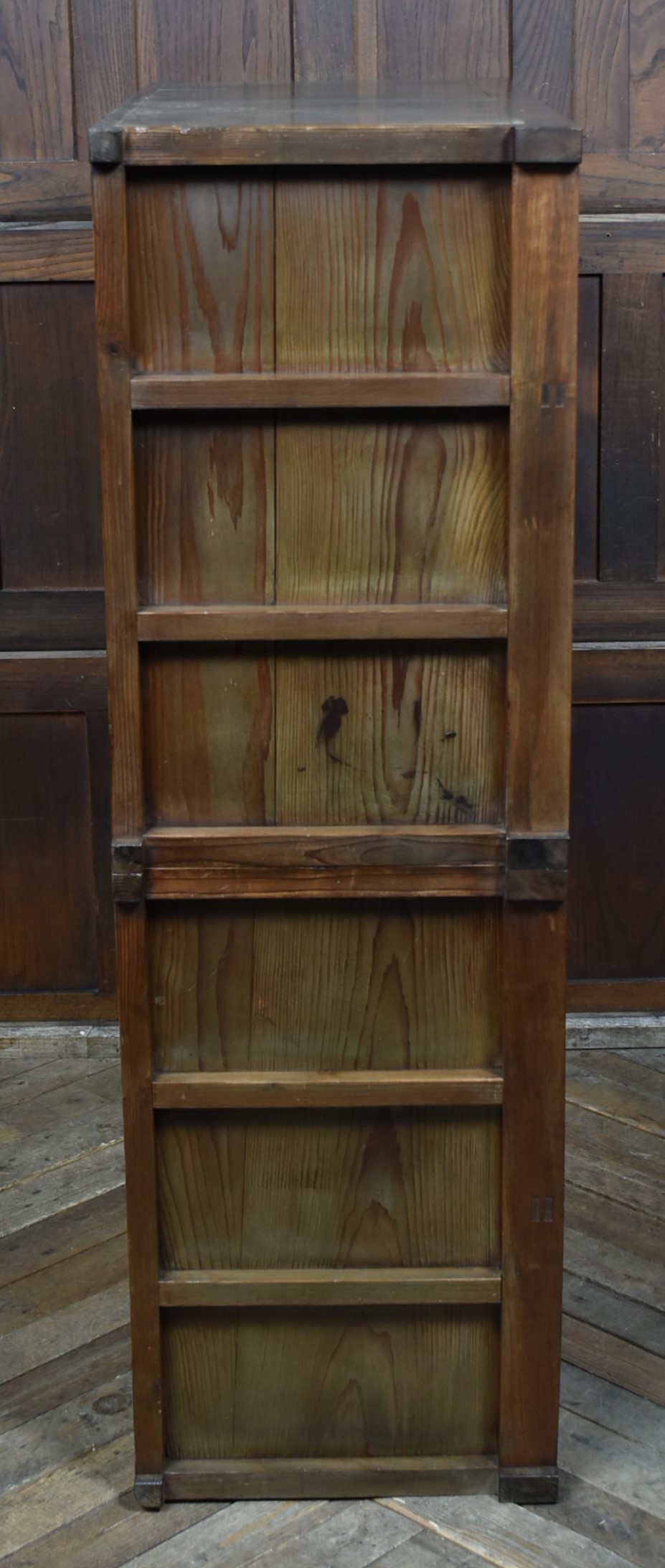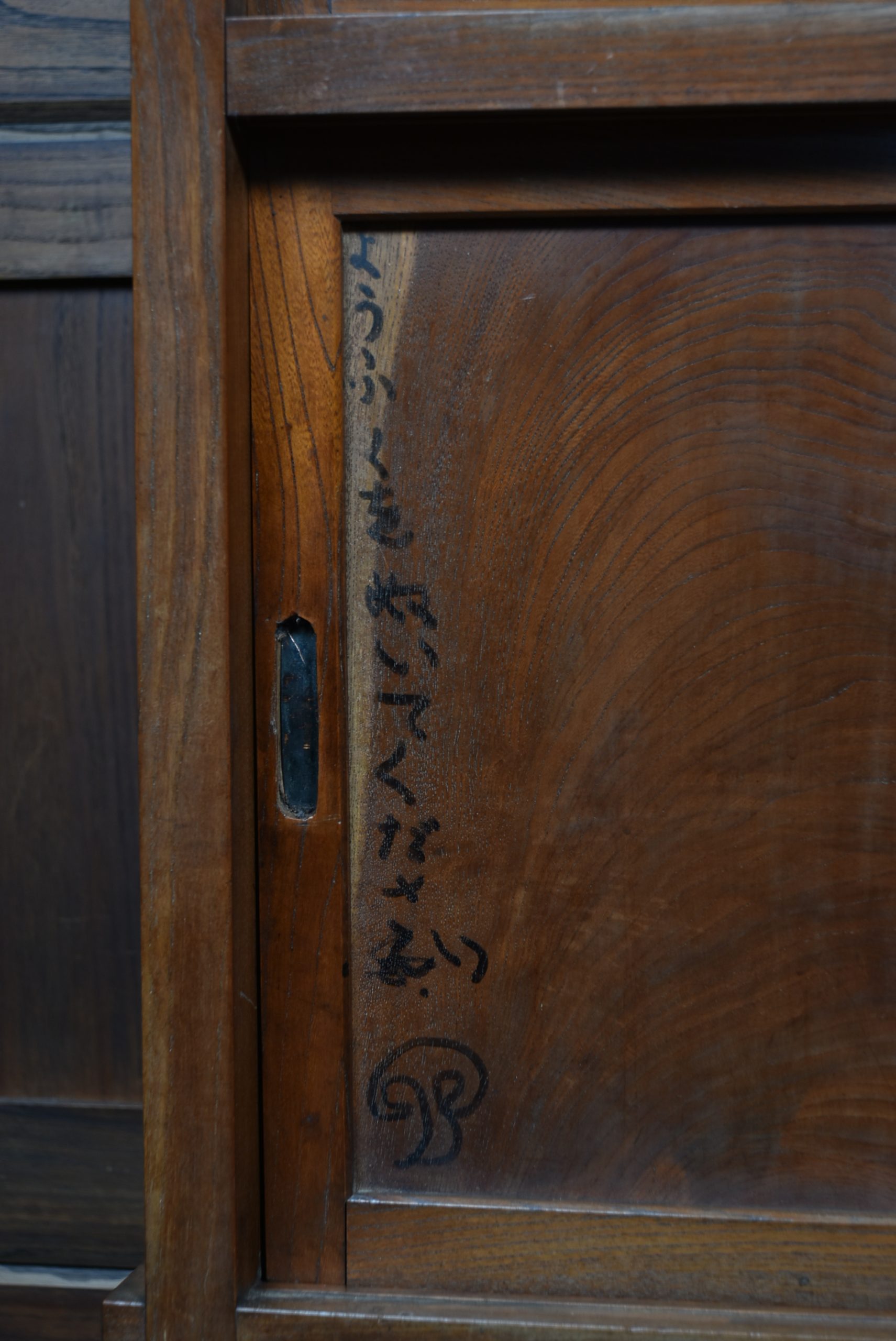 A superb Japanese cedar mizuya chest in excellent antique condition, separating into two sections for easy movement. The top section has two sliding cupboards, one retaining its original hand‑brushed inscription “Yamamoto,” giving the piece strong authenticity. Below are multiple drawers with original iron loop handles and a rich, aged patina. The dark ironwork pairs beautifully with the warm, well‑figured cedar grain. A decorative and practical tansu, perfect for kitchens, hallways, or modern interiors needing a striking statement piece.