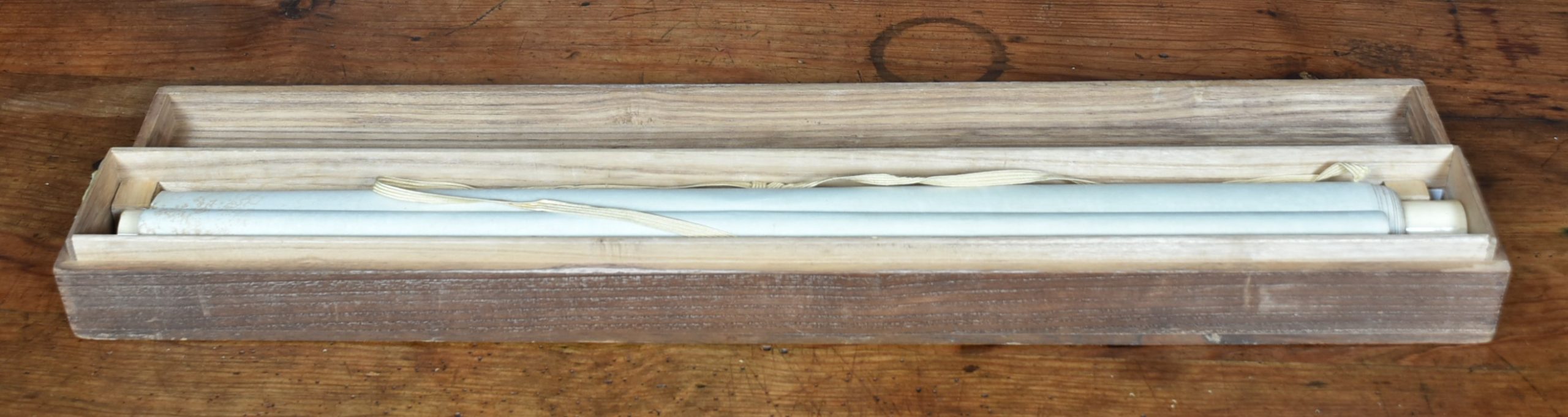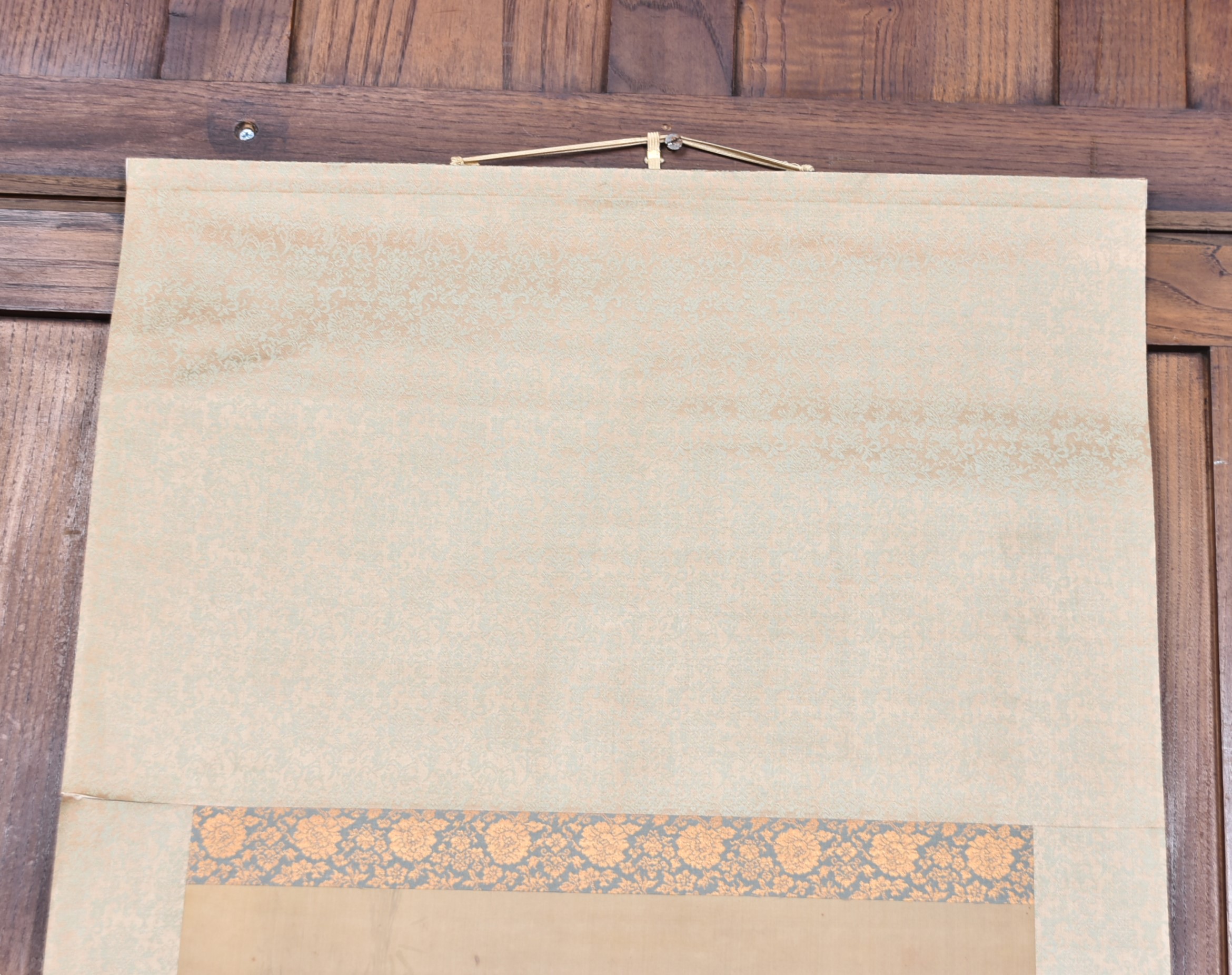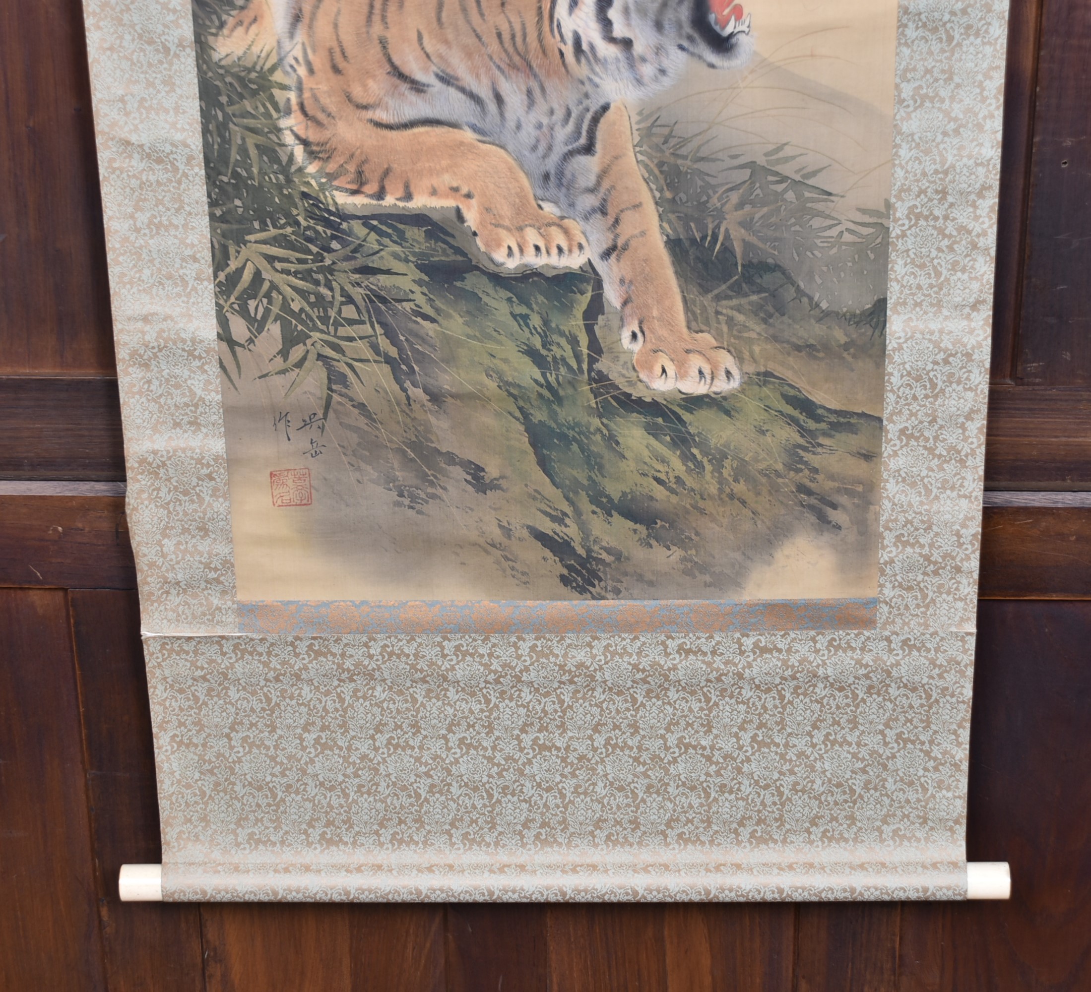 A dramatic and finely executed silk scroll painting by Japanese artist Sakuba, complete with its original storage box.. The Scroll depicting a tiger poised on a rocky outcrop beneath a full moon. The bold brushwork and subtle washes capture the animal’s raw intensity—mouth agape, muscles taut—symbolic of strength and courage in East Asian tradition. Set against misty mountains and windswept trees, the scene evokes solitude and wild majesty. The scroll is bordered in ornate brocade and mounted on a wooden panel for display. Likely mid-20th century, this piece reflects technical mastery and cultural depth. A striking decorative work, ideal for collectors of Japanese art or those drawn to expressive wildlife imagery.