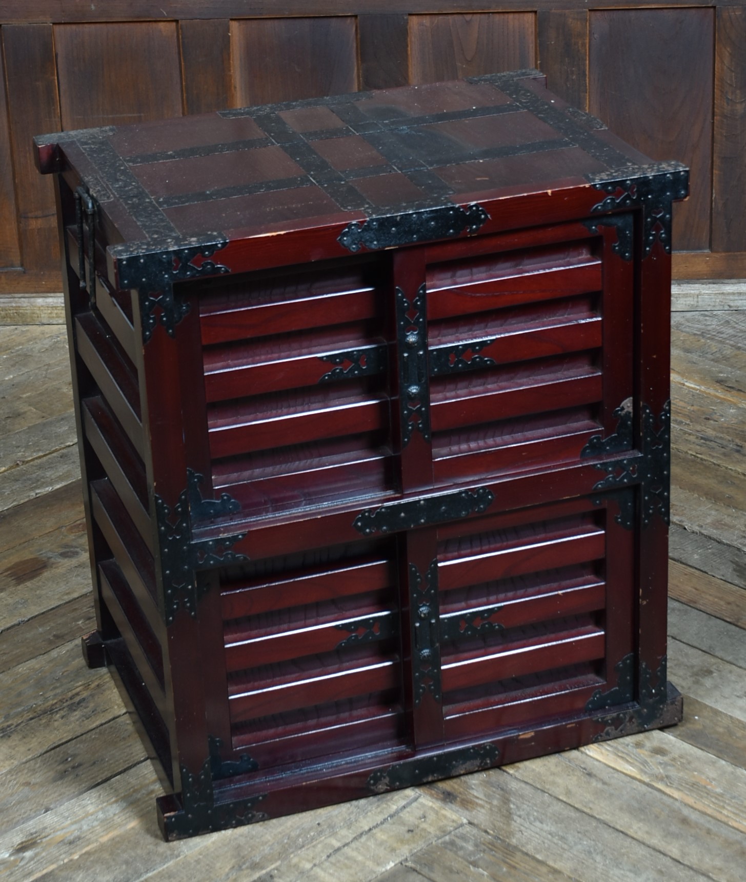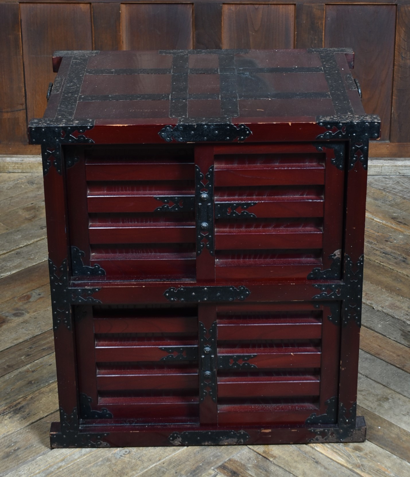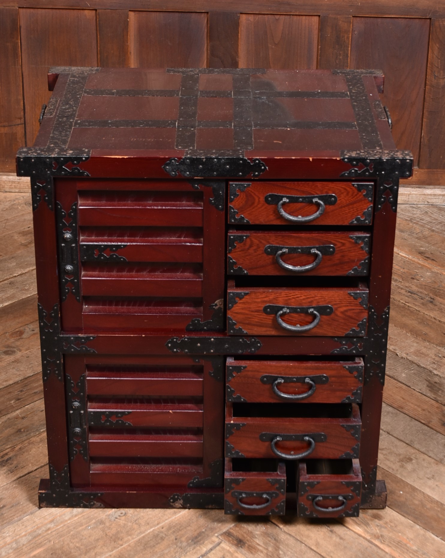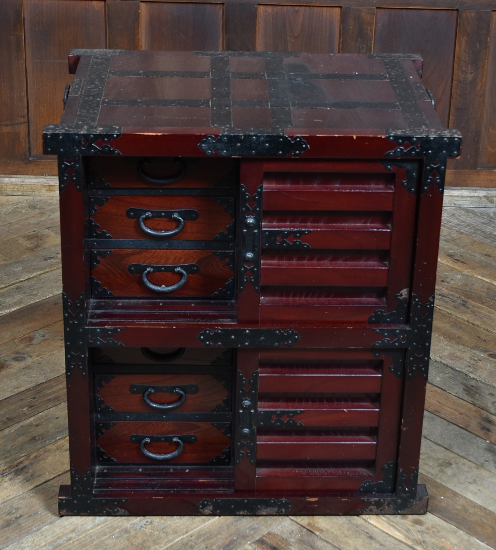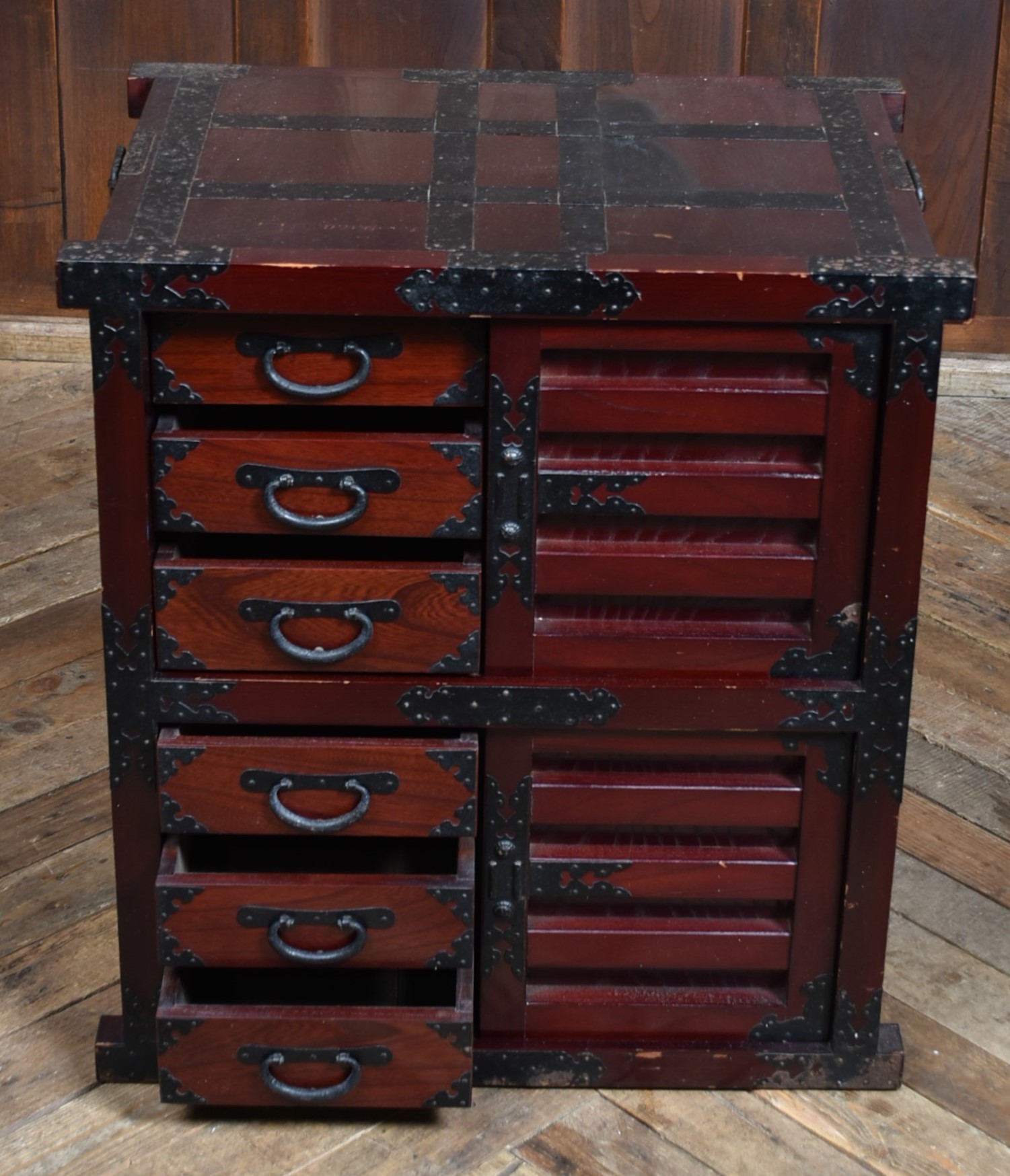 A traditional Japanese Tansu chest, crafted in richly toned wood and accented with blackened iron hardware. This piece features a balanced combination of sliding slatted doors and drawers of varying sizes, reflecting the practical elegance of Edo-period cabinetry. The iron corner brackets and handles provide both structural integrity and visual rhythm, while the layout suggests its original use as a merchant’s chest or mobile storage. A fine example of Japanese joinery and minimalist design, offering versatile storage and timeless character.