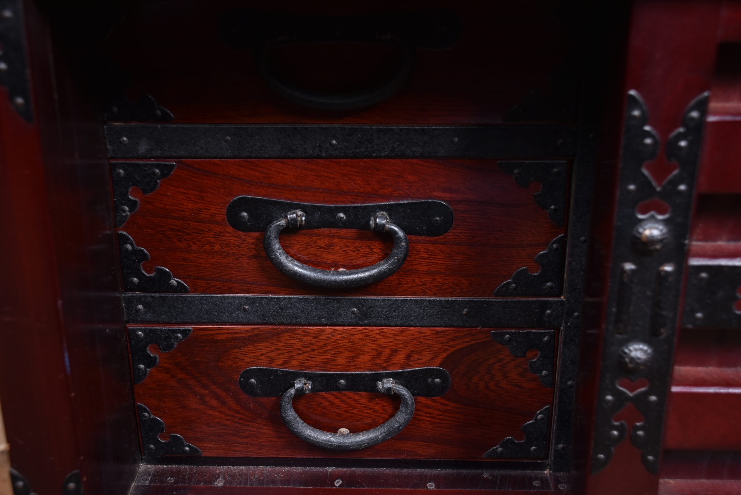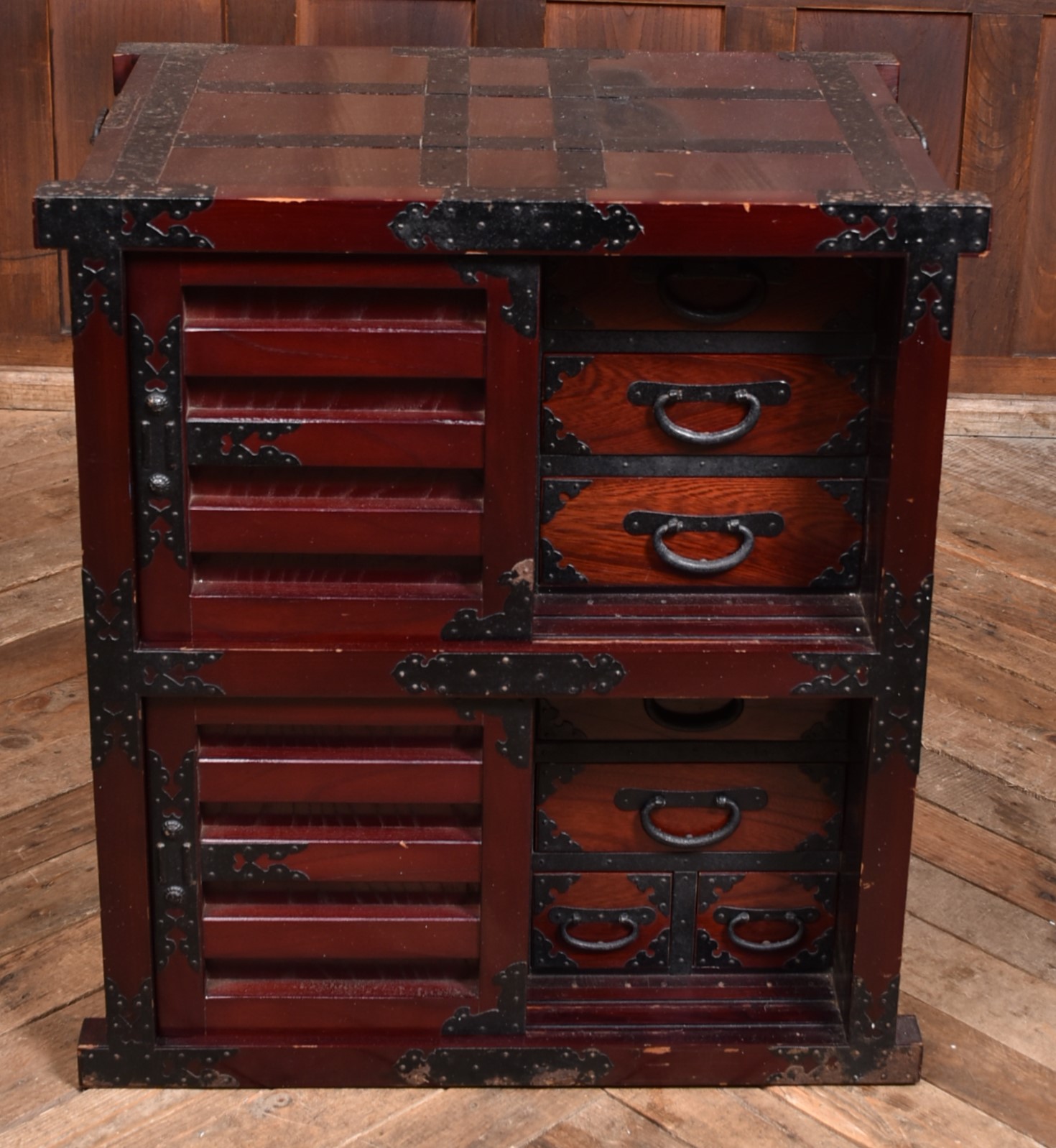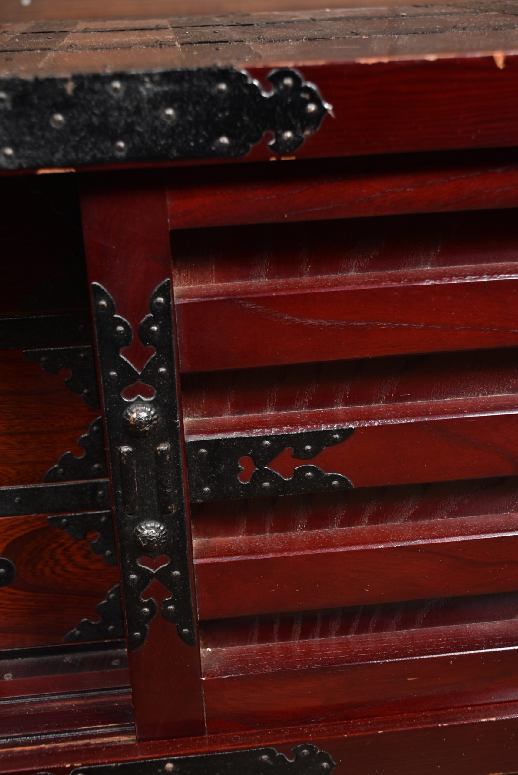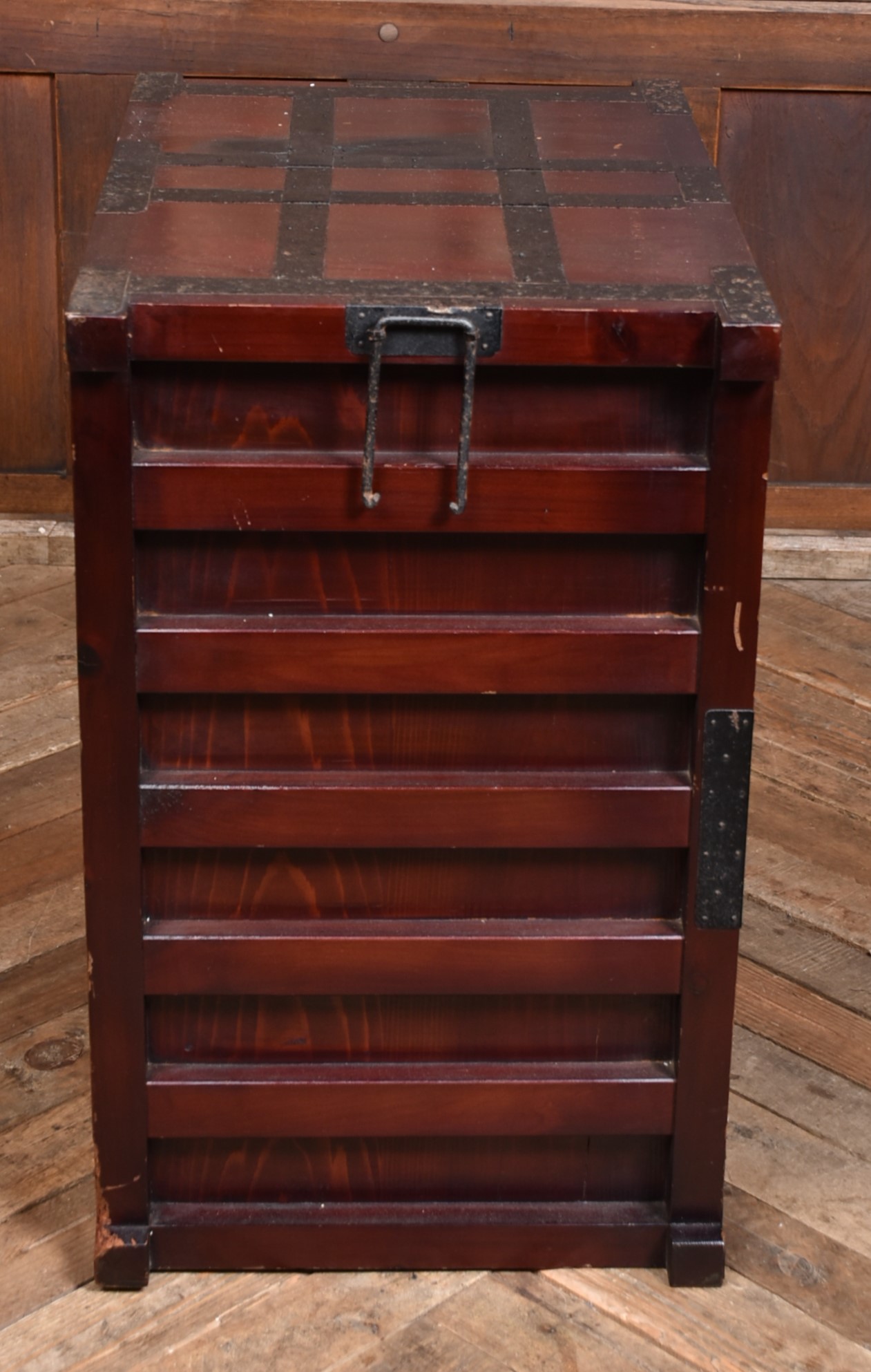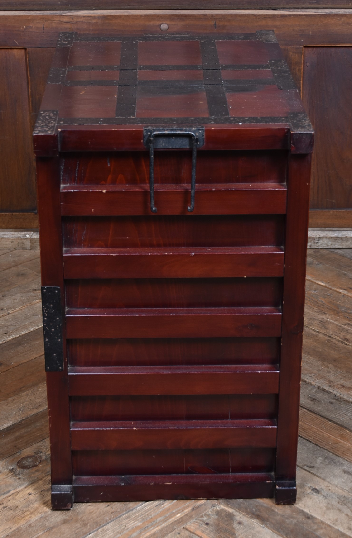 A traditional Japanese Tansu chest, crafted in richly toned wood and accented with blackened iron hardware. This piece features a balanced combination of sliding slatted doors and drawers of varying sizes, reflecting the practical elegance of Edo-period cabinetry. The iron corner brackets and handles provide both structural integrity and visual rhythm, while the layout suggests its original use as a merchant’s chest or mobile storage. A fine example of Japanese joinery and minimalist design, offering versatile storage and timeless character.