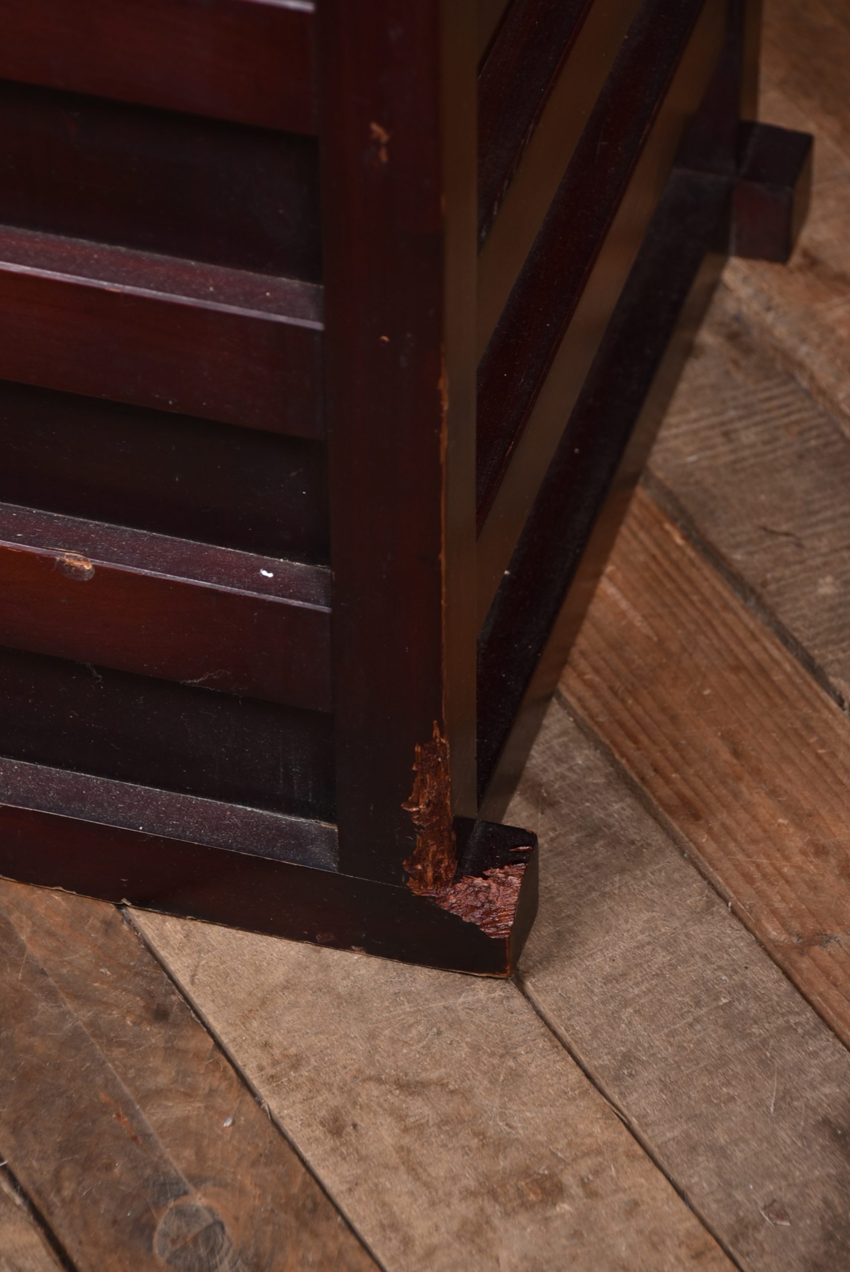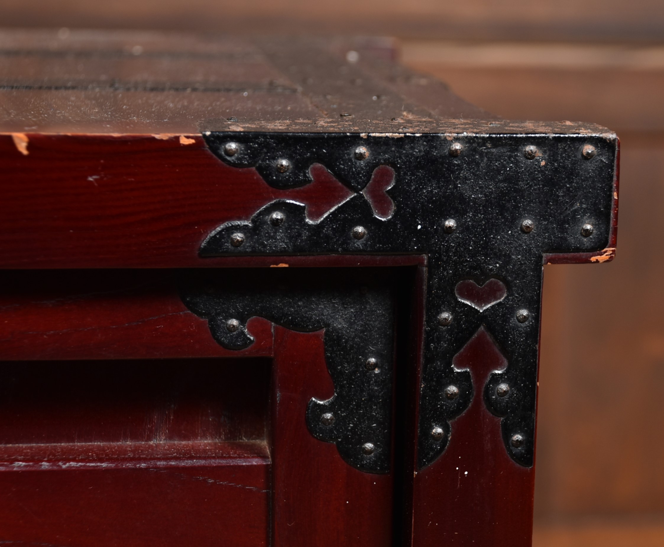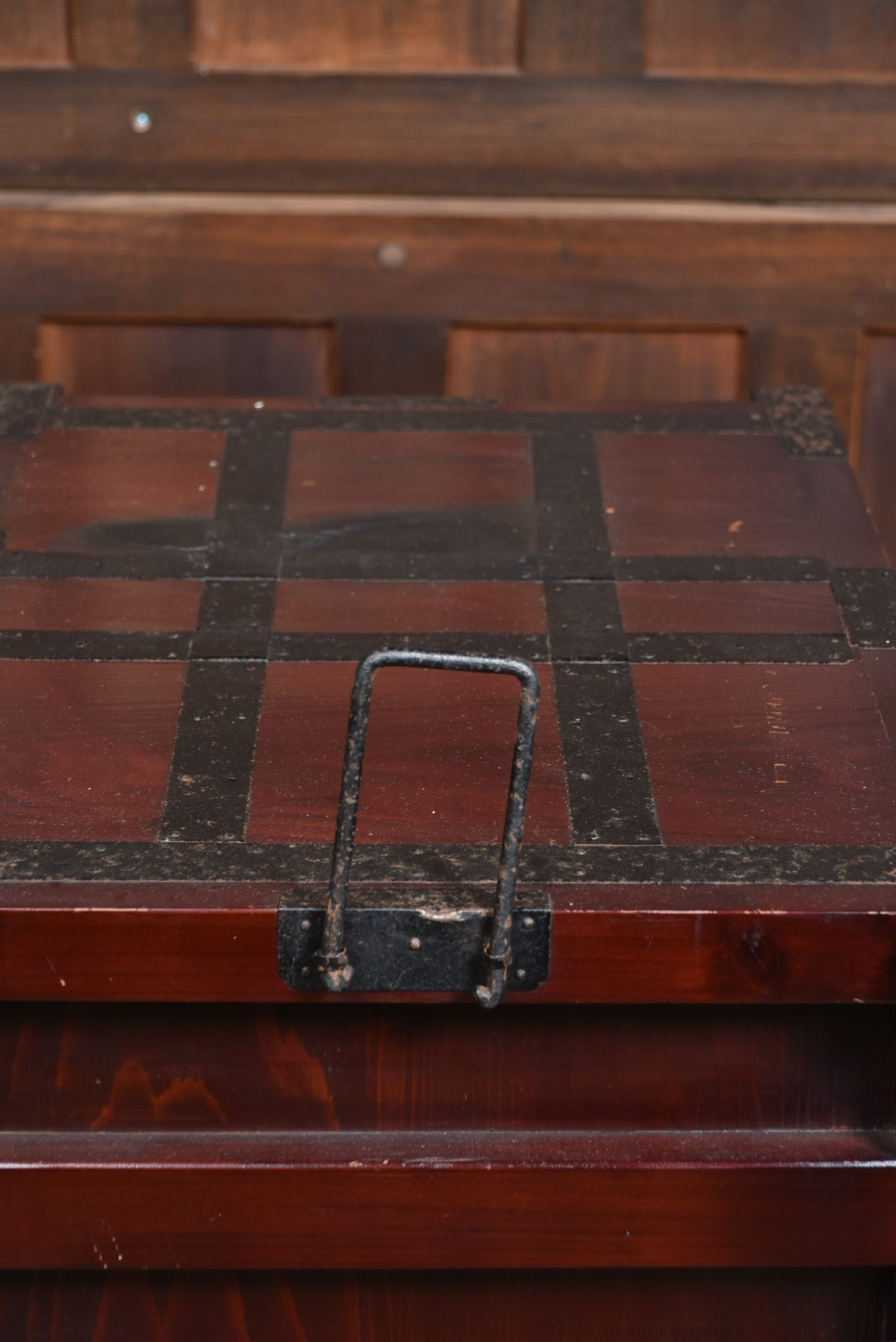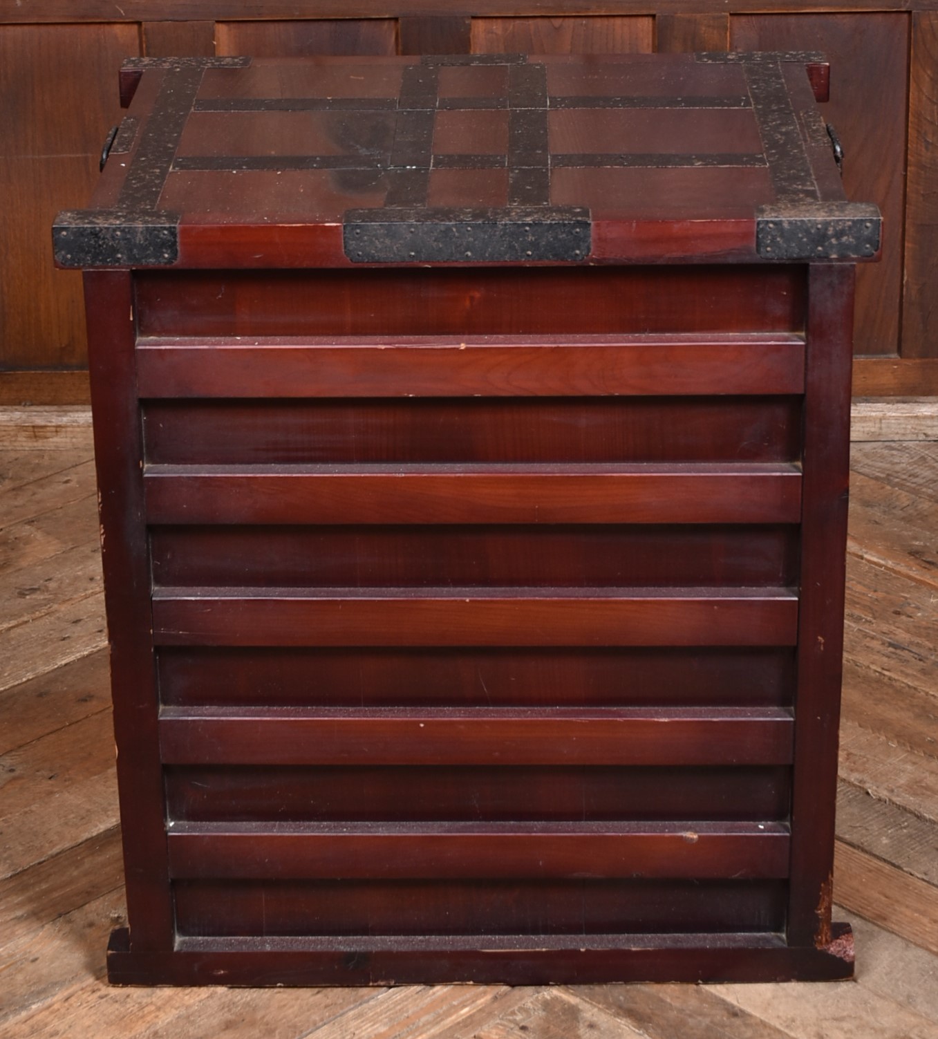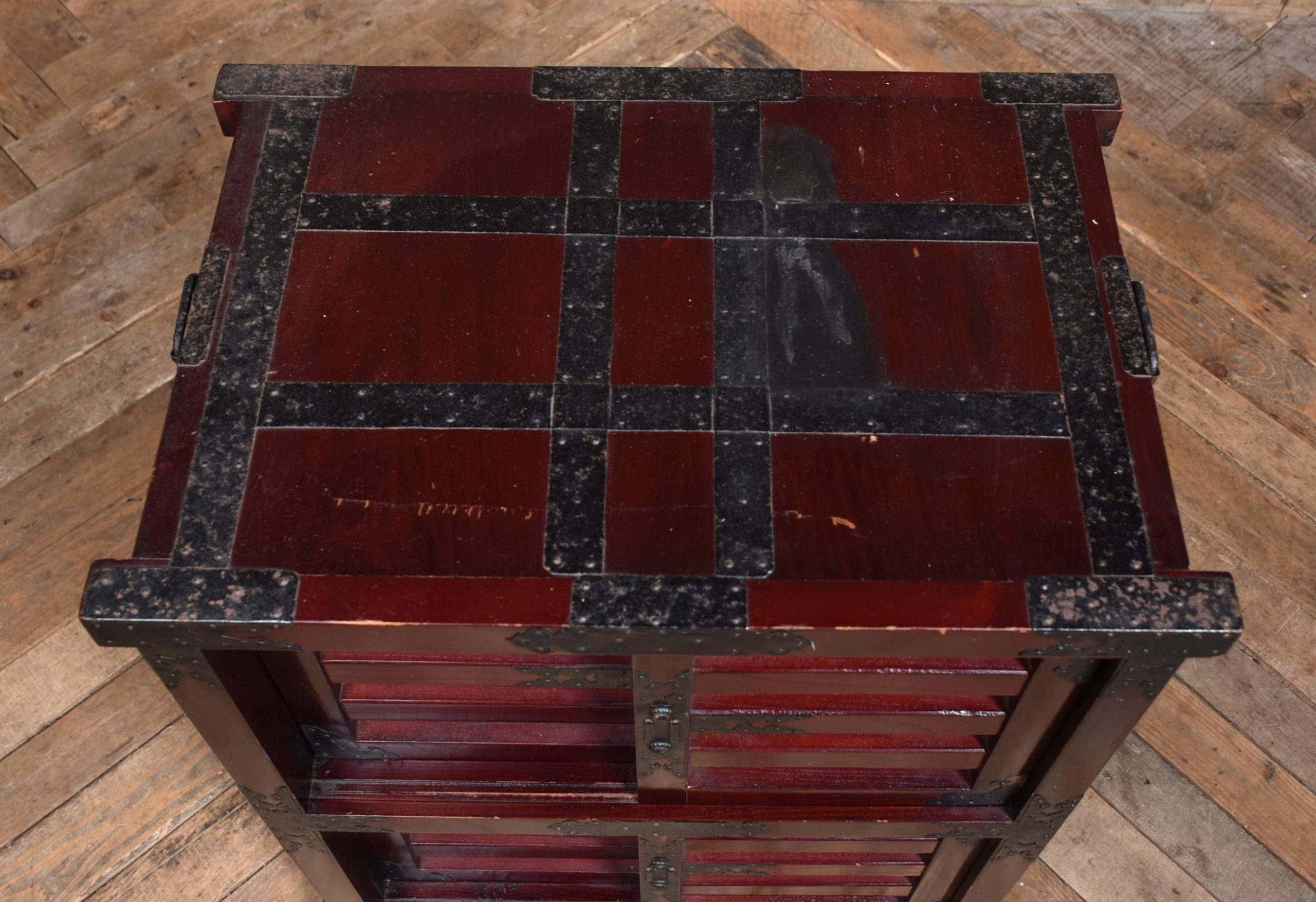 A traditional Japanese Tansu chest, crafted in richly toned wood and accented with blackened iron hardware. This piece features a balanced combination of sliding slatted doors and drawers of varying sizes, reflecting the practical elegance of Edo-period cabinetry. The iron corner brackets and handles provide both structural integrity and visual rhythm, while the layout suggests its original use as a merchant’s chest or mobile storage. A fine example of Japanese joinery and minimalist design, offering versatile storage and timeless character.