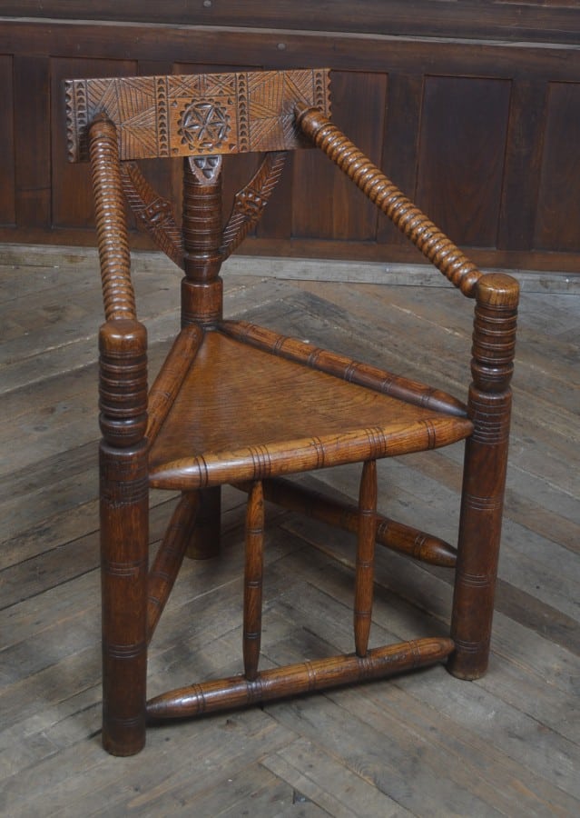 Superb Victorian turner’s chair in the manner of John Starkey in excellent condition with great patina. This beautiful hand crafted chair made of solid Oak with chip carving and geometric incised patterns to the top rail along with bobbin turned splayed arms. It has a triangular panel seat raised on 2 upright supports and three legs united by shaped stretchers. Like all antiques there are some imperfections however this is a solid chair with no wobbles or creeks. This Old Saxon style chair is a fantastic shape and a great colour that will enhance any corner it is placed.