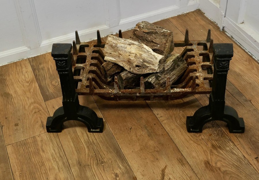 Large 19th Century Inglenook Fire Grate on Andirons This is heavy hand Forged Iron Log Grate is supported on a Pair of Iron Andirons The Grate is in very good but used condition and it is very heavy and would look superb in an open or Inglenook fire place The Andirons and Grate are 31” long overall, they are 16” high and 17” deep SC240 Manufacture Date : 19th Century Materials : Iron
