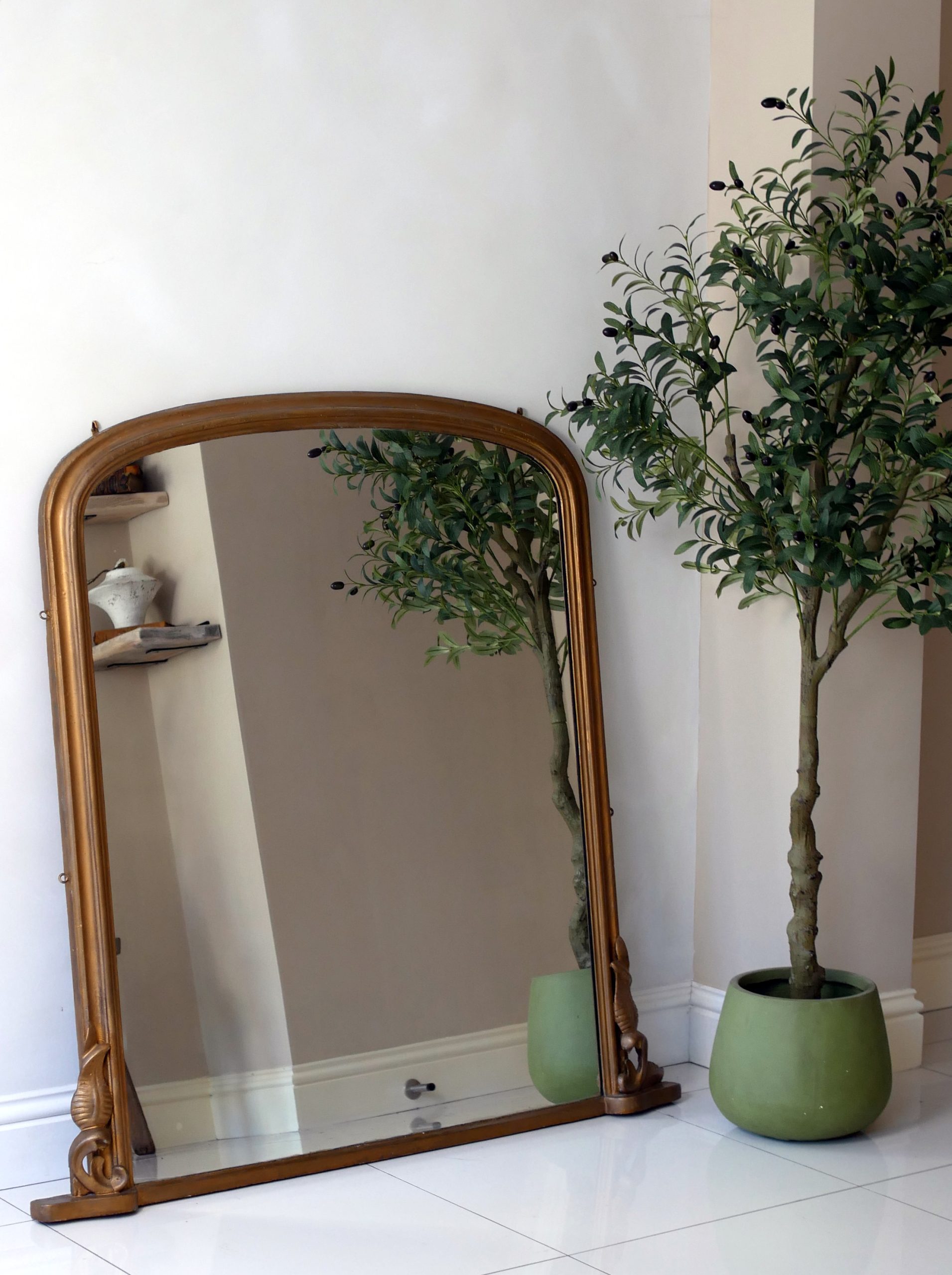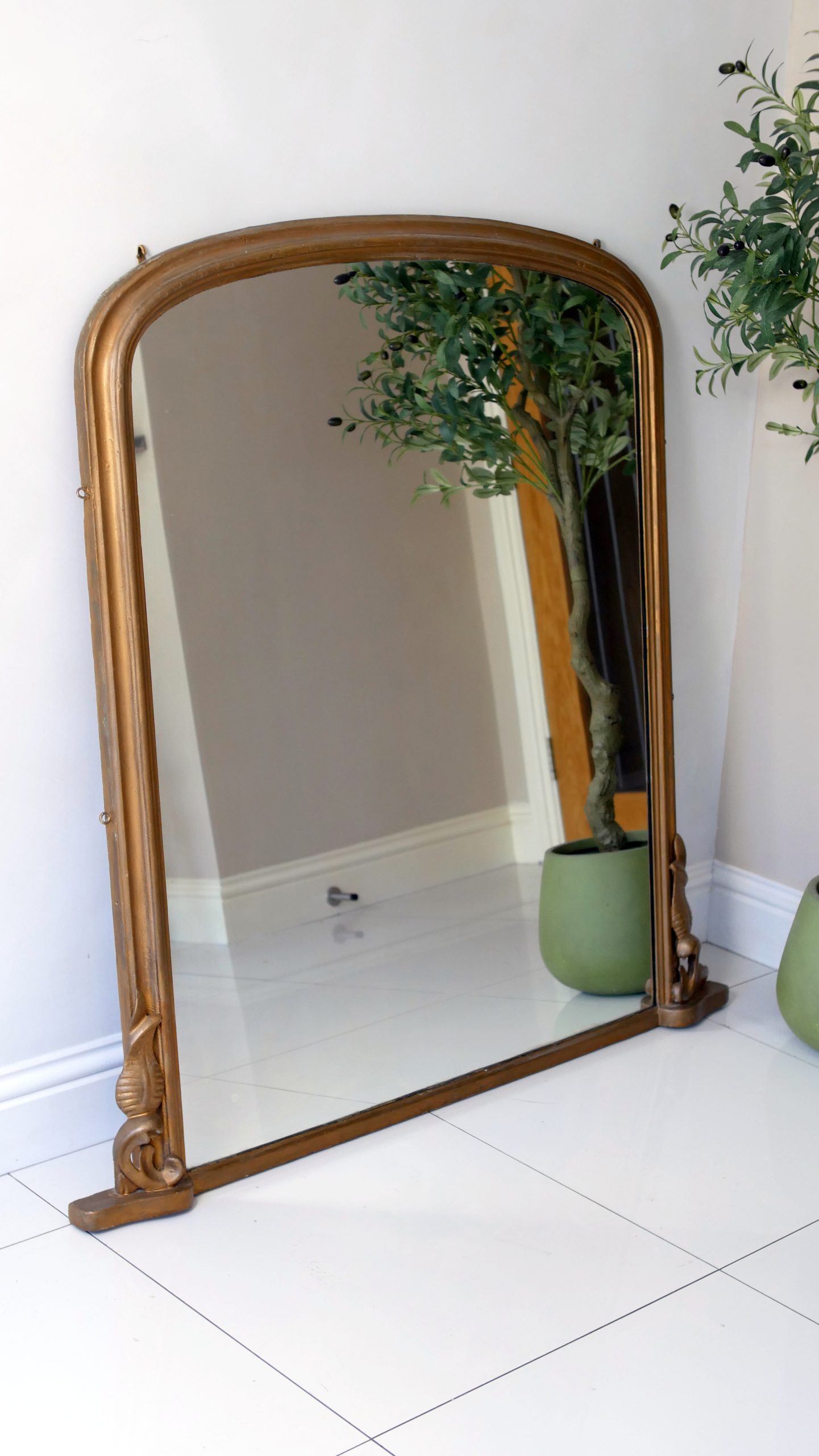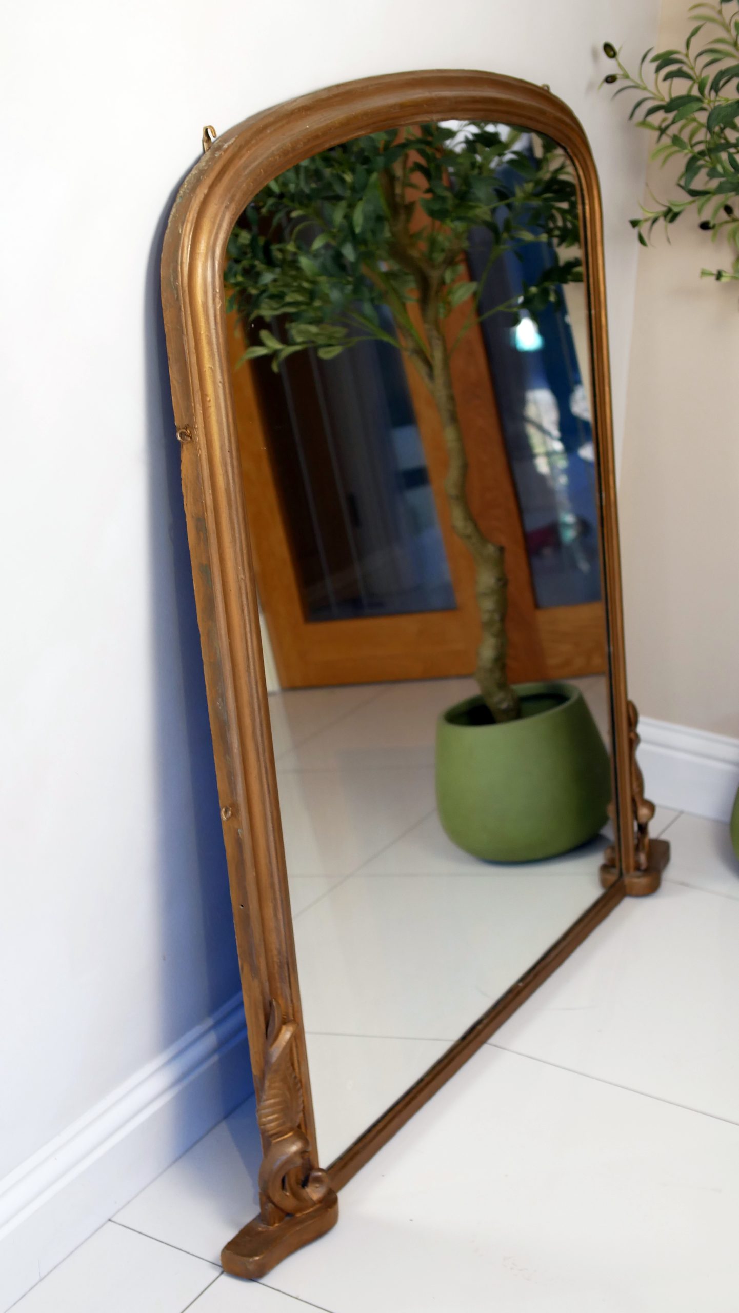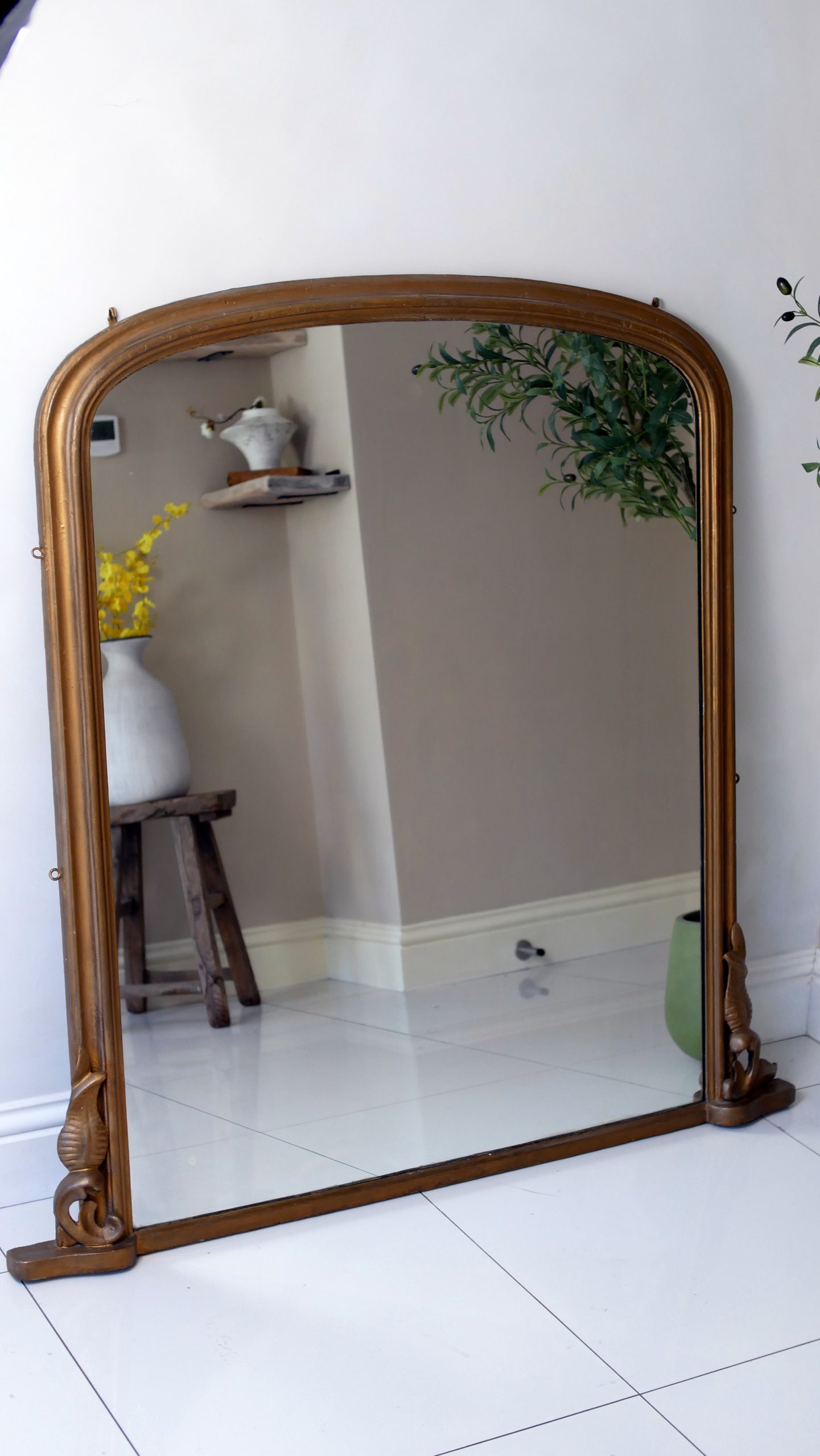 Reflections of Grandeur: A Substantial 19th Century Victorian Gilt Overmantel Mirror – Capture the light and the legacy of the Victorian era with this commanding Gilt Overmantel Mirror. This is a piece of significant scale, designed to act as the soul of a room—expanding the sense of space while adding a layer of prestigious, old-world warmth.Timeless Victorian SophisticationDating from the mid-to-late 19th century, this mirror features the classic Arched Top (or “Gilt Arch”) silhouette that defined the opulent drawing rooms of the period.Golden Lustre: The frame retains a rich, authentic gilt finish, offering a soft, burnished glow that only time and careful preservation can produce. Elegant Scrollwork Base: The mirror is anchored by beautifully carved acanthus leaf corbels at the base. These intricate flourishes provide a weighted, architectural foundation that transitions seamlessly onto a marble mantel or a grand console.Exceptional Scale: Its substantial height and width make it a transformative element, perfect for bouncing natural light across a room and creating a feeling of lofty, airy grandeur.A Focal Point for the Modern Heirloom Home While historically placed above a fireplace, a mirror of this magnitude offers endless possibilities for contemporary “Quiet Luxury” interiors:The Hallway Anchor: Lean it against a wall in a spacious entryway to create an immediate sense of arrival and depth.The Bedroom Statement: Place it opposite a window to double the view and brighten a suite with golden-hour reflections. The Dressing Room Luxury: Its generous proportions make it a practical yet stunning full-scale mirror for a high-end dressing area.