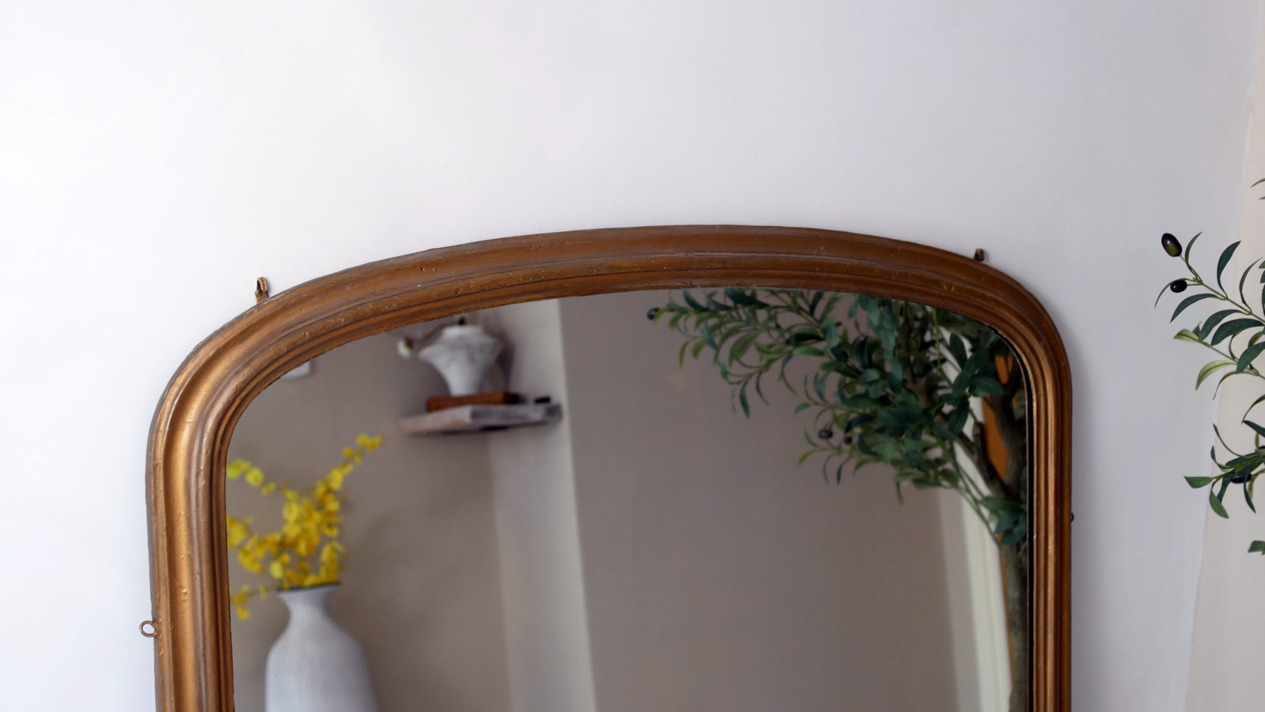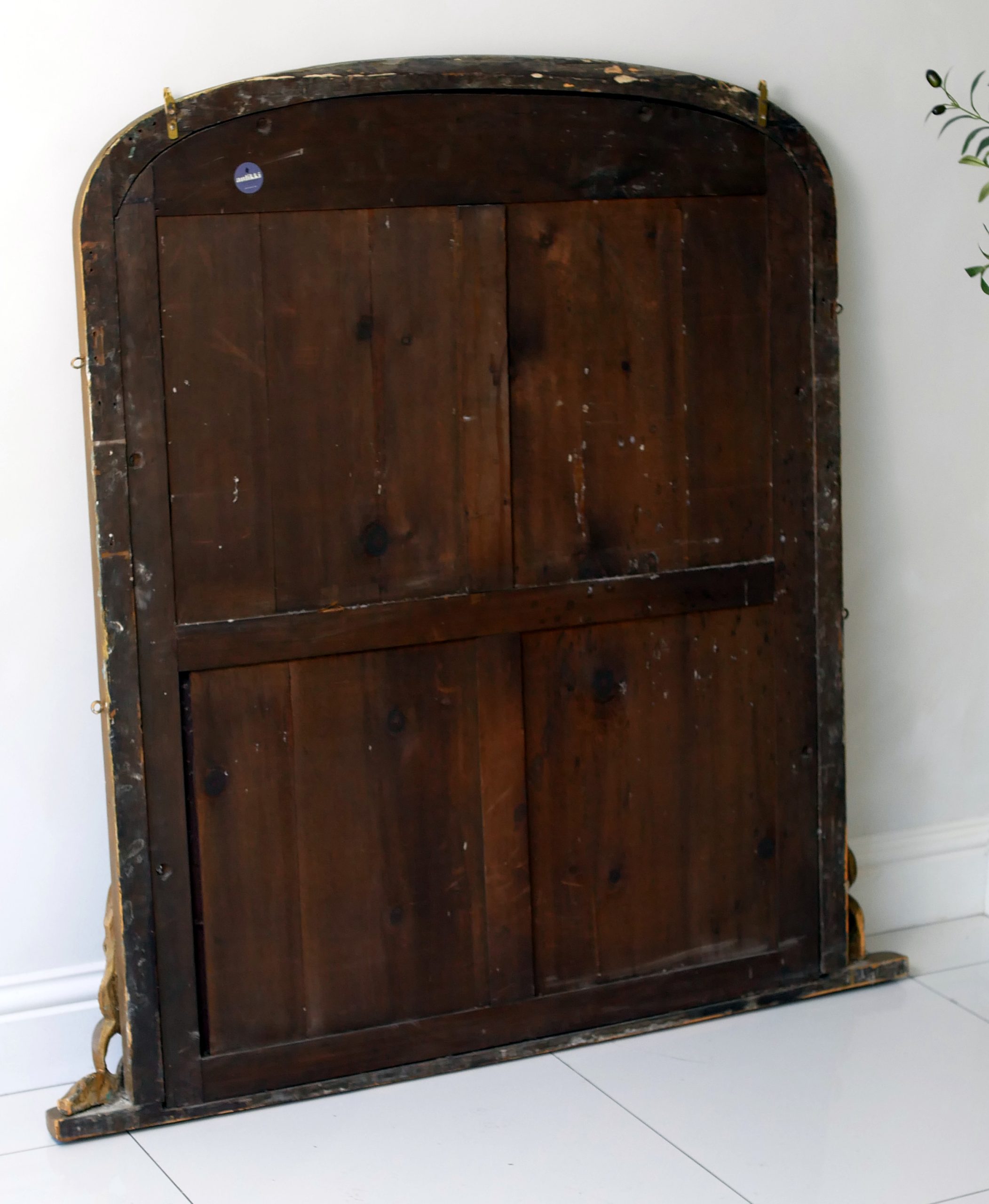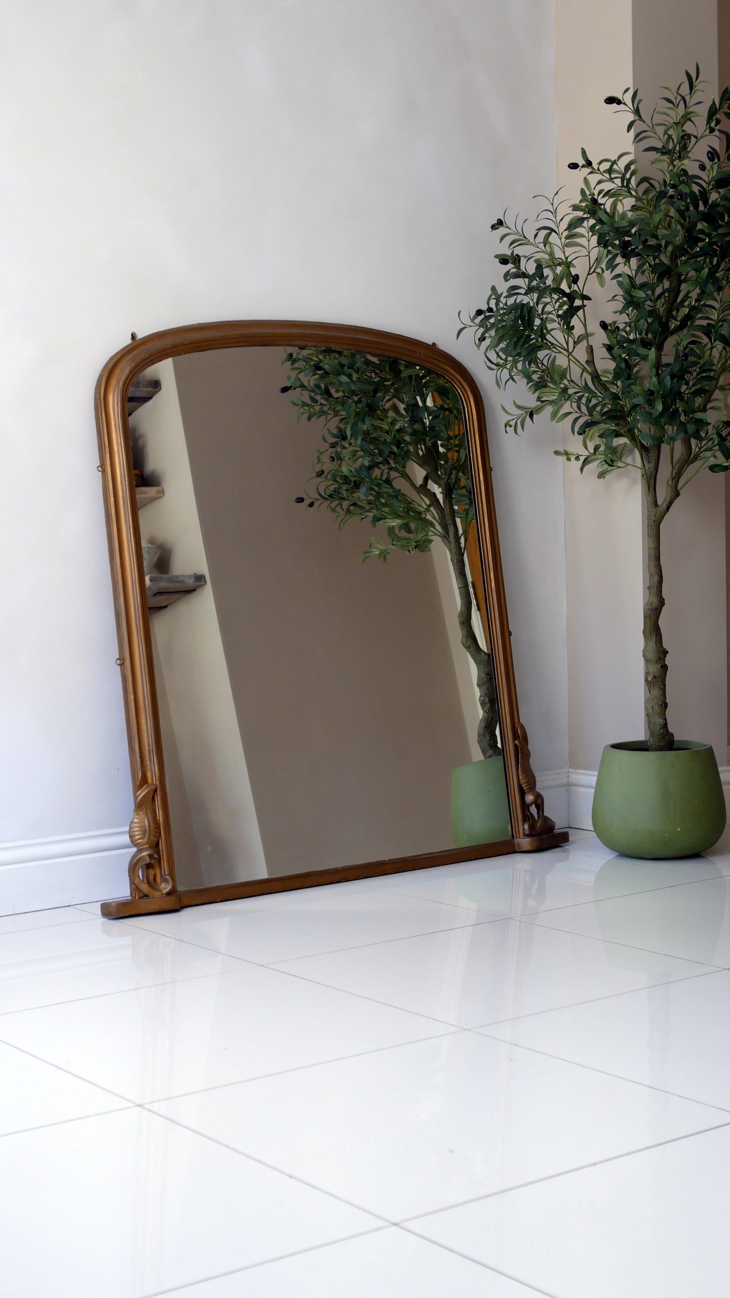 Reflections of Grandeur: A Substantial 19th Century Victorian Gilt Overmantel Mirror – Capture the light and the legacy of the Victorian era with this commanding Gilt Overmantel Mirror. This is a piece of significant scale, designed to act as the soul of a room—expanding the sense of space while adding a layer of prestigious, old-world warmth.Timeless Victorian SophisticationDating from the mid-to-late 19th century, this mirror features the classic Arched Top (or “Gilt Arch”) silhouette that defined the opulent drawing rooms of the period.Golden Lustre: The frame retains a rich, authentic gilt finish, offering a soft, burnished glow that only time and careful preservation can produce. Elegant Scrollwork Base: The mirror is anchored by beautifully carved acanthus leaf corbels at the base. These intricate flourishes provide a weighted, architectural foundation that transitions seamlessly onto a marble mantel or a grand console.Exceptional Scale: Its substantial height and width make it a transformative element, perfect for bouncing natural light across a room and creating a feeling of lofty, airy grandeur.A Focal Point for the Modern Heirloom Home While historically placed above a fireplace, a mirror of this magnitude offers endless possibilities for contemporary “Quiet Luxury” interiors:The Hallway Anchor: Lean it against a wall in a spacious entryway to create an immediate sense of arrival and depth.The Bedroom Statement: Place it opposite a window to double the view and brighten a suite with golden-hour reflections. The Dressing Room Luxury: Its generous proportions make it a practical yet stunning full-scale mirror for a high-end dressing area.