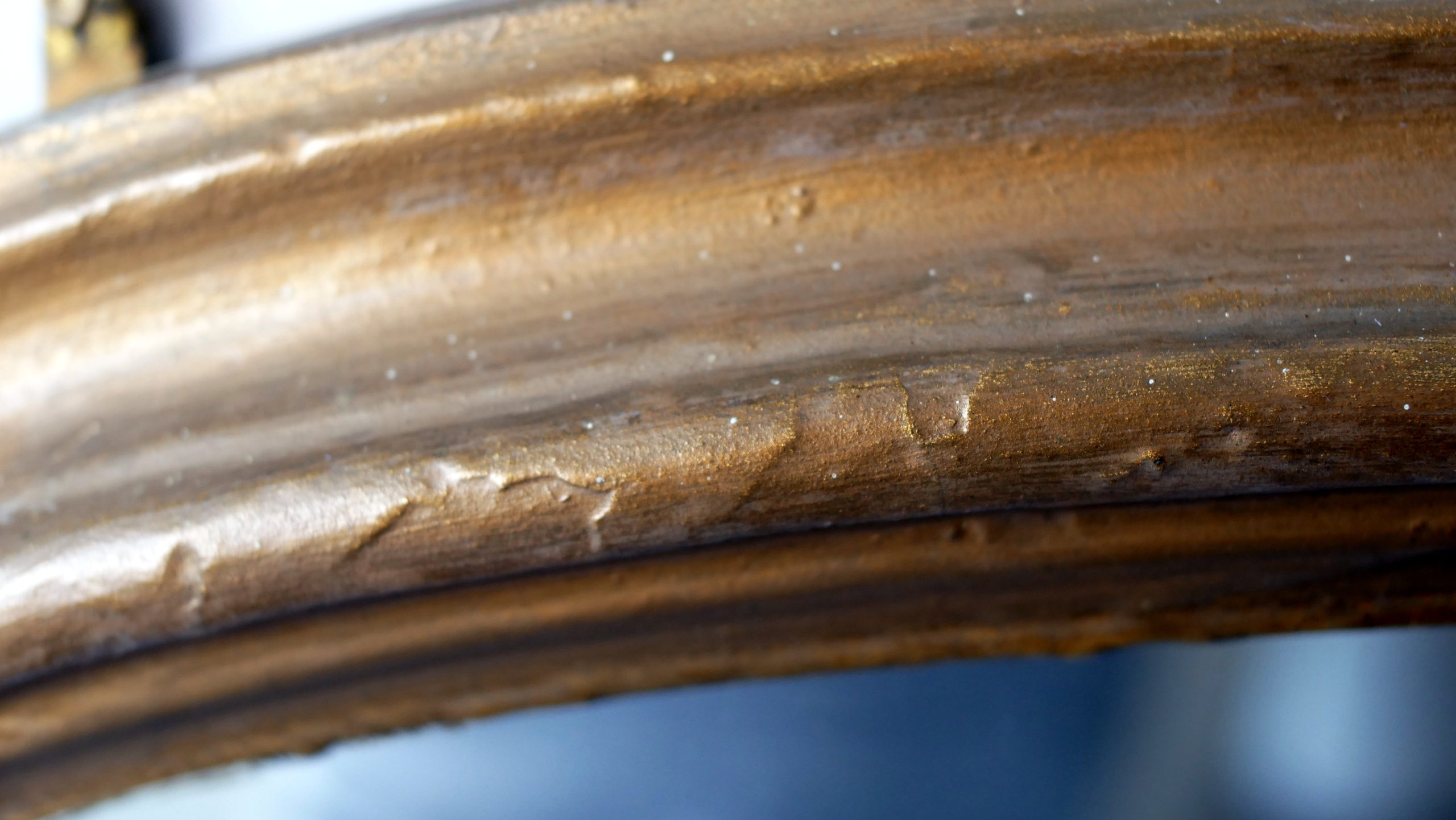 Signs of wear commensurate with age. Left acanthus leaf moulding lacking.