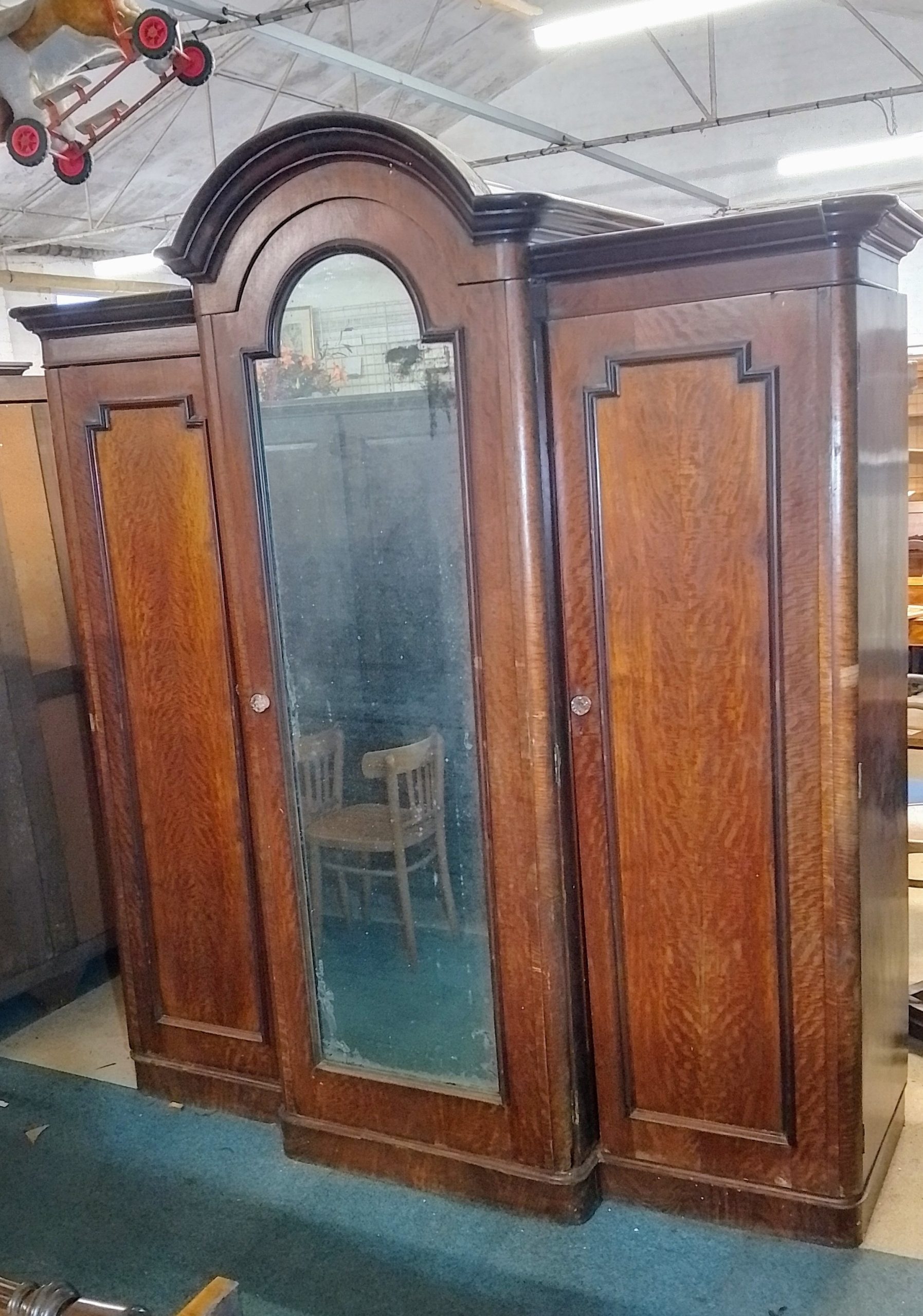 Large antique 19thC Victorian mahogany arch top mirror door triple wardrobe with full length hanging & fitted drawers.