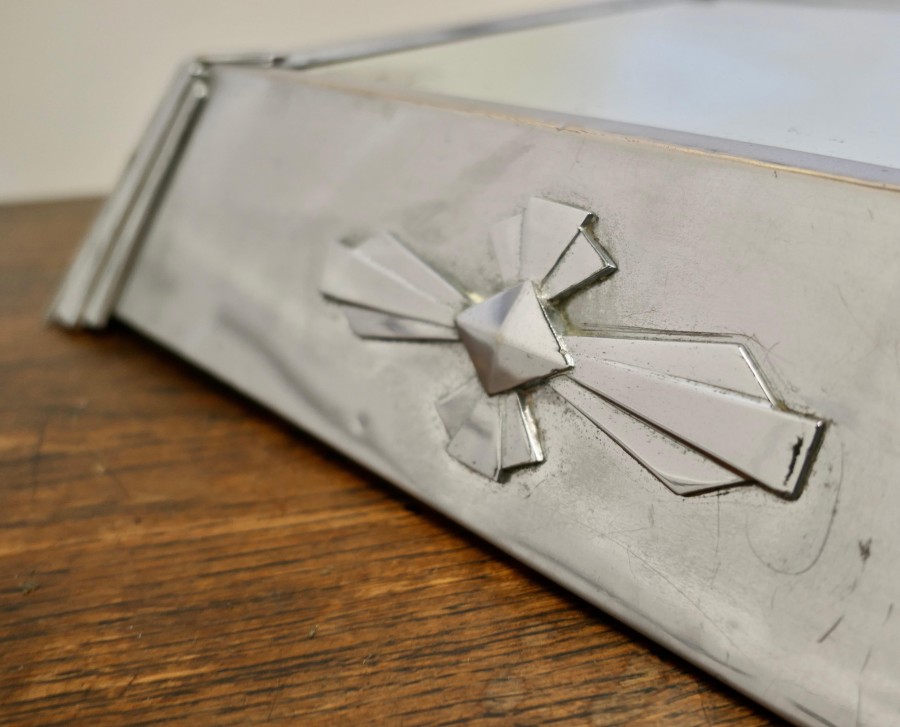 Large Art Deco mirror top chrome plateau wedding cake stand This Stylish Art Deco piece is square, 6” high with a mirror top and Art Deco decoration on all sides The Stand is large with a sloped side, and measures 19” square The stand is in used condition with a few vintage dings and some foxing of the mirror TCC154. Manufacture Date : 1920 Materials : Chrome
