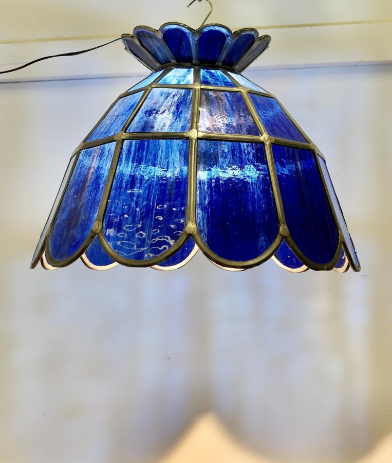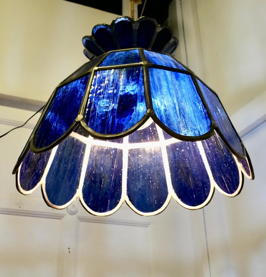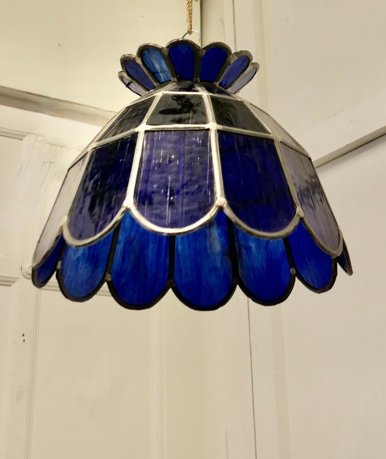 Large Arts and Crafts Cobalt Blue Leaded Glass Pendant Lamp This is a super ceiling light, it is made with petal shaped panes of Cobalt Blue Leaded Glass This is a very heavy piece, in excellent condition, it is 18” in diameter and 14” high CS70 Manufacture Date : 1920 Materials : Art-glass