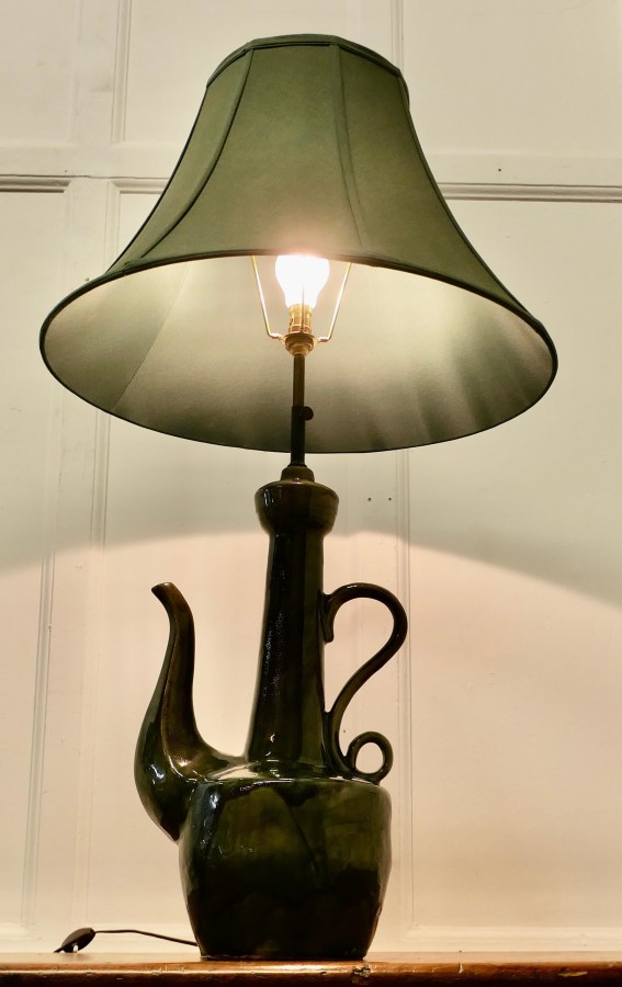 Large Arts and Crafts Quirky Tea Pot Table Lamp Made as a Table Lamp, this quirky piece has an Art Pottery base, very much in the style of, and possibly by Bretby in green with a majolica glaze The lamp has a height adjustable central column The lamp is working and has been recently rewired the linen shade can be included if requested the lamp is between 34” and 25” tall and it is 12” x 9” across TSW315 Manufacture Date : 1910 Materials : Ceramic