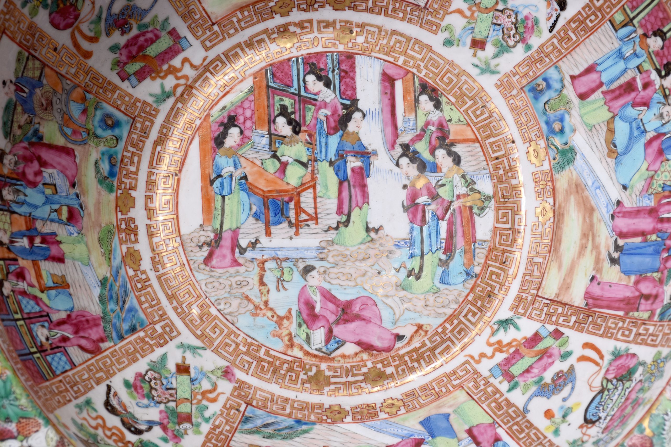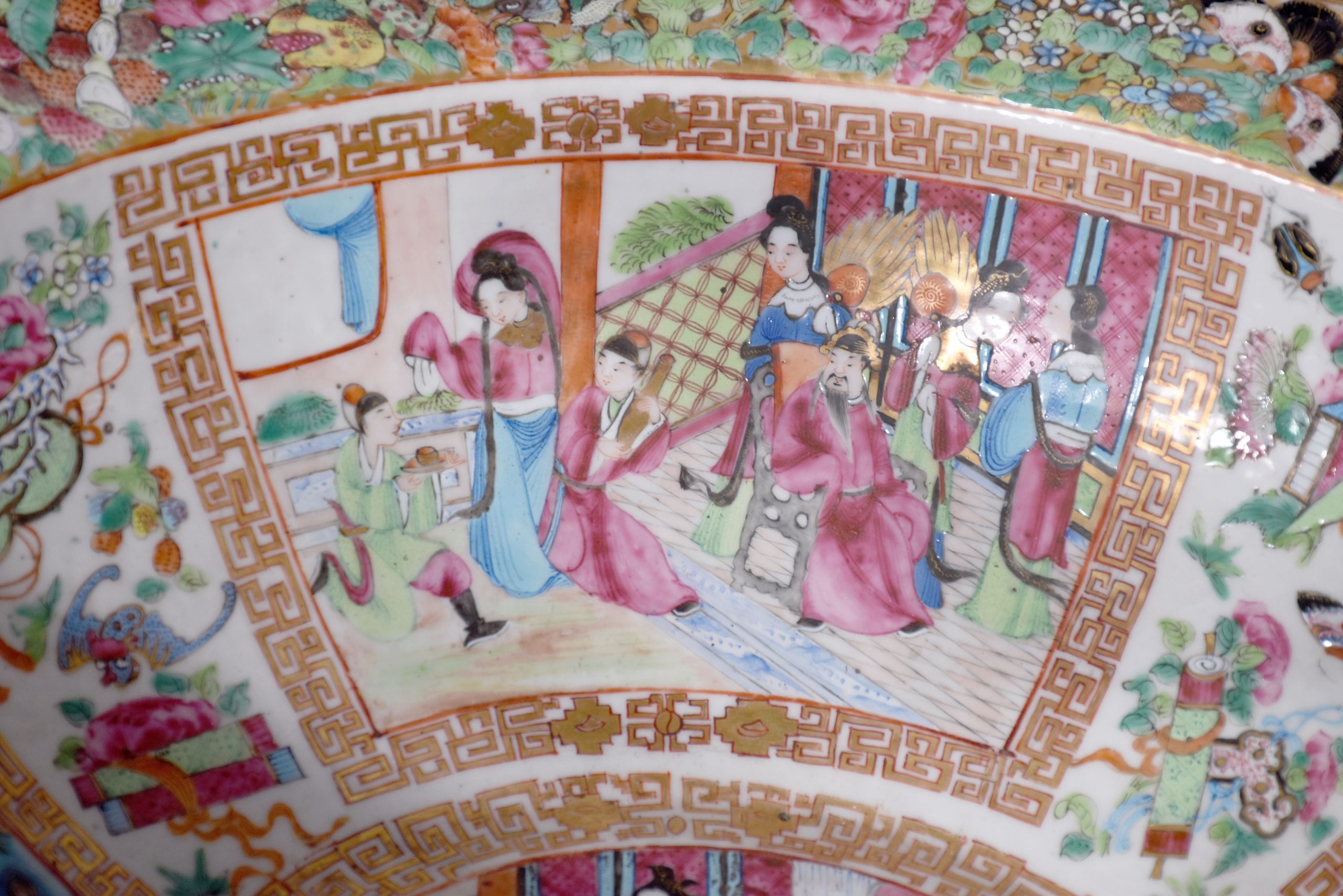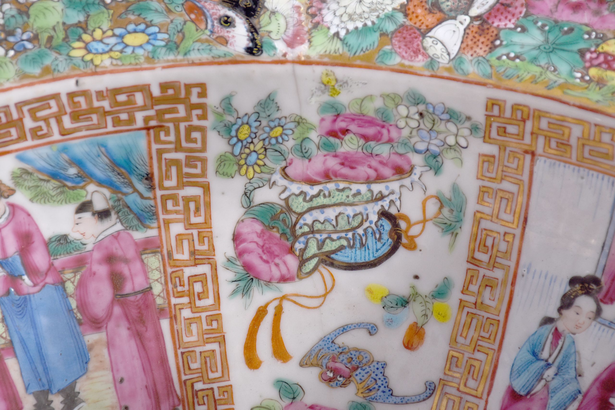 Circa 1880. Large Canton hand-painted (Mandarin) Famille Rose bowl. Hand painted with characteristic Canton panels of Chinese figures, interspersed with panels of flowers and butterflies within a highly decorative floral background. The exterior with further hand-painted floral decoration. Some old minor restorations.