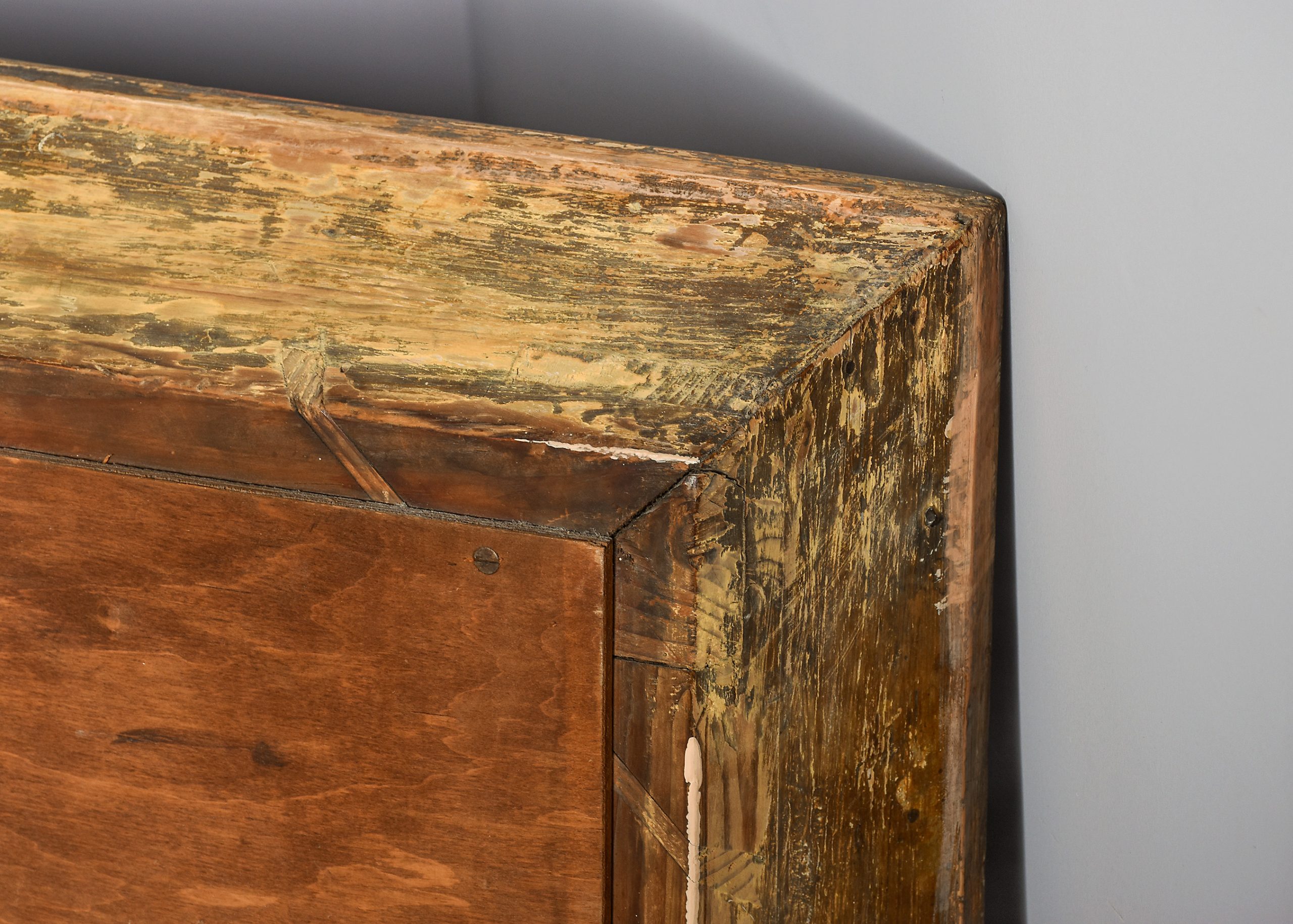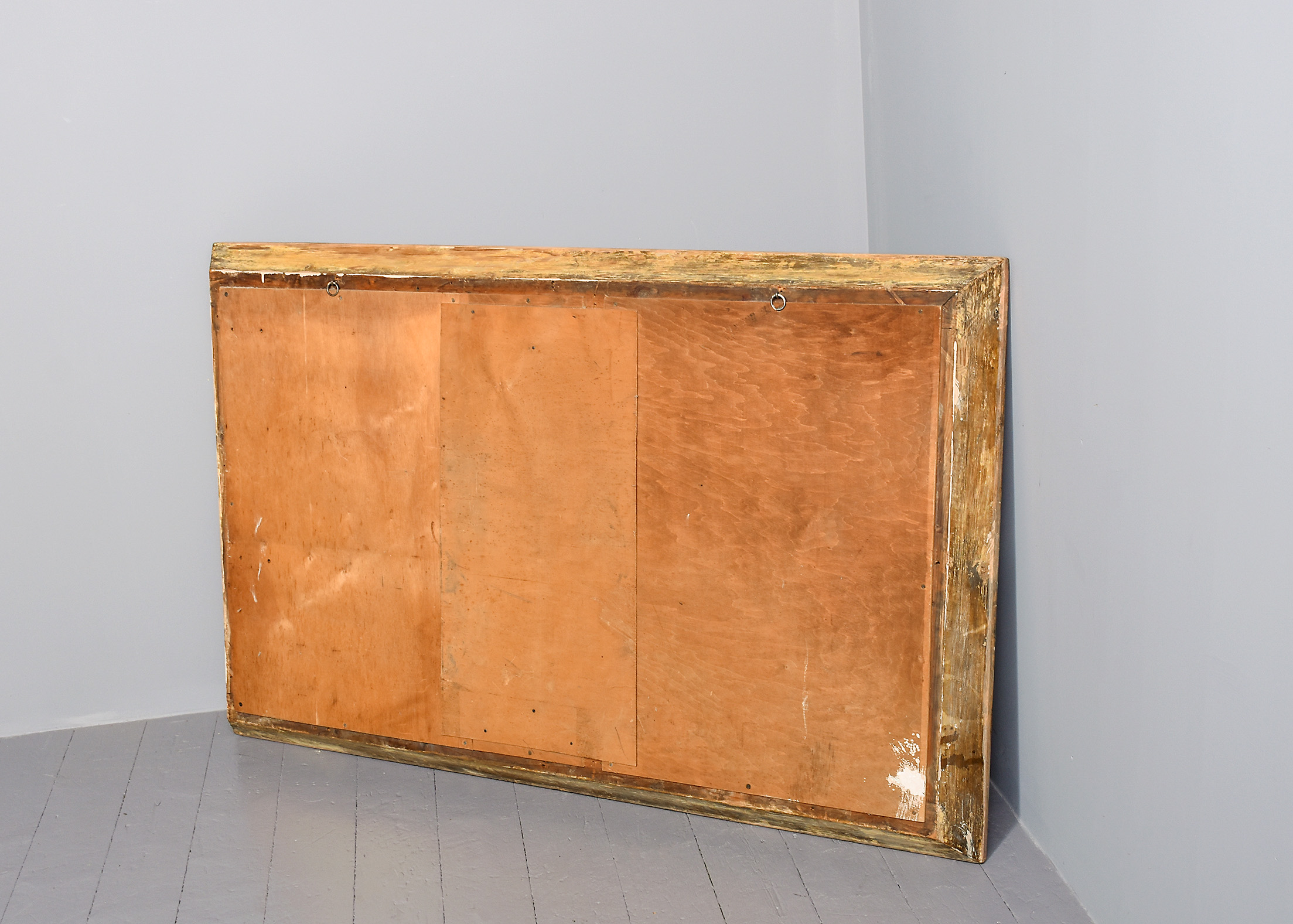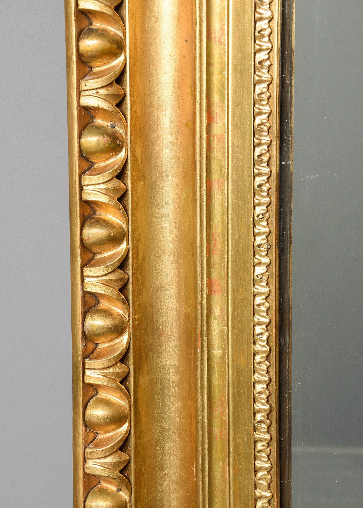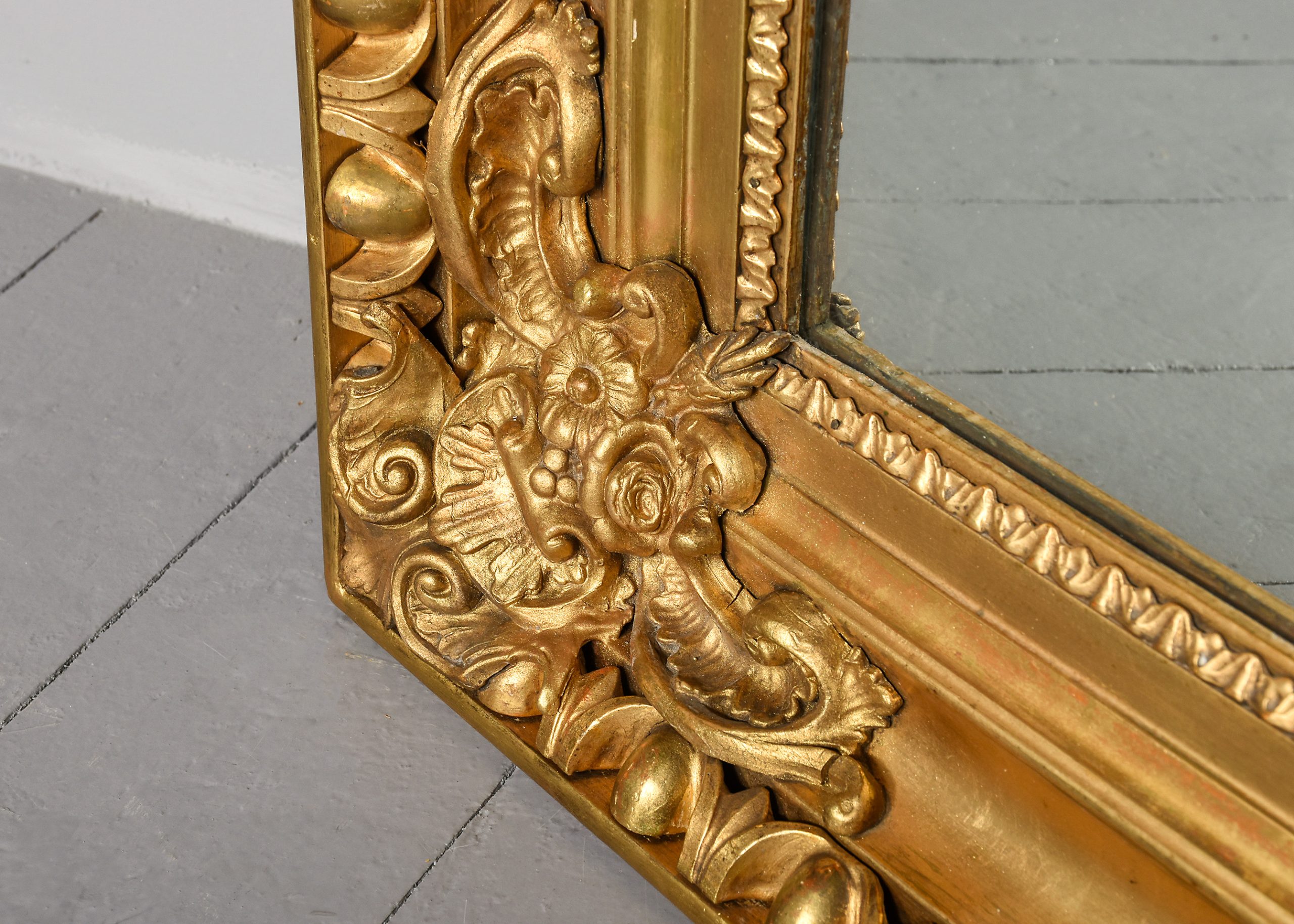 Circa 1870. A large carved and gilded rectangular mirror, retaining its original mirror plate in a simple carved and gilded slip with concave sections to the outside, each of the corners with a profusely carved foliate section including flower heads, leaves and C and S scrolls, the outer edge of the frame with a stylish carved wooden and gilded decoration, unusually the sides of the frame are chamfered in solid wood. Can be hung portrait or landscape.
