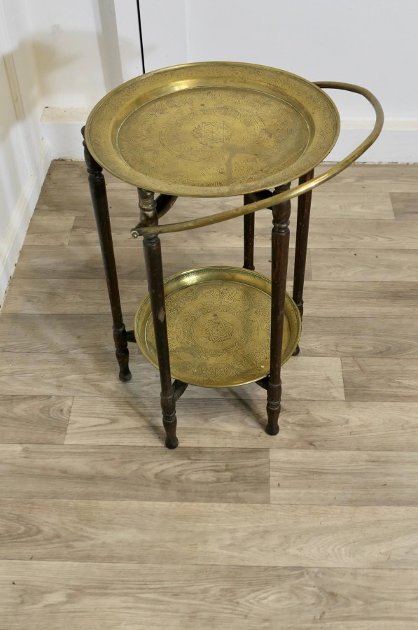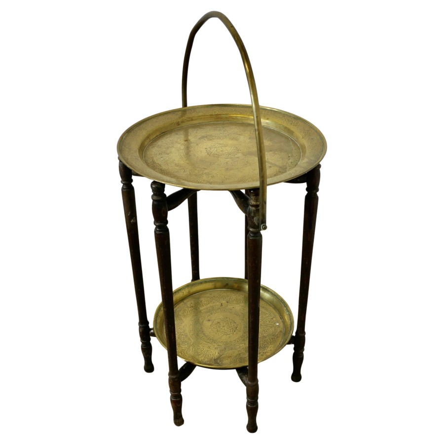 Large Collapsable Brass Cake Stand , Dumb Waiter This is an unusual piece, it is a wooden cake stand, with removable brass plates, which allow it to be folded down for storage The stand is 28” high, including the handle and 13” in diameter NG304 Manufacture Date : 1880 Materials : Brass