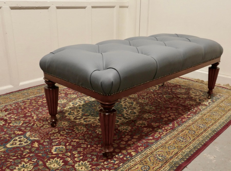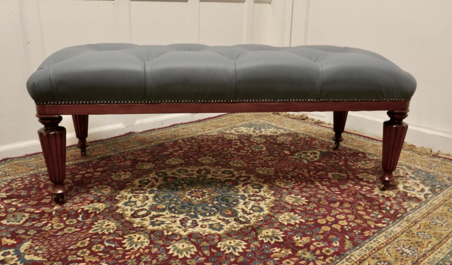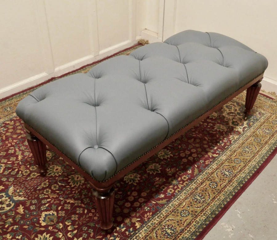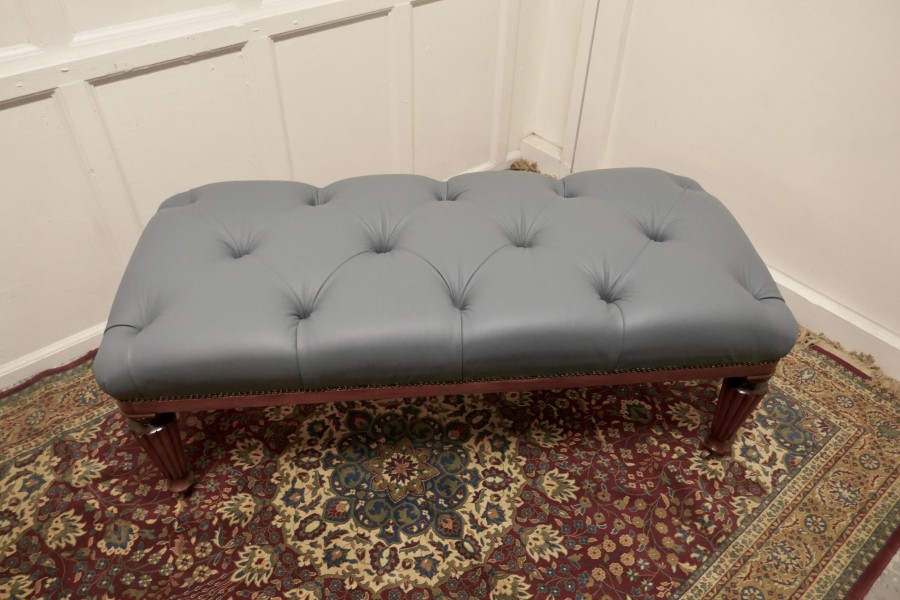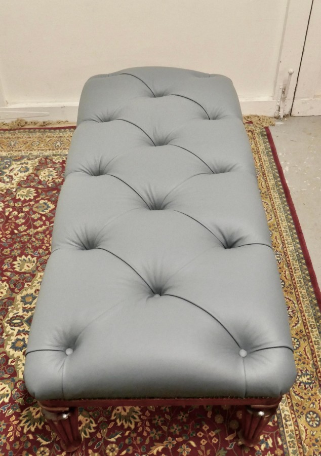 Large Deeply Buttoned Chesterfield leather Library Stool This is a good Sturdy Library Stool it has turned and fluted mahogany legs with brass casters The stool is newly upholstered, studded and buttoned in superbly soft Dove Grey Leather This large sturdy Library Stool would work well in almost any room as either a stool or as a coffee table, it is in good sound condition The Stool is 19” high and 50” x 22” NV324. Manufacture Date : 1870 Materials : Leather