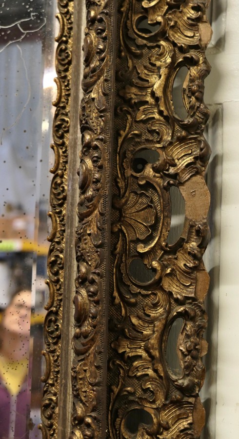 Large Early 19th century square gilt Rococo wall mirror The mirror has a wide a elaborate carved Giltwood Rococo Frame, it is almost square in shape with a 7” wide decorative frame This is a very beautiful and luxurious piece, the original bevelled glass has some foxing and frame has minor losses but has a superb aged dark patina The overall size is of the mirror is 36” high, 32” wide and it is 4” deep THM165. Manufacture Date : 1800 Materials : Giltwood