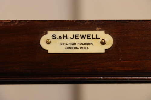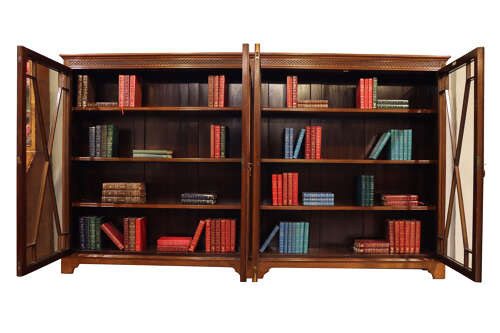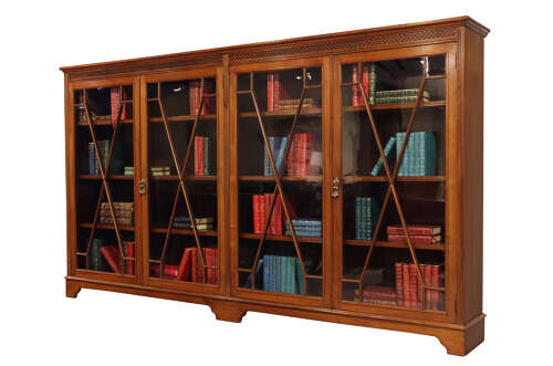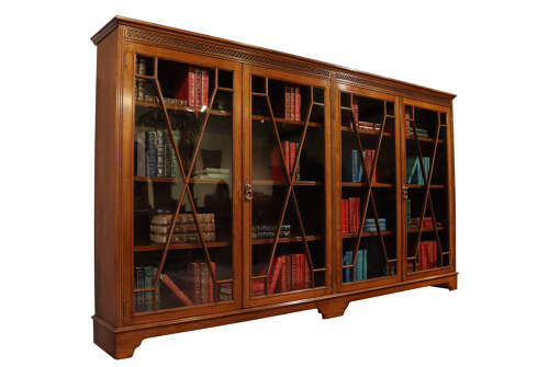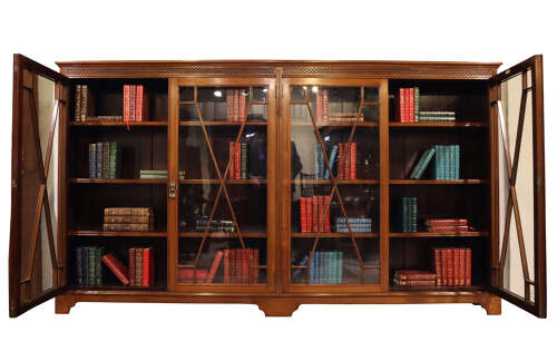 A large Edwardian walnut astragal glazed four-door bookcase, dating from circa 1900 and bearing the original retailer’s label for S. & H. Jewell, 131–2 High Holborn, London.