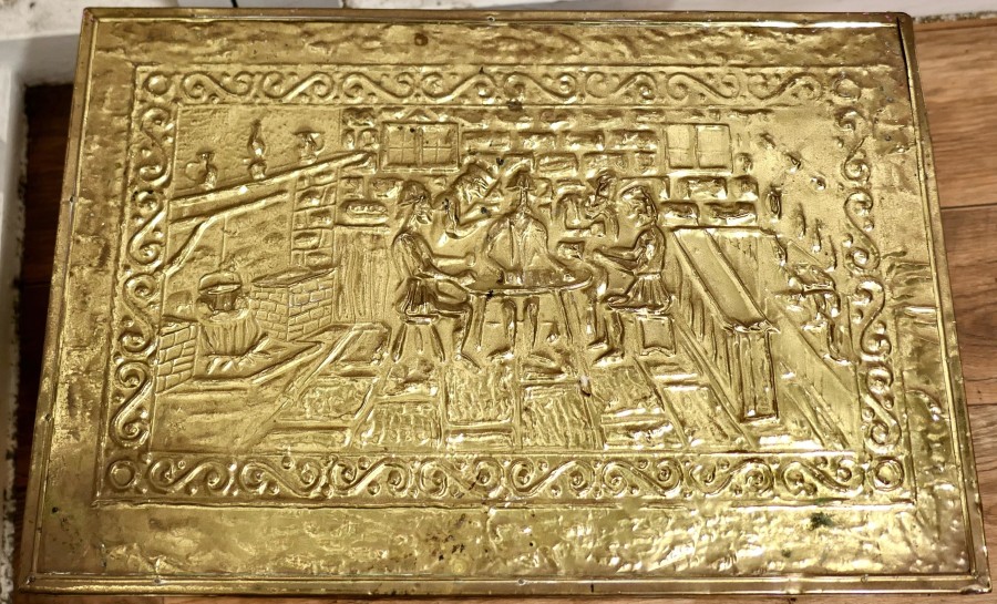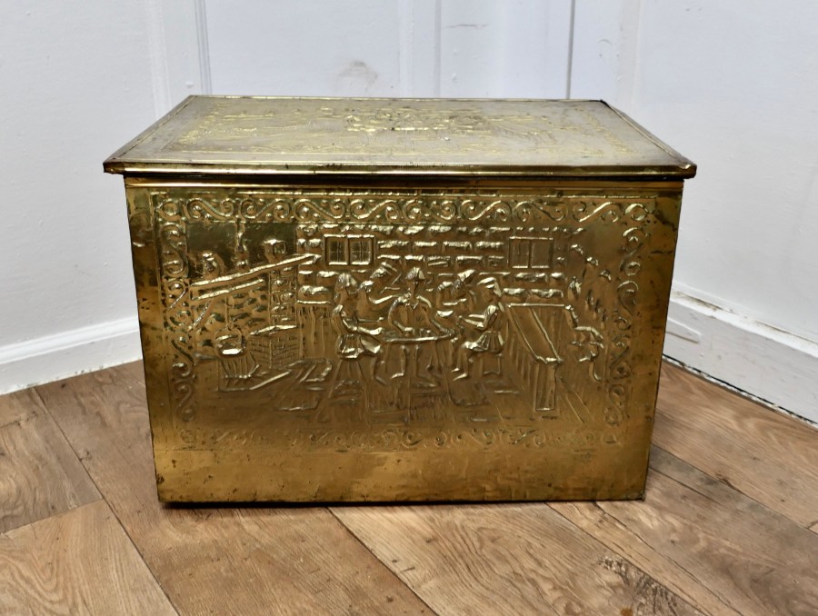 Large Embossed Brass Log Box, with Tavern Scenes This is a delightful large chest is made in Brass with a soft lining, the beaten brass is embossed with Tavern scenes This is an old piece it has a very good colour, it is in good condition for its years and it is clean inside so could be used for many purposes, how about for keeping your slippers warm by the fire The box is 23” long, 15” deep and 16” high VY71 Manufacture Date : 1910 Materials : Brass