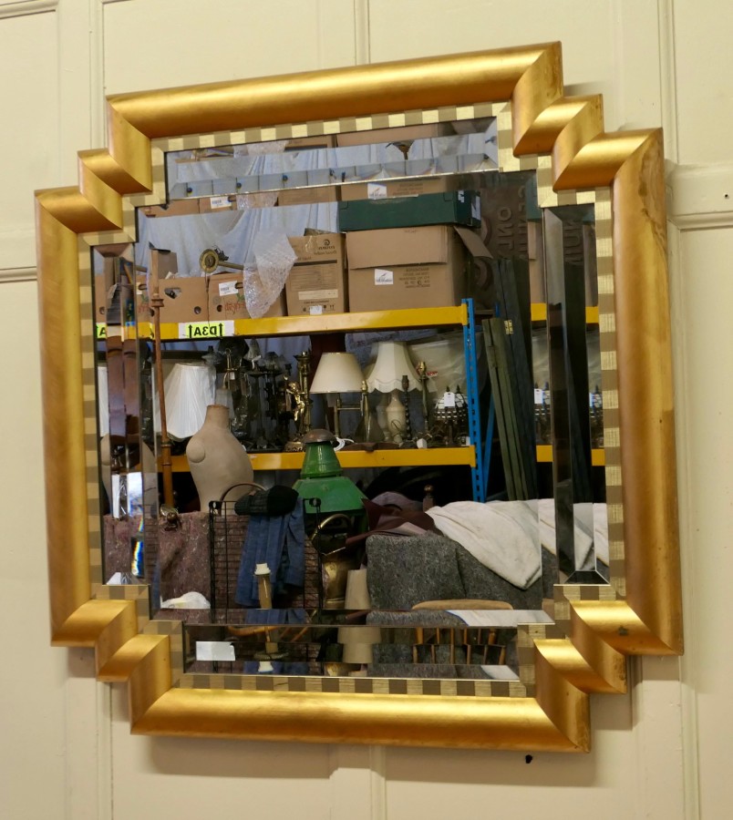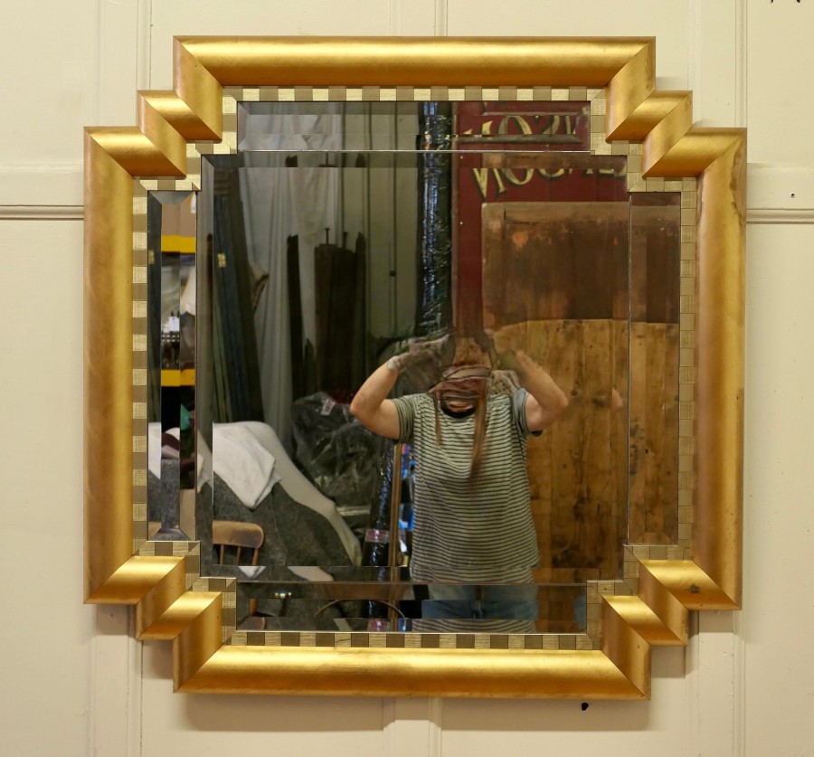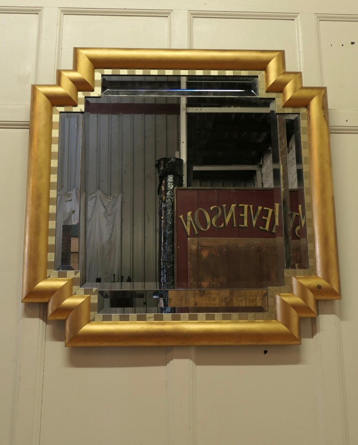 Large French Art Deco Odeon Style Gilt Mirror The Art Deco frame has an odeon style stepped corner and a 4” wide D shaped Gilt frame This is a lovely and a fine quality piece, just like a cushion Mirror the central bevelled glass is set with rectangular bevelled mirrors forming the stepped rectangular border and it has a 2 tone gilt border on the inside There is slight wear to the gilt frame, all in all it is a very stylish piece The mirror is 37” wide and 37” tall and 3” deep HM28 Manufacture Date : 1920 Materials : Giltwood