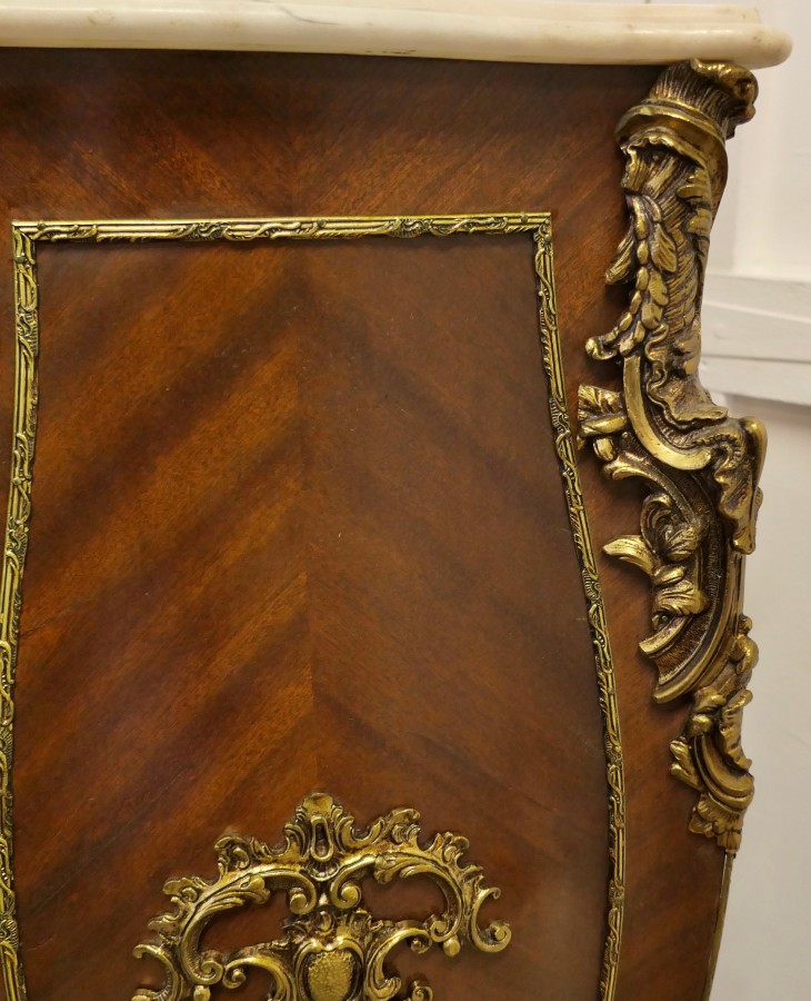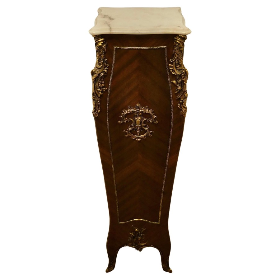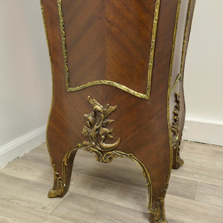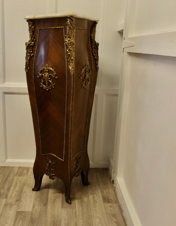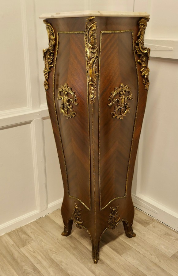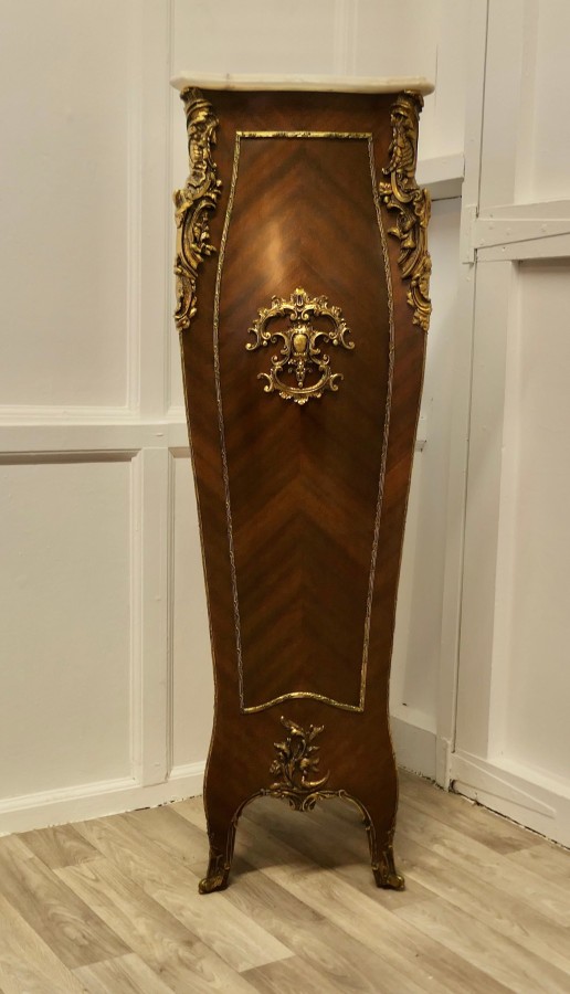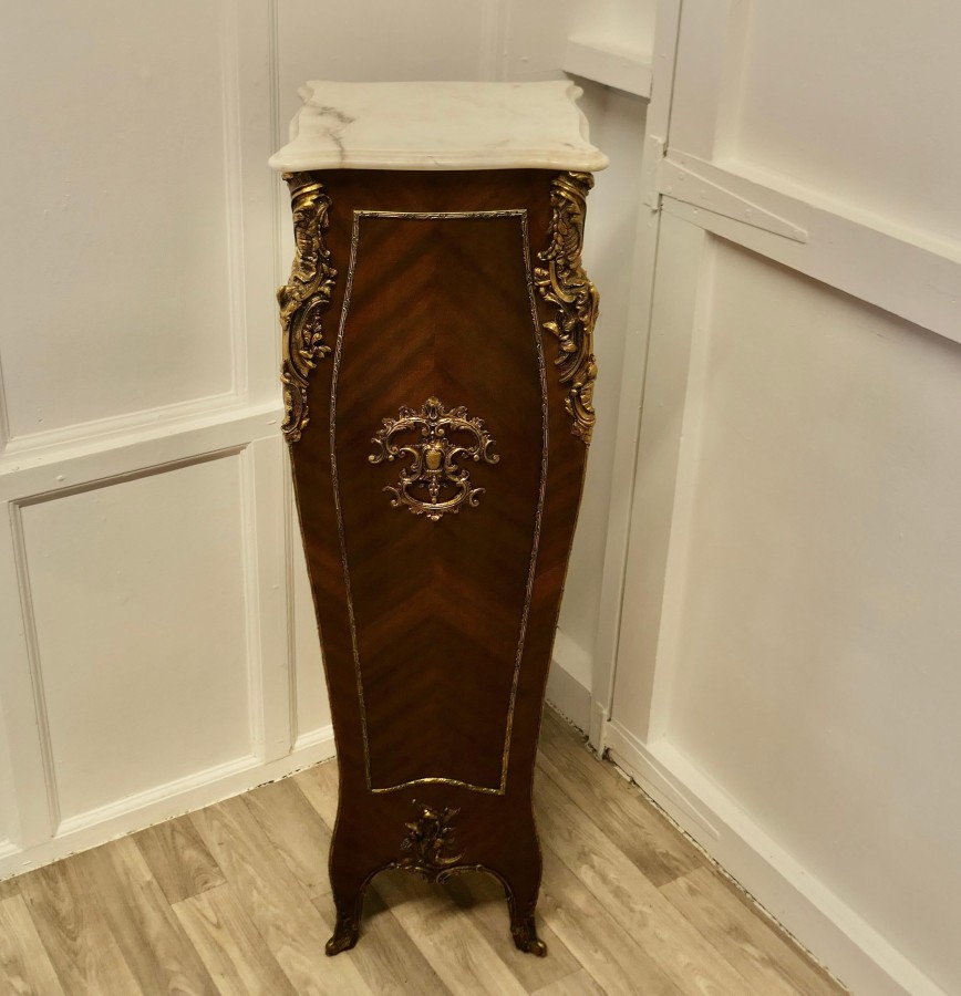 Large French Rococo Walnut and Ormolu Pedestal A Superb Large French Rococo Pedestal, the pedestal has 4 sides all of which are decorated with ormolu scrollwork and it has a shaped marble top The Stand is 50” high and 16” square at floor level NG76 Manufacture Date : 19th Century Materials : Walnut