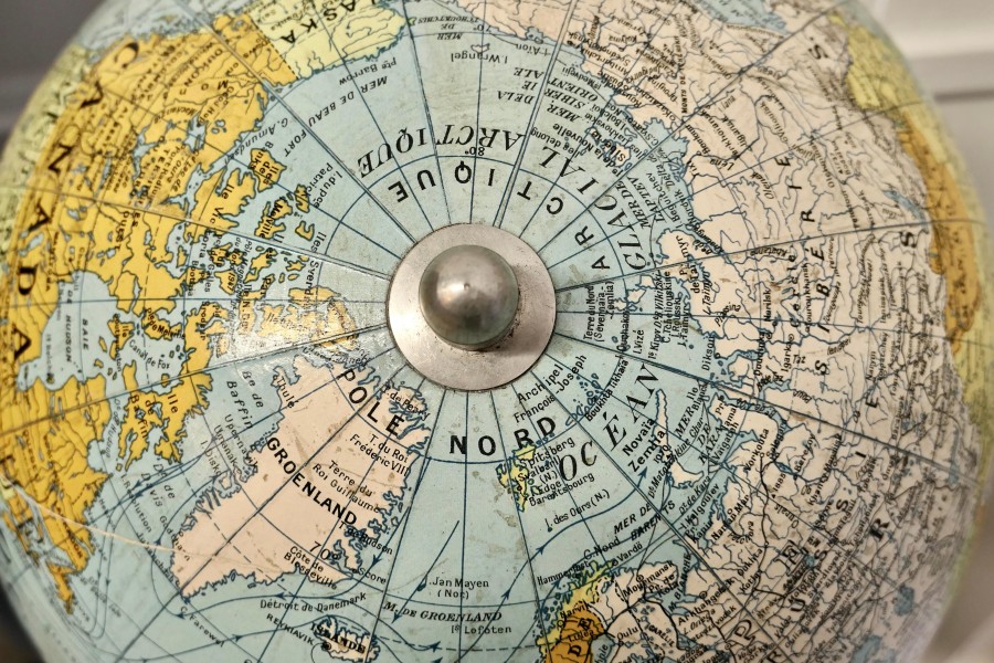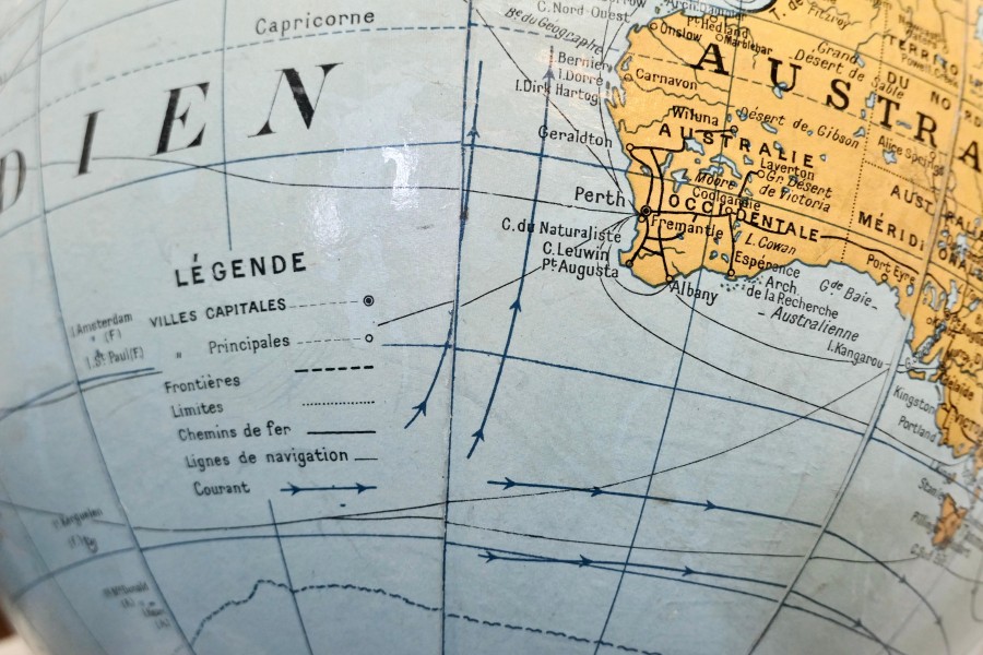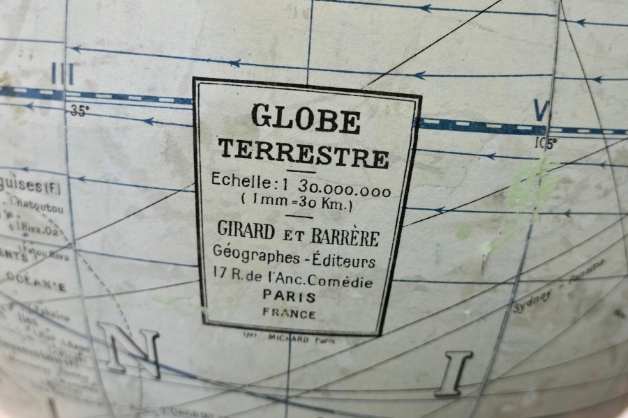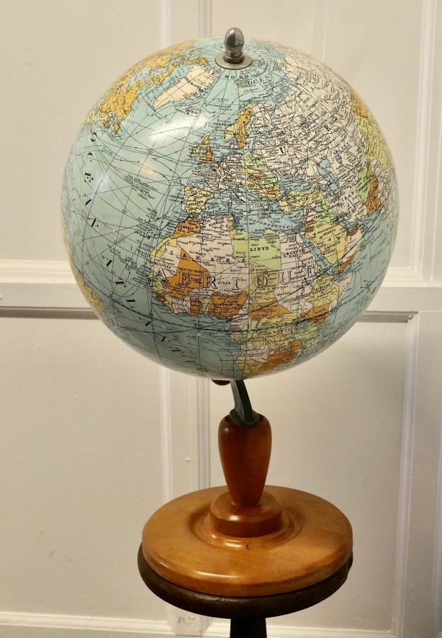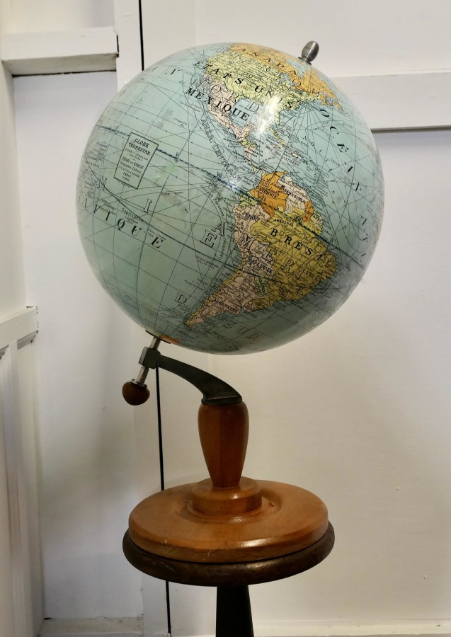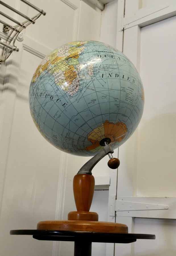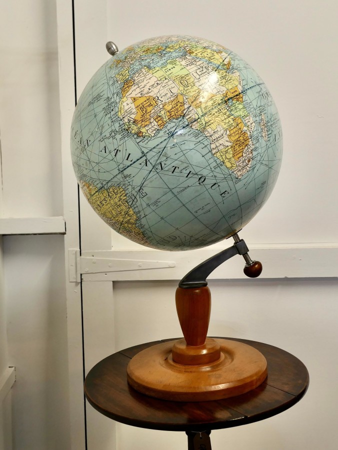 A large French terrestrial globe or world atlas by Girard et Barrère. This is a very large stylish French terrestrial globe from the 1930s by Girard et Barrère it has territorial maps, oceanic currents and commercial routes. This is a Papier Maché sphere on a turned Golden Beech base it is large and in Good Condition, it stands 30” high on its base and the diameter of the Globe it self is 20” GF49 Manufacture Date : 1930 Materials : Beech