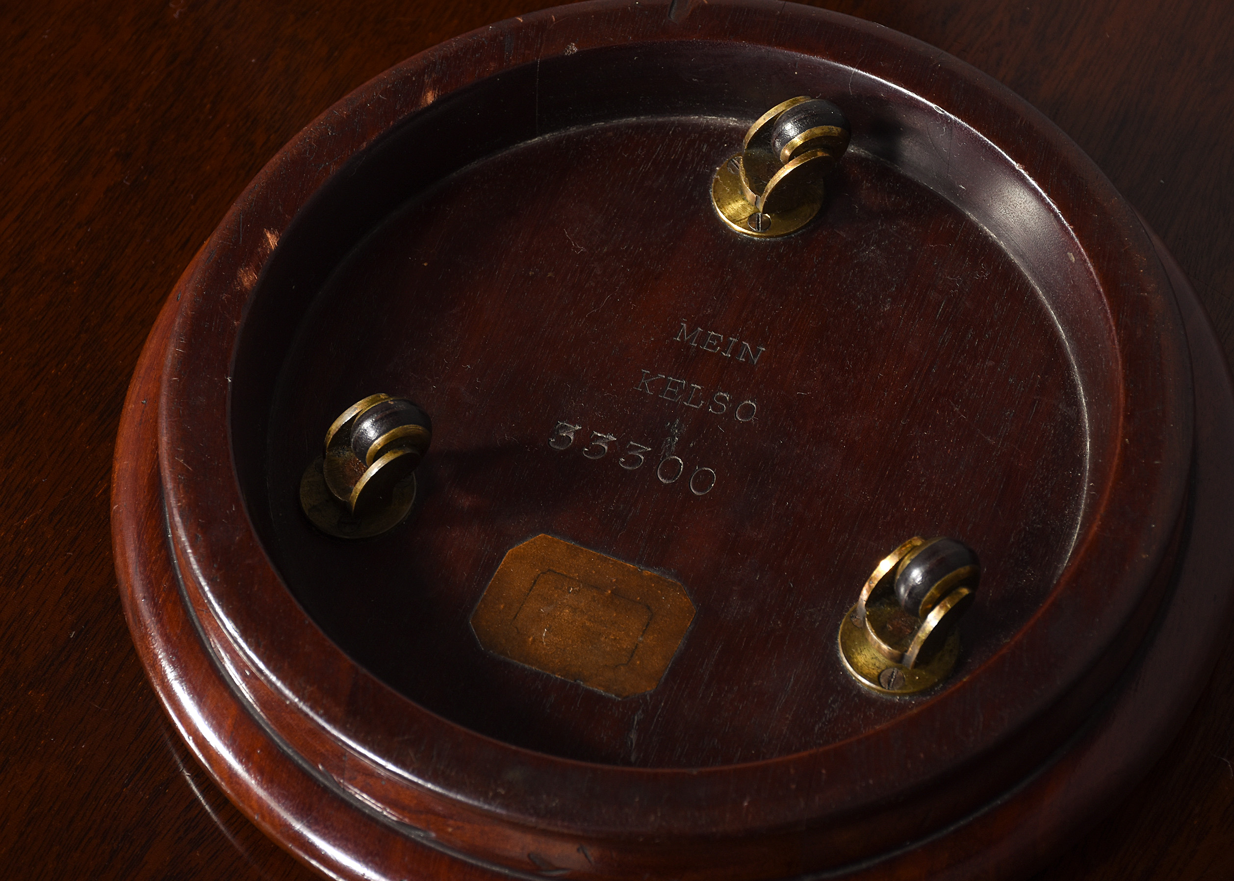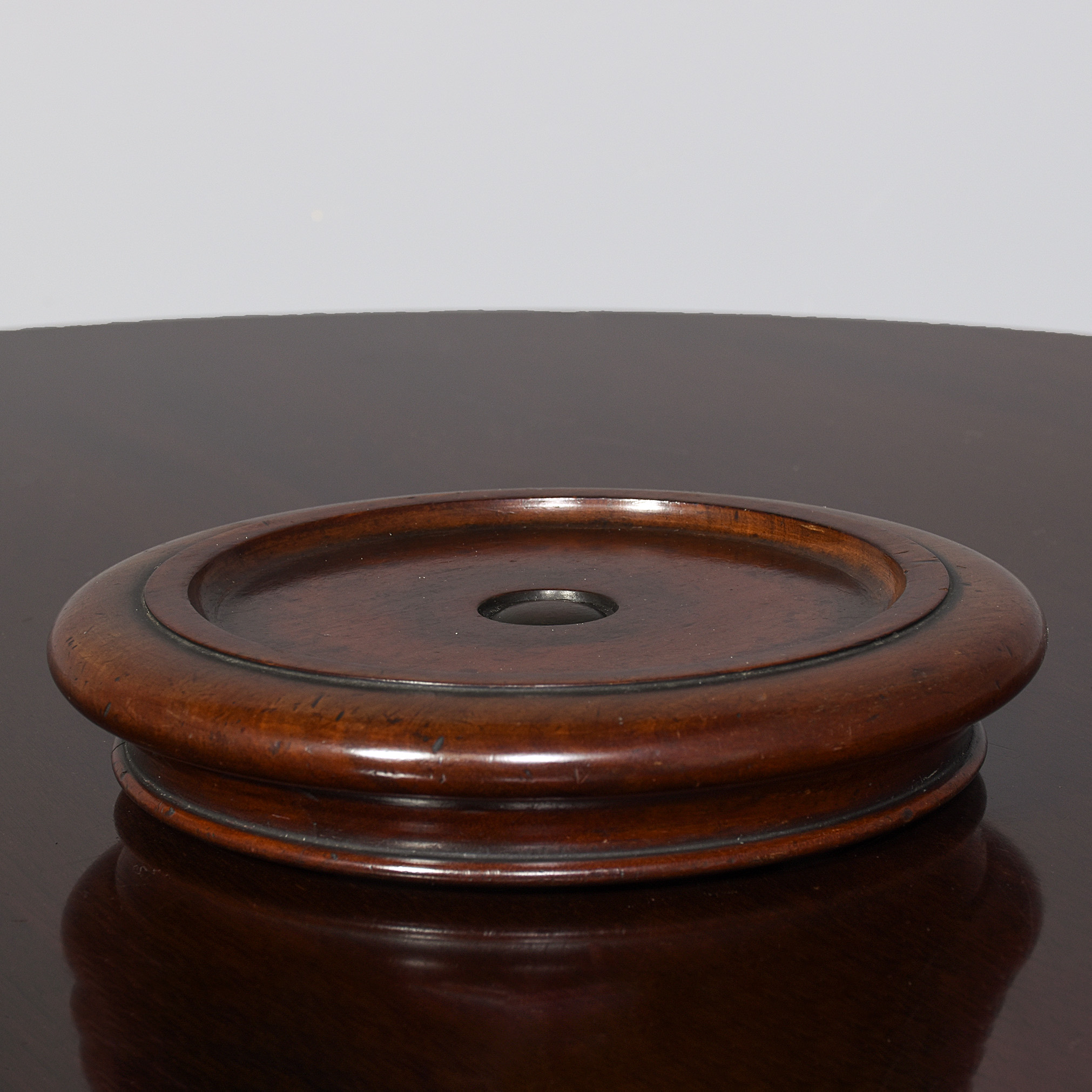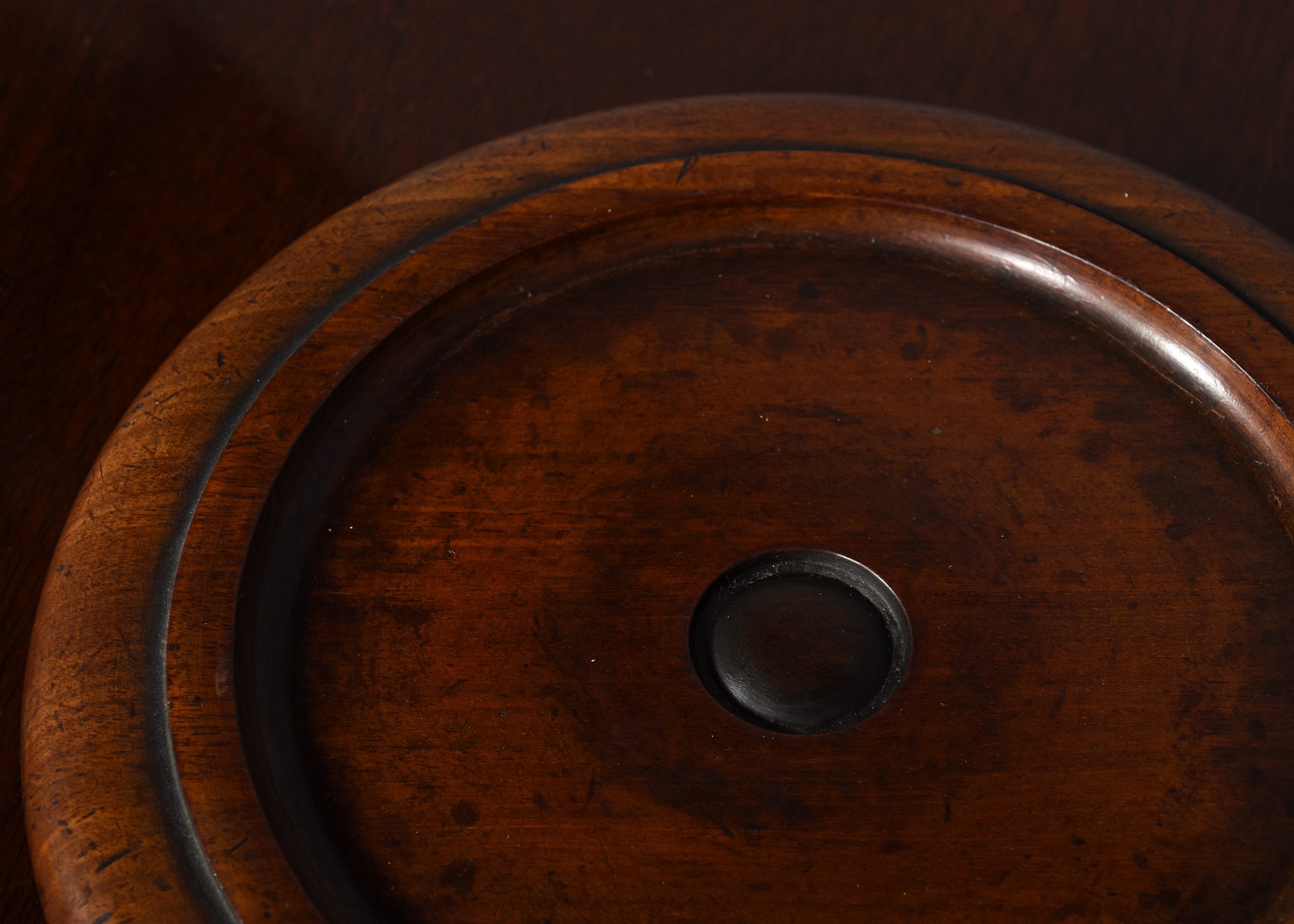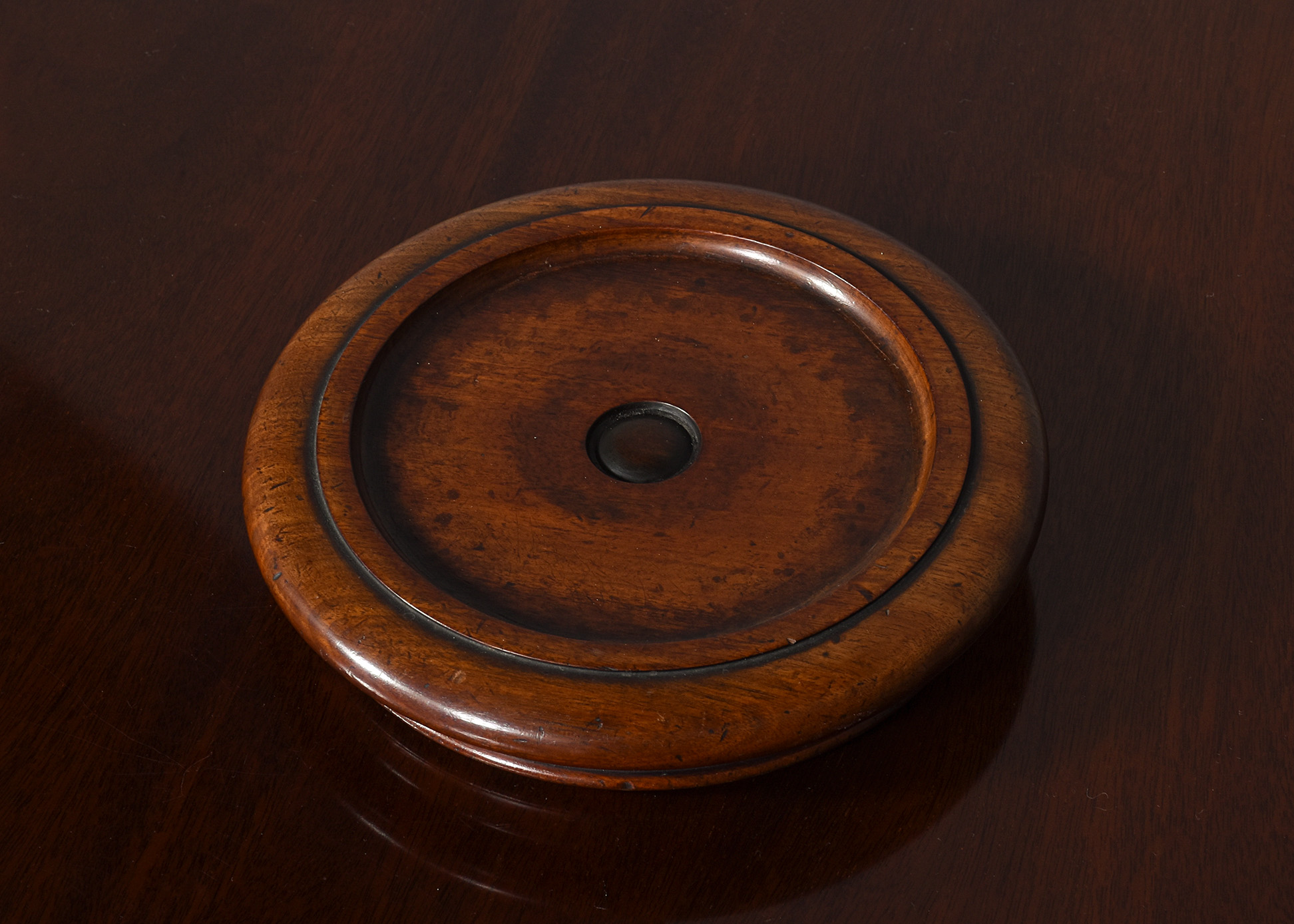 Circa 1820. A large circular wine coaster by ‘James Mein of Kelso’, the circular dish top with a small circular raised section in the center and a broad fore edge with rim beneath, the underside with three original brass and leather castors, the name ‘Mein Kelso ‘and number 3300 stamped into the wood with the faded ‘James Mein of Kelso’ label with canted corners. James Mein, Kelso 1784 – 1830. One of his major commissions included supplying furniture to Floors Castle, home to the Duke of Roxburgh.