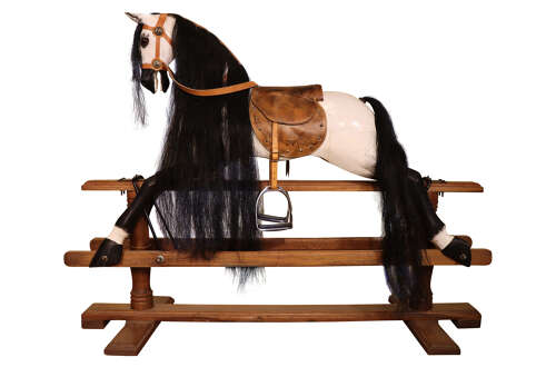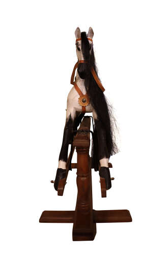 A striking and beautifully crafted mid-20th century rocking horse, painted in a dapple grey finish with black mane, tail, and lower legs. This charming example features a traditional safety stand made from solid wood with turned uprights and stretchers, allowing for smooth and secure rocking motion.