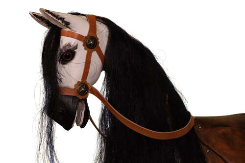 The horse is fitted with a tan leather saddle, stirrups, bridle, and decorative rosettes, all in very good used condition. Glass eyes and carved facial details give it a lifelike expression, while the real horsehair mane and tail add to its classic appeal. A wonderful piece for a child’s room or as a nostalgic decorative addition to a traditional interior.